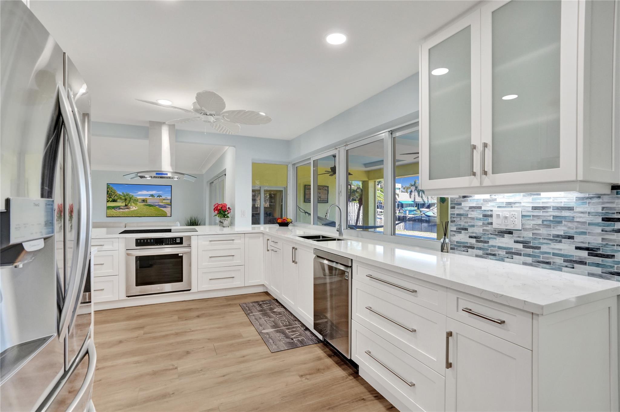 Situated on a quiet cul-de-sac, beautiful & fully updated, deep-water residence is just seconds to the Intracoastal offering easy ocean access w/no fixed bridges. This thoughtfully designed home provides both elegance and functionality, making it feel more spacious than the square footage suggests. Most rooms seamlessly open to the most amazing waterside lanai w/built-in BBQ grill, & motorized screens to enjoy the gentle ocean breeze year-round, this incredible outdoor space is the perfect spot to unwind & enjoy the South Florida lifestyle. Large chef’s kitchen w/ sleek quartz counters, & premium stainless LG appliances. The adjoining “bonus” area is ideal for a home office or cozy den. Impact glass, wood-like, wide plank "LVP" flooring flows throughout the home, adding warmth and style.