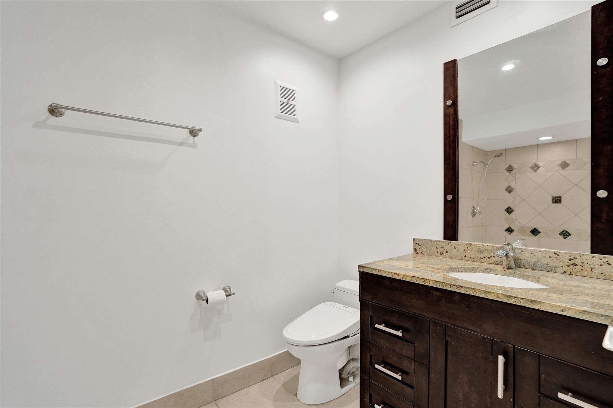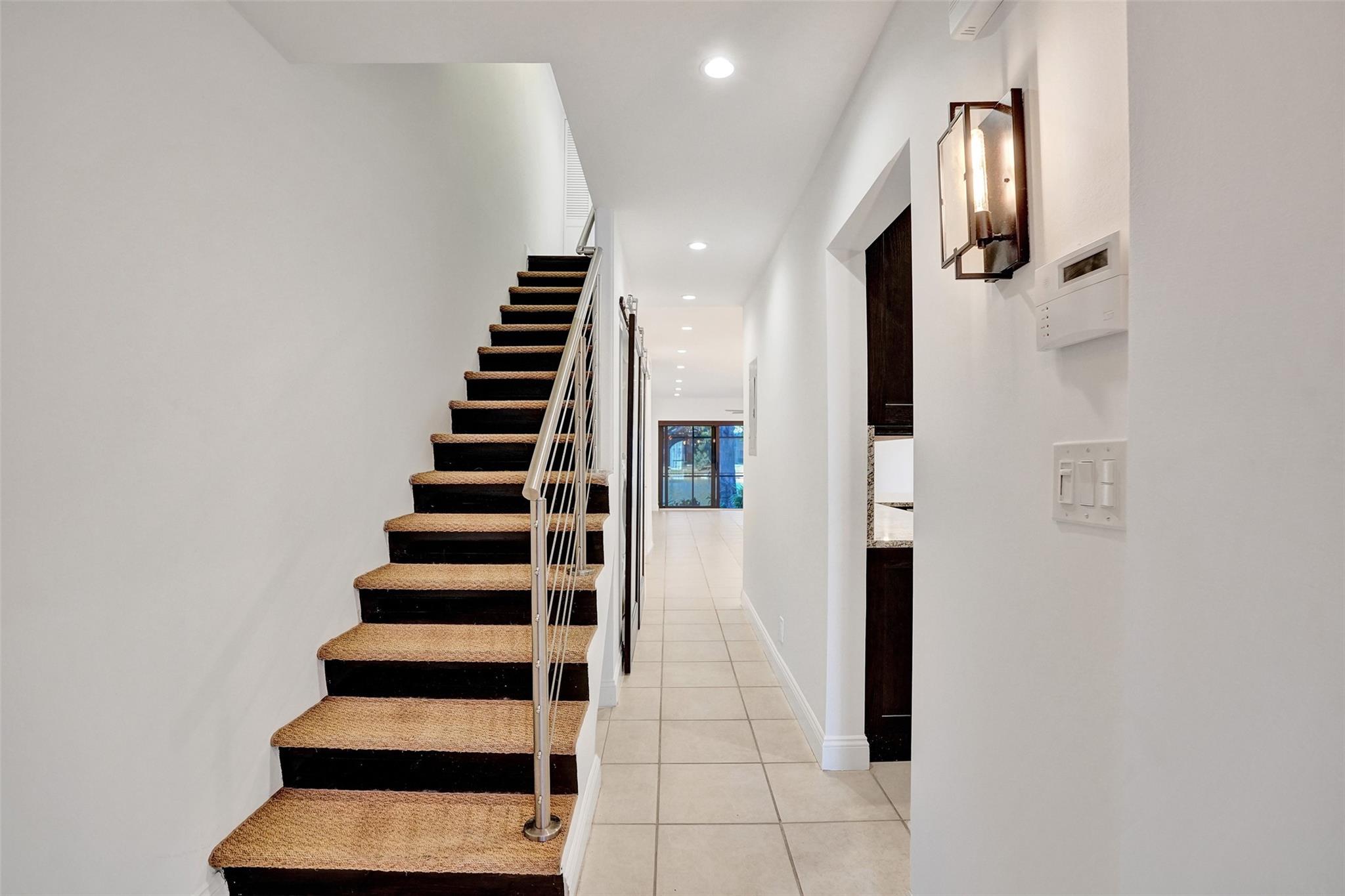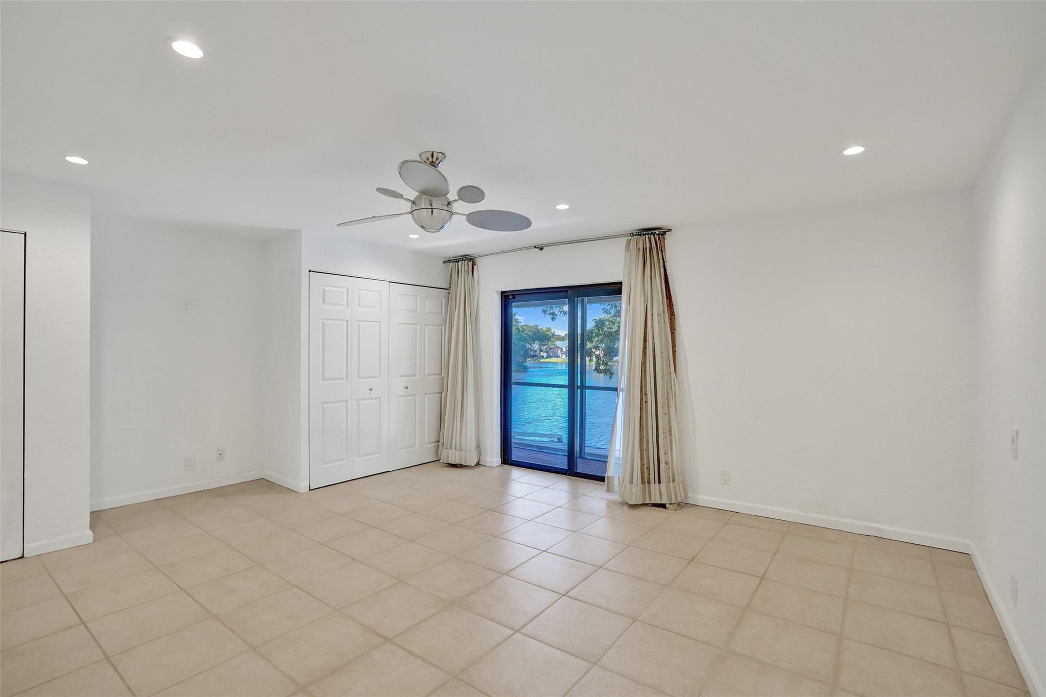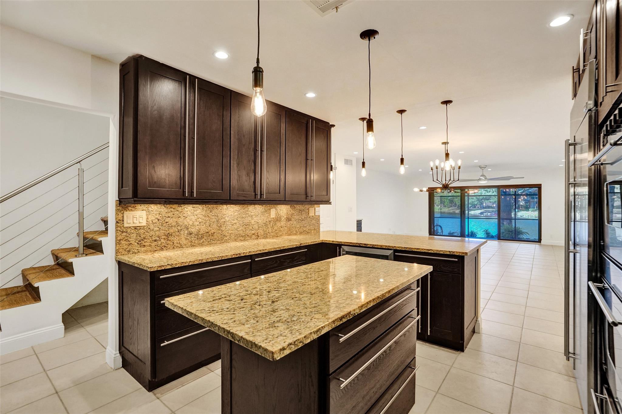 Foyer entry leads into a spectacular remodeled kitchen featuring beautiful Thomasville cabinets, granite counters and backsplash. Upgraded stove with double ovens and a warmer. Beautiful range hood, oversize stainless steel GE Monogram refrigerator, microwave conveniently located at the corner of the kitchen. Center island for your prep work. Wine cooler built in, lots of light and all open to the spacious family living area. Downstairs bedroom. Large tile throughout. Living area w/sunscreen window covers for energy efficiency. Screened patio with beautiful lake view. Upstairs are 2 bedrooms w/remodeled bathrooms. Another screened patio and roof deck. Washer/dryer. Thick impact windows and doors throughout. Two car parking space with guest parking close to the unit.