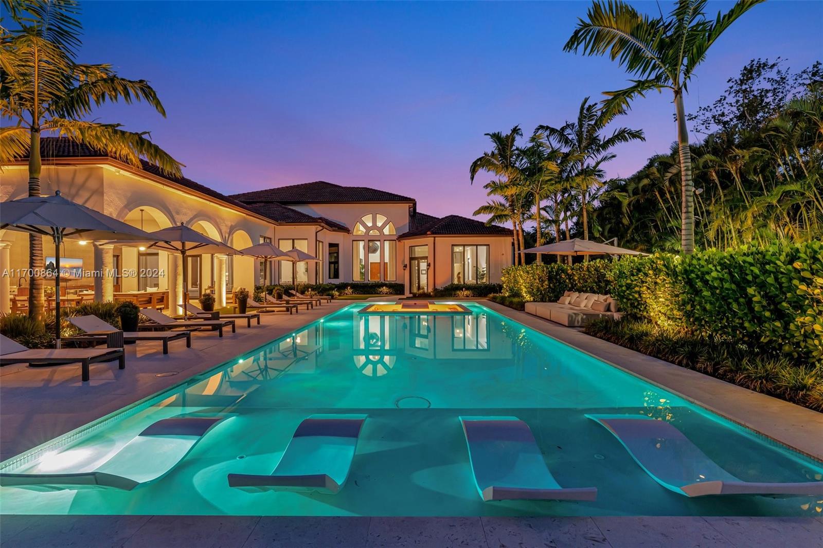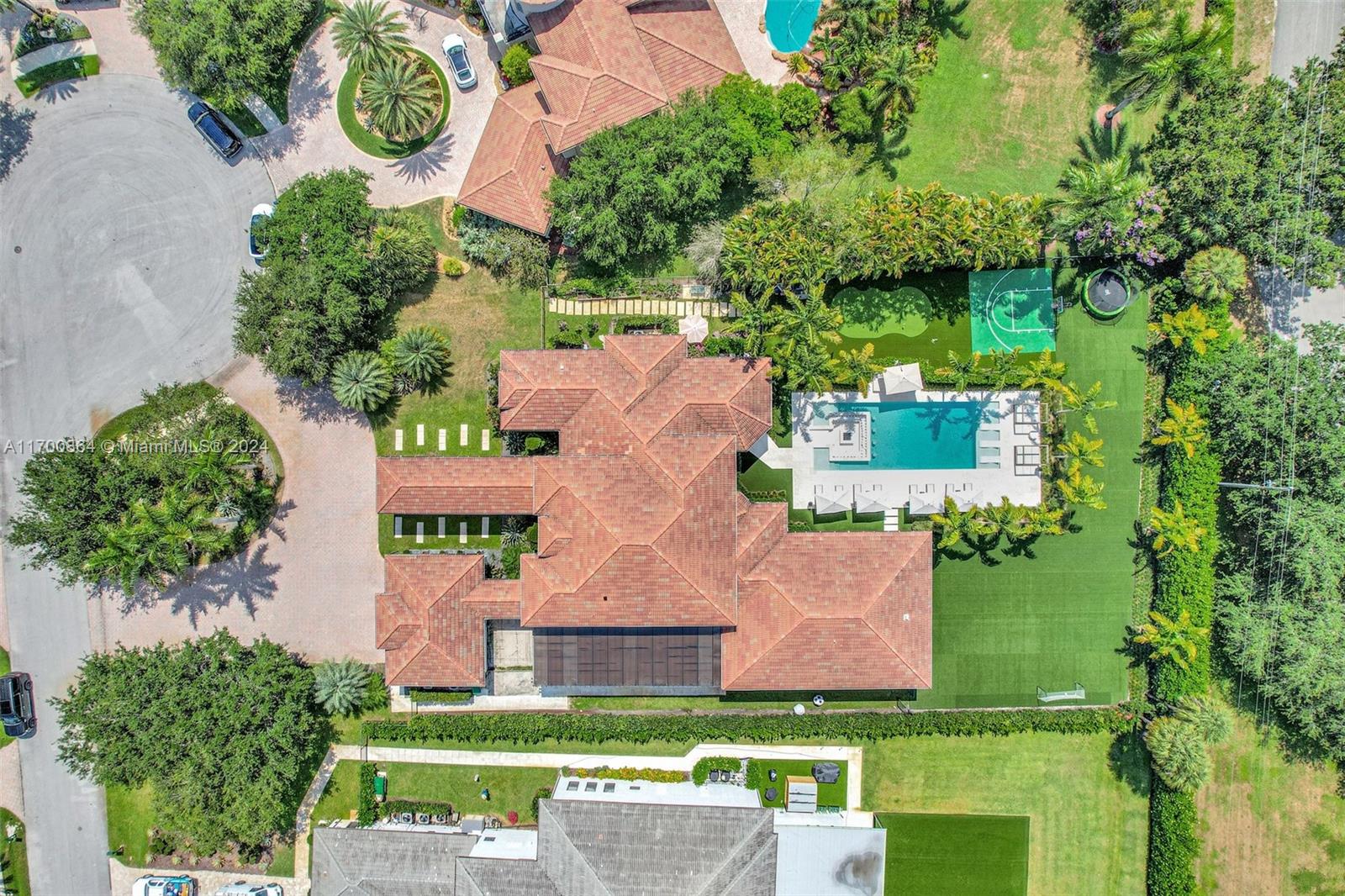 This show stopping 5 Bed, 6.5 bath home designed with attention to detail is nestled in the prestigious gated community of Stonebrook Estates. Grand entrance with high 25' ceilings & bright floor to ceiling windows. Some highlights include a luxurious master suite, custom bar, cozy theater and a built in wine cellar, surround system, impact windows/doors throughout, gourmet kitchen featuring gorgeous veined countertops, gas stove, custom cabinetry, top-of-the-line Dacor/Miele appliances & walk in pantry. The Resort-like backyard is every entertainer's dream featuring a 20'x60' heated pool w/ an inviting sunken fir pit & in-pool lounge chairs, a covered terrace w/ kitchen & living, green area for outdoor activates & even a basketball court! 3 car garage & oversized driveway.