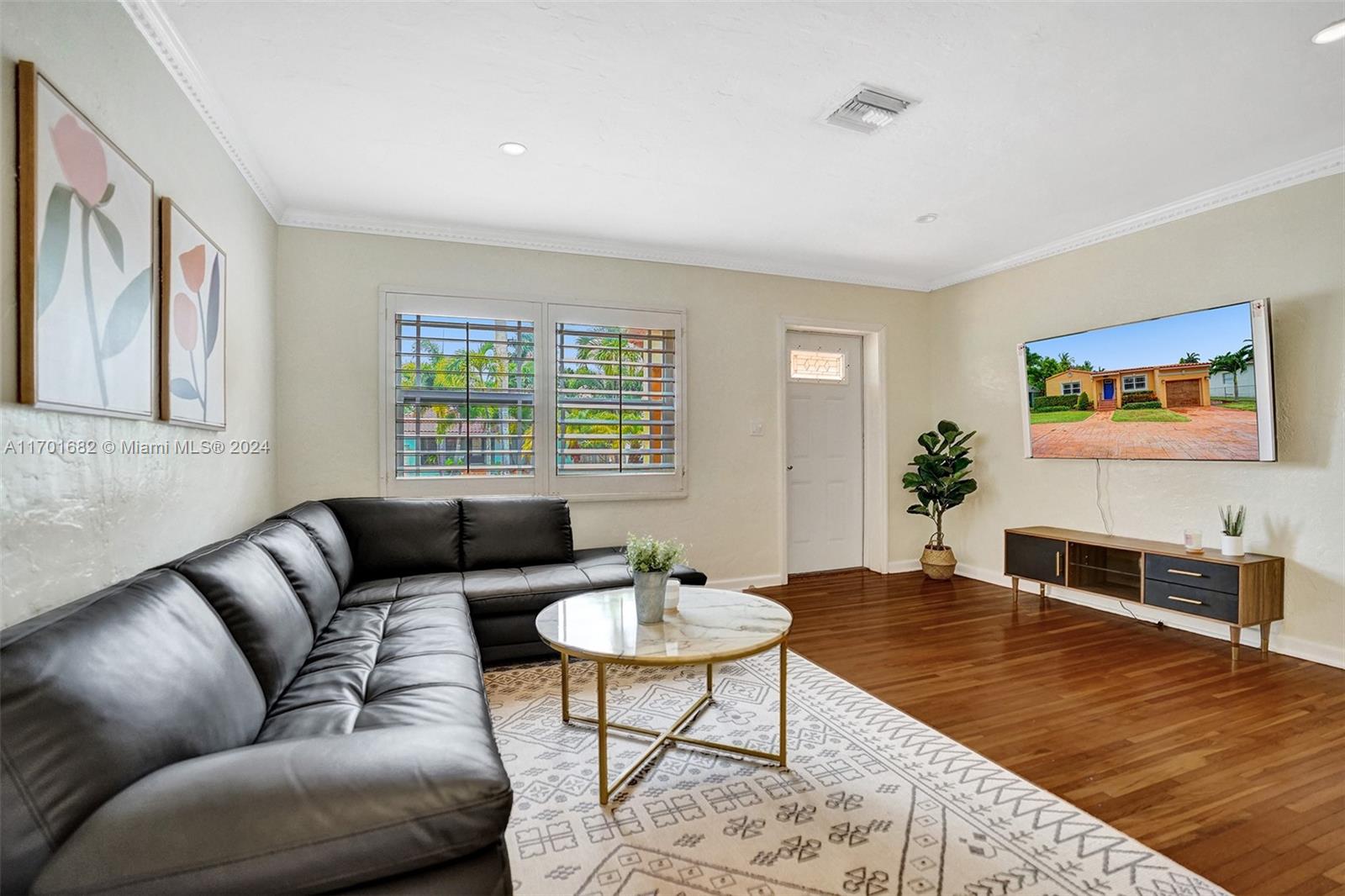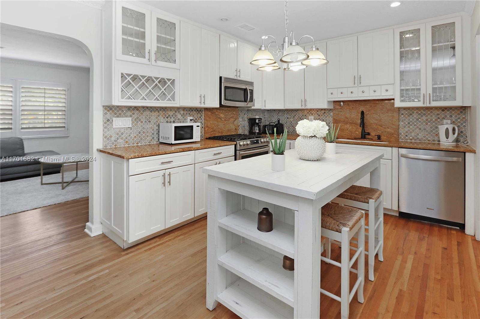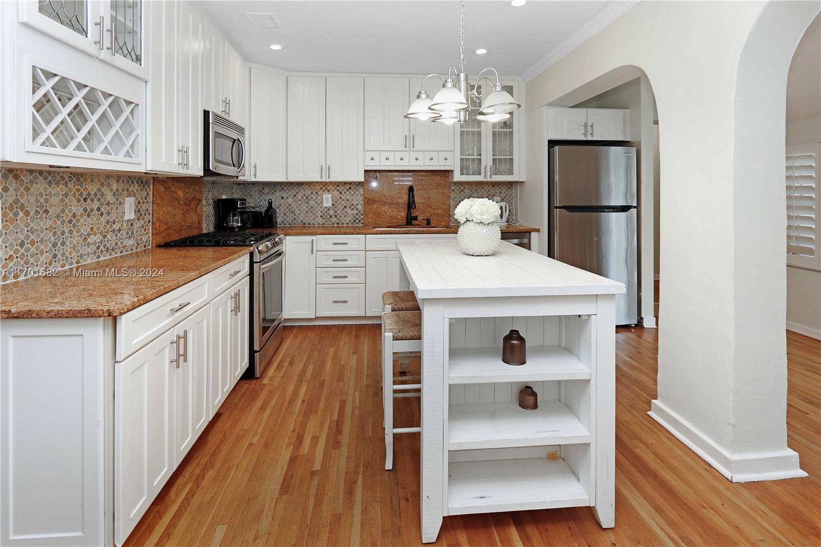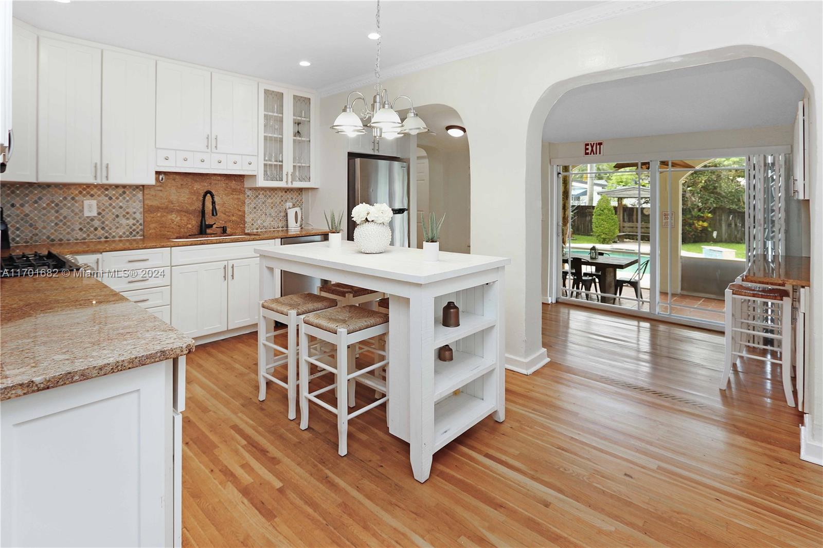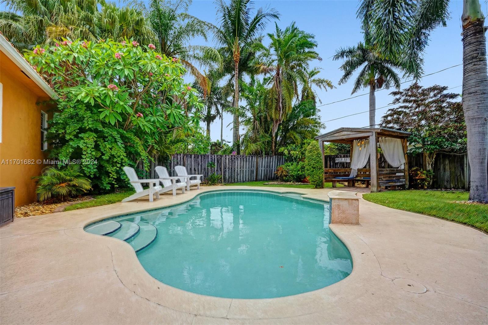 This spacious, 3-bed, 2-bath home offers a split floor plan and a one-car garage. Enjoy a heated pool, impact windows, and a stylish kitchen featuring S/S appliances, a mosaic tile backsplash, and granite countertops. Original crown molding adds charm to the living, dining, and kitchen areas, while the main bedroom includes a large walk-in closet with custom shelving. The primary bath features a porcelain-tiled shower with a mosaic accent and a glass door. Unwind in the Florida room or under the covered patio with elegant arches, ideal for entertaining. Additional highlights include a gazebo, circular driveway, tankless gas water heater, and plantation shutters in select bedrooms. One bathroom includes a shower/tub combo. Located Just minutes from beaches, downtown, golf, and more.