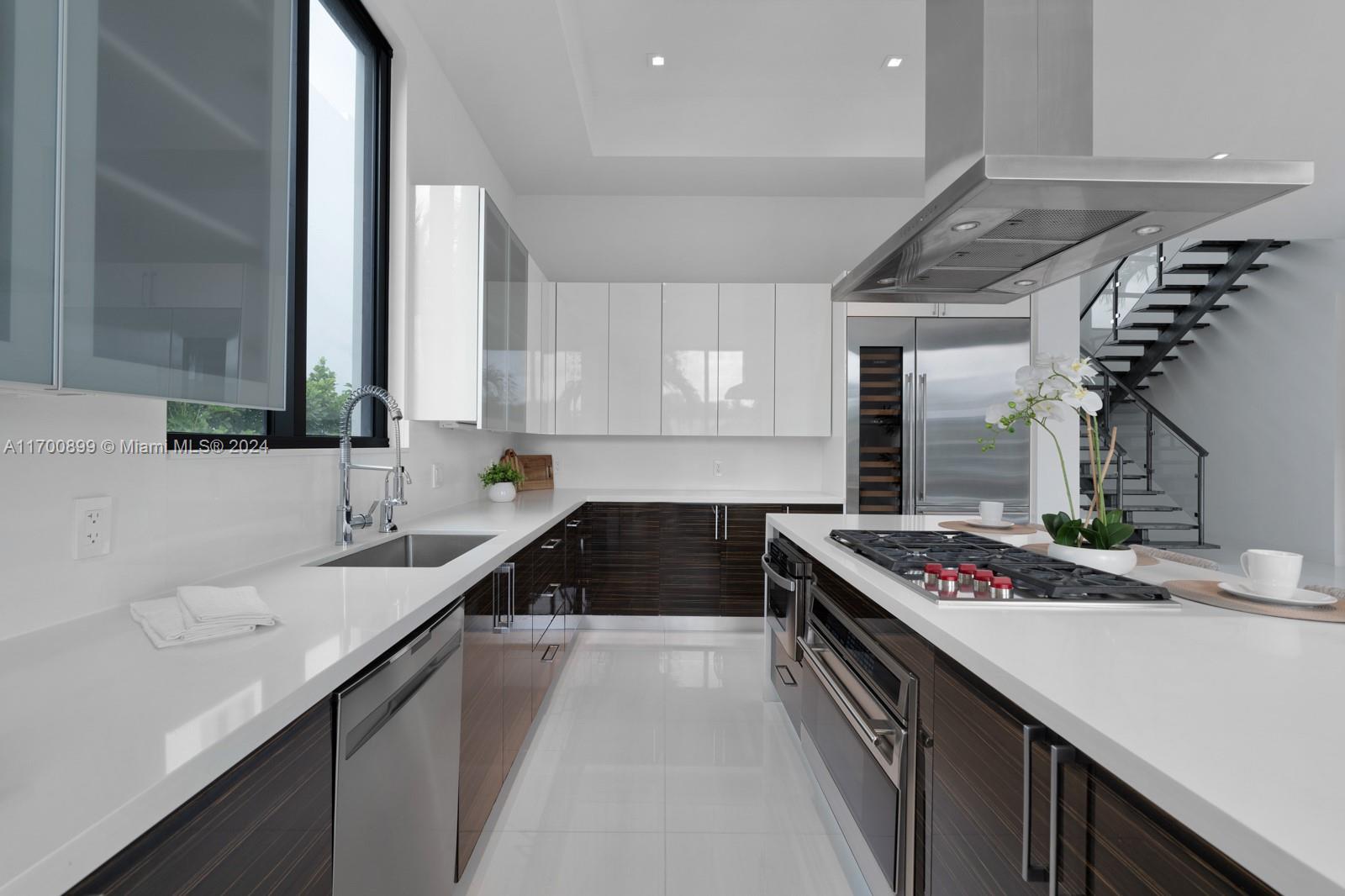 Introducing this stunning two-story waterfront home in the exclusive, guard-gated San Souci Estates. Built in 2016, this 4,800+ SQFT luxury residence boasts 12+ ft high ceilings, an open floor plan, grand entrance w/ double height ceilings, 6 bedrooms, a den/office, and 7 bathrooms. Enjoy 75+ ft of WF with direct bay/ocean access, no fixed bridges, a saltwater pool, jacuzzi, private dock, and boat lift. The chef’s kitchen features a Wolf gas cooktop, Sub-Zero fridge/wine cooler, ample seating space all w/ breathtaking water views. The expansive master suite offers dual walk-in closets, a large shower with tub, separate sinks, + a private balcony. Park your cars in a two-car garage, 4 car driveway! 24/7 security as well