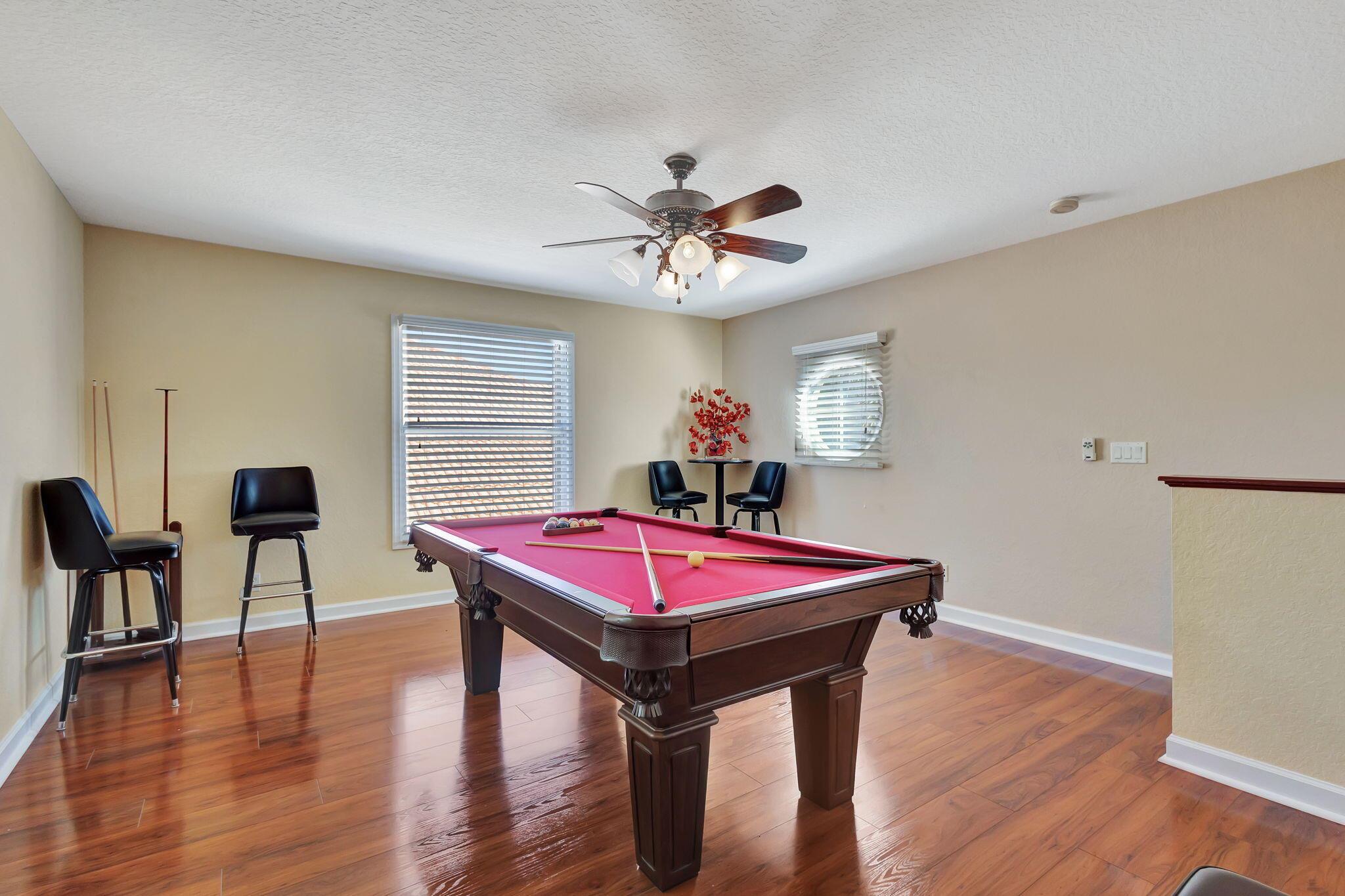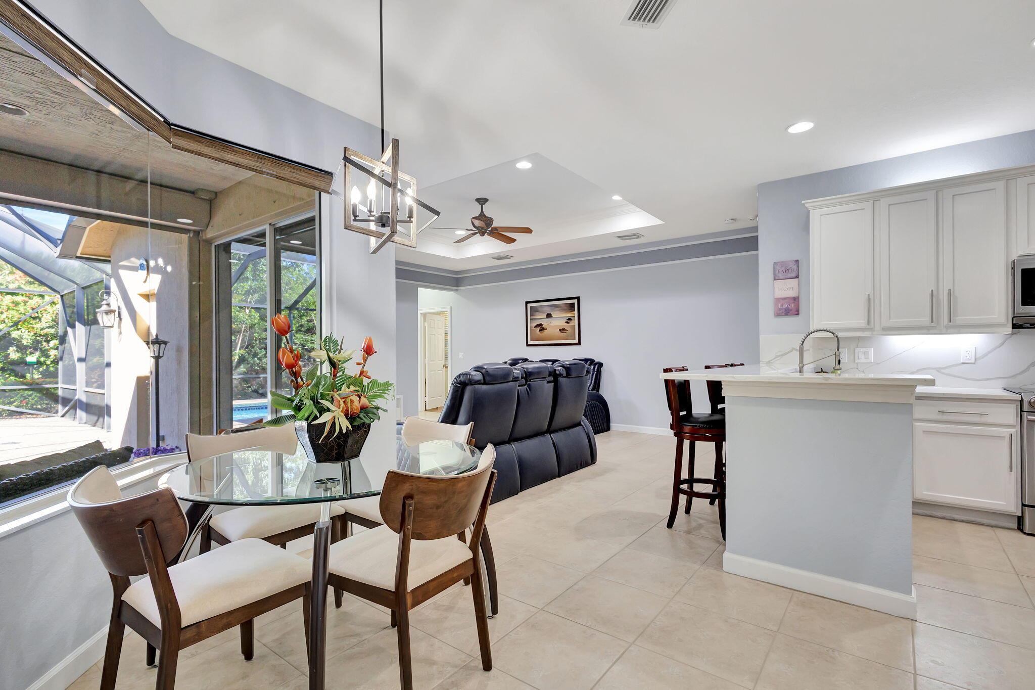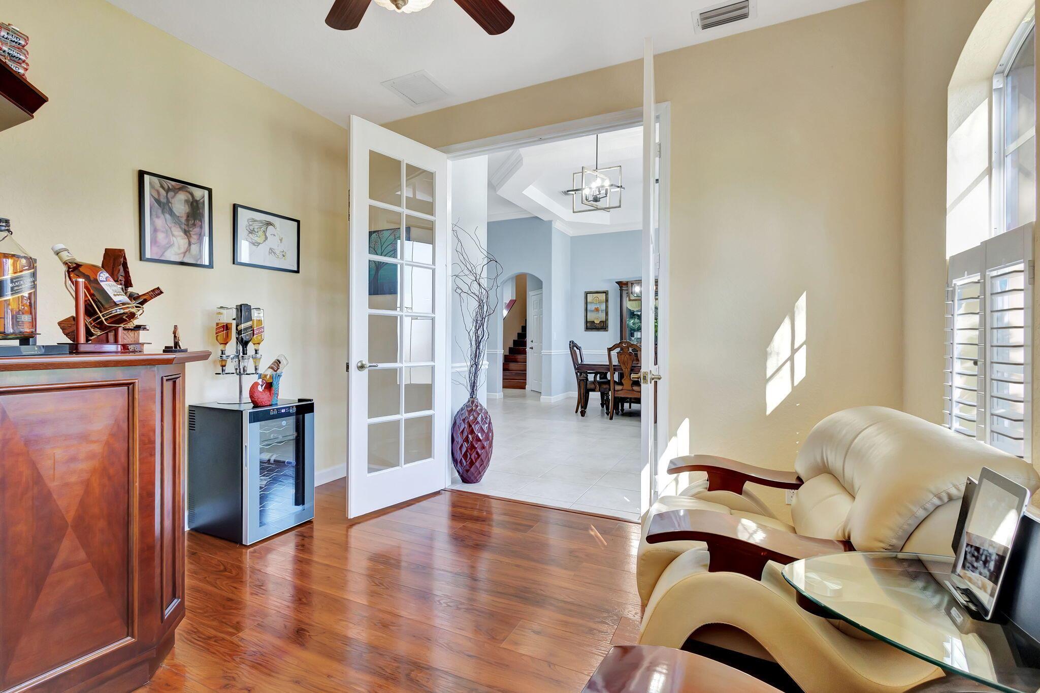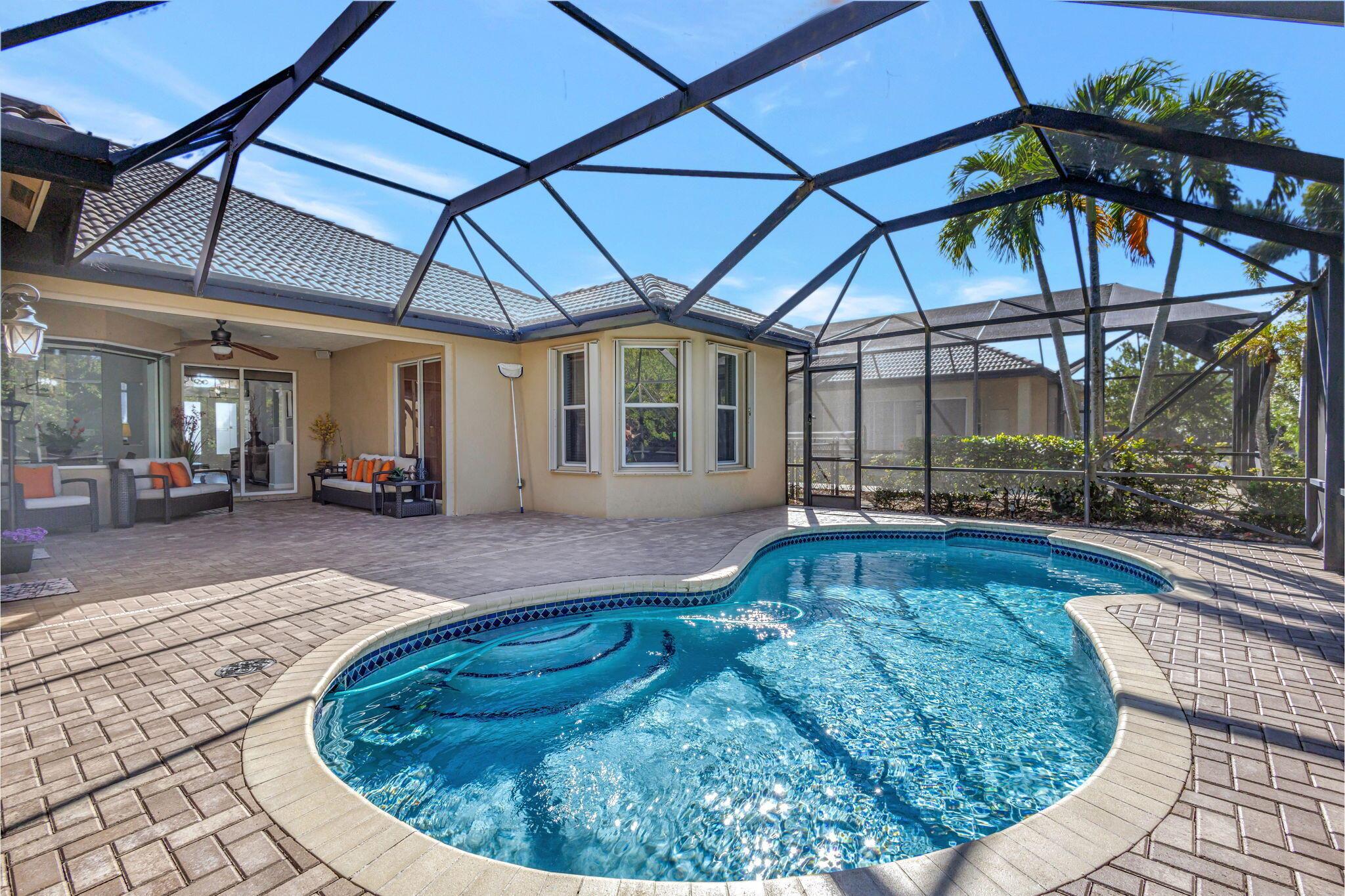 This stunning 5-bedroom, 4-bathroom home plus a den/office is move-in ready and features a primary bedroom and three additional bedrooms on the first floor, with a loft and another bedroom and bathroom upstairs. It boasts a large covered patio, a private heated pool, cabana bath and backs up to a preserve for added privacy. This home includes a newly updated kitchen and bathrooms, a 3-car garage, office nook and ample storage, including a large second-floor storage closet. Additional features include newer water heater, paver patio, accordion shutters, a hurricane-rated front door, and a garage door. The HOA covers alarm service, lawn care, tree maintenance, pool, sauna, tennis, pickleball, playground, and security gate.