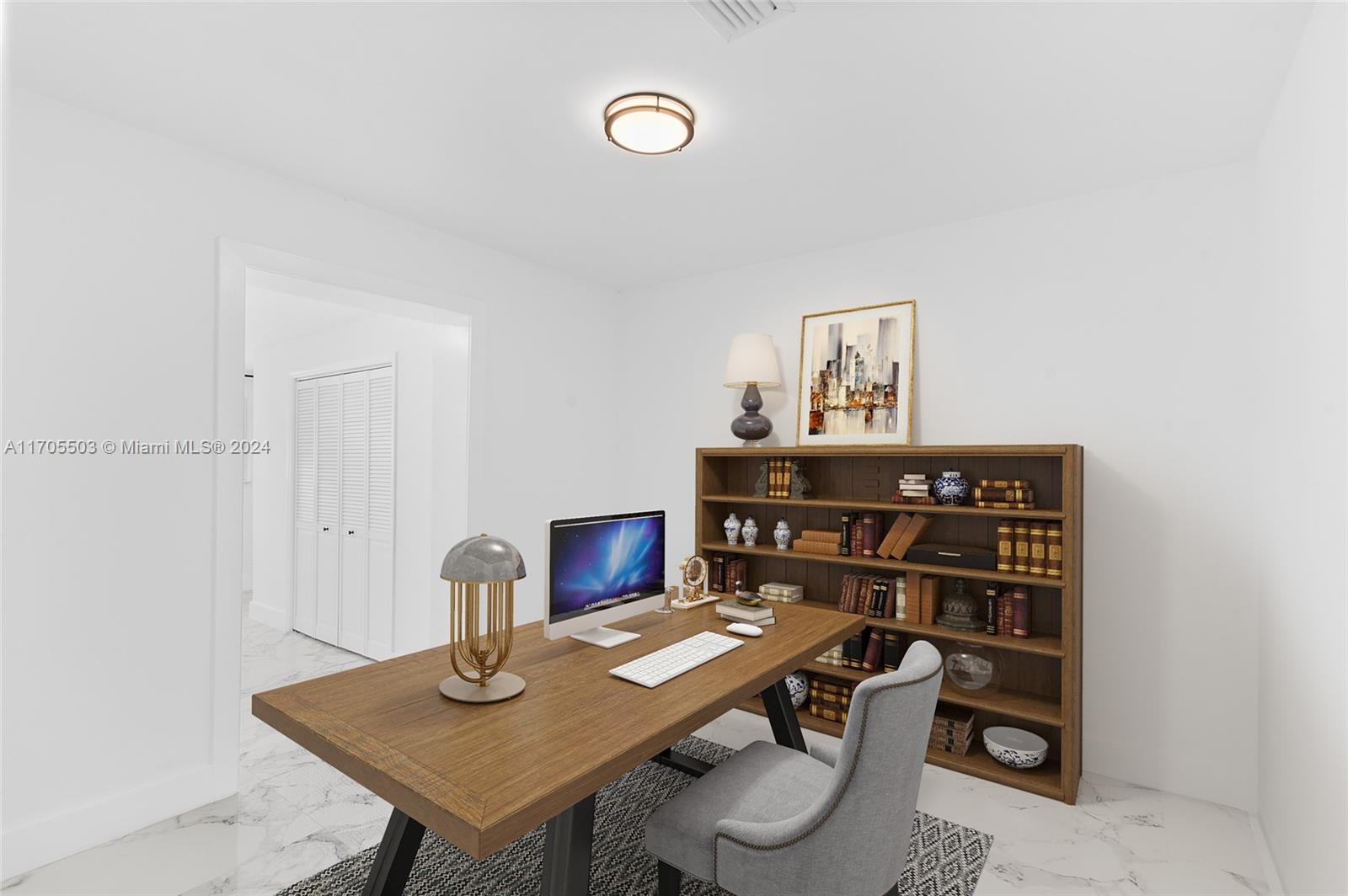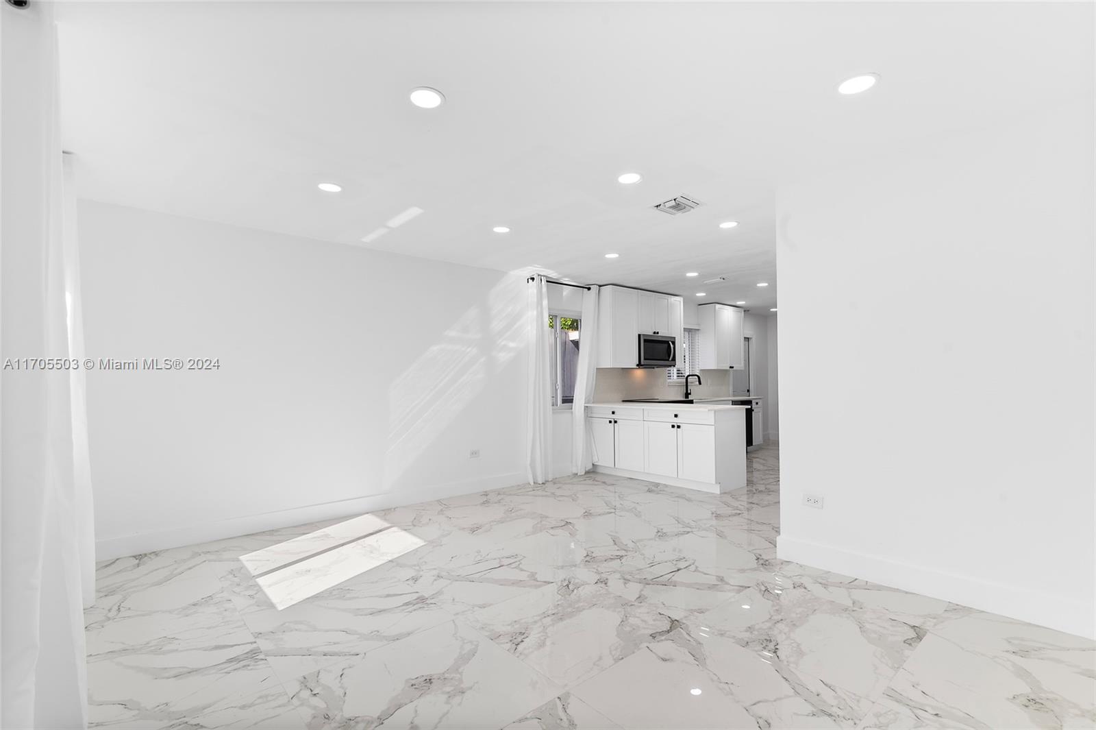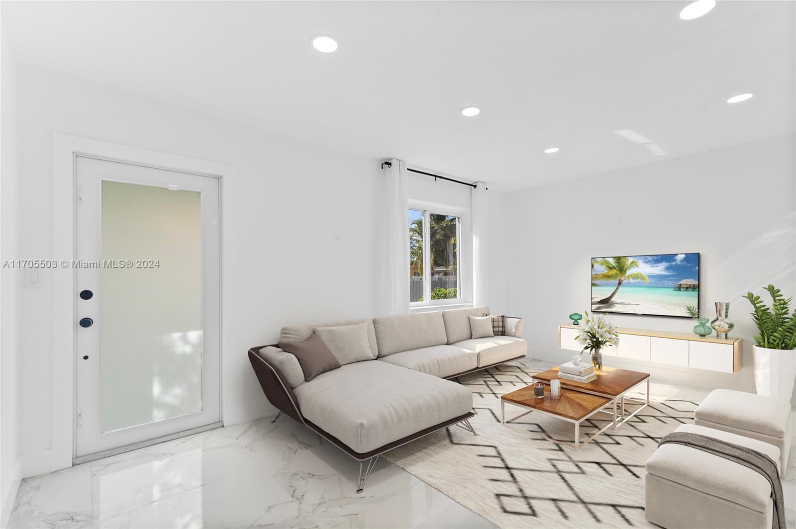 Gorgeous Private Oasis! Mother In-Law Quarters! Four-bedroom-3-bathroom plus bonus room. Opportunity to live almost mortgage free. Airbnb potential also. Tasteful renovation with marble flooring throughout. Open-concept floor plan with massive main bedroom with custom closet plus bonus room for a dressing room or library. Private yard with separate two gates and front and back road access for tenant. Rear laundry for tenant use. Mature fruit trees! This 1,677-sq-ft home has a large 6,750-sq-foot lot. Modern updates include large-format porcelain floors, custom tall-kitchen cabinets and sleek black faucet and hardware. New stainless appliances. Each unit has outdoor space. Modern bathrooms with glass shower doors and luxury black tile. Quick drive to I-95 and turnpike.