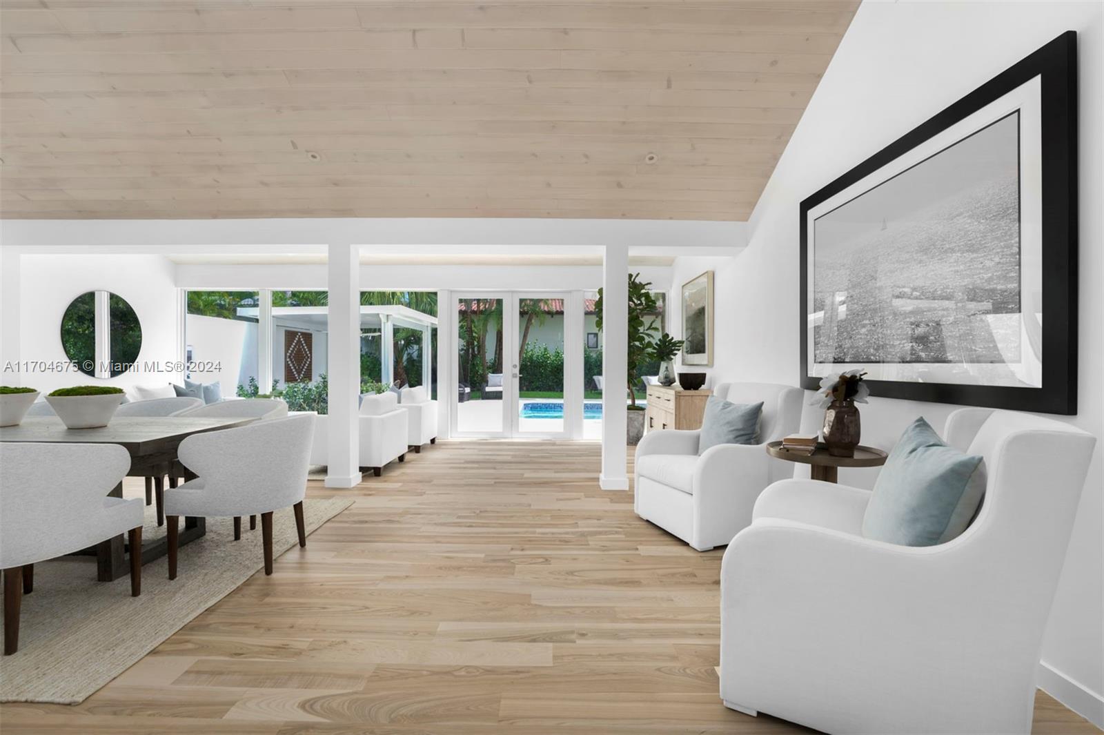 Experience coastal luxury in this fully renovated 4BR/4.5BA home on Sunset Island II. Nestled on a coveted corner lot directly across from a tranquil, palm-lined park, this turnkey residence welcomes you w/ soaring ceilings & sweeping views of the lush backyard, complete w/ an oversized sparkling pool. Natural light floods the home through hurricane-impact glass walls & doors, highlighting the spacious great room w/ a marble-clad fireplace & exposed wood beams that flow through the open floorplan. The custom-designed eat-in kitchen feature marble countertops & high-end Miele and Subzero appliances. The serene primary suite offering a spa-inspired bathroom w/ a large walk-in closet, dual-headed shower, dual sinks, a vanity area & French door that lead to the private pool & backyard paradise