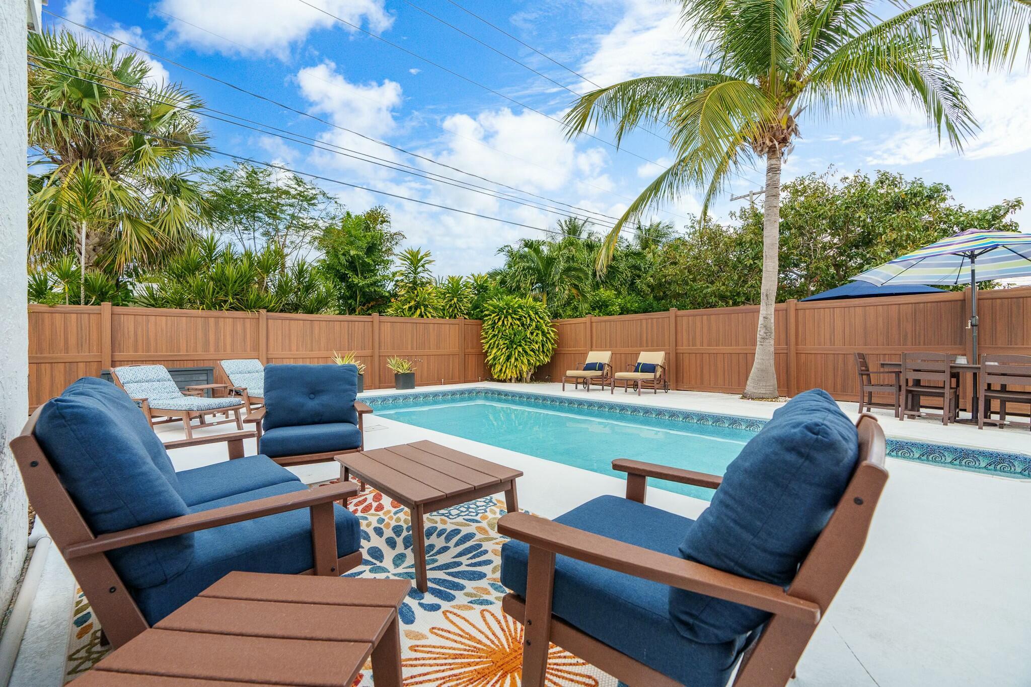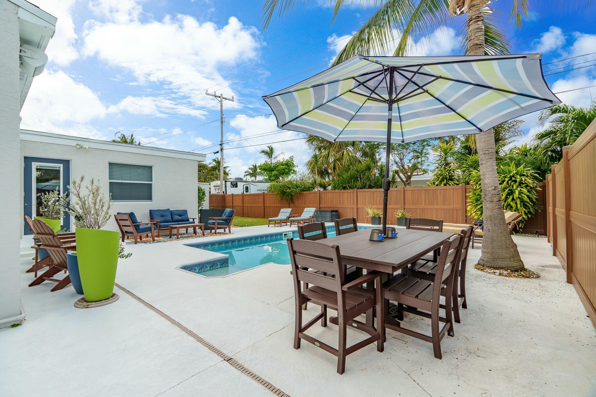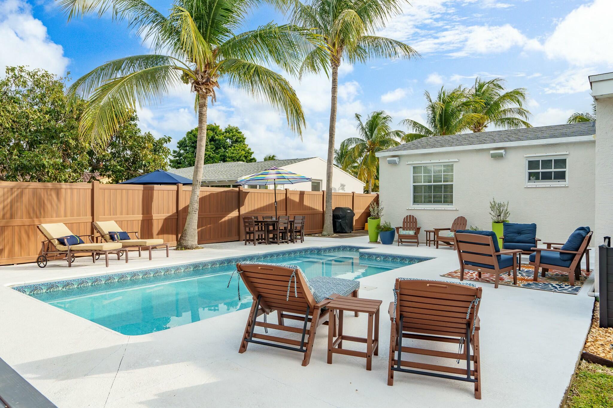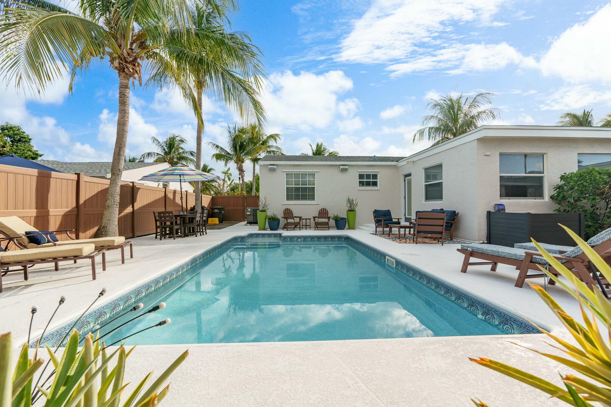 Location, location. Walk into this charming 4-bedroom, 2 bath, saltwater pool home situated only three short blocks from the Intracoastal in SOSO WPB's hottest area. Stunning remodel. High end kitchen, Soapstone countertops and SS appliances, self-closing draws, tankless hot water heater. Remodeled bathrooms. Entire home is light and bright. New features of the home are A New Roof 2024, New AC 2024, New Salt-Water Pool 2024, New Vinyl Flooring 2024, New Lighting throughout home. Nest thermostat. Ring doorbell. New Ceiling fans. New vinyl fencing along with sound system for pool area. New washer /dryer. Recently painted exterior and interior of home. All major items have been taken care of in this home. Two zone central AC. All windows and doors are either impact glass or hurric