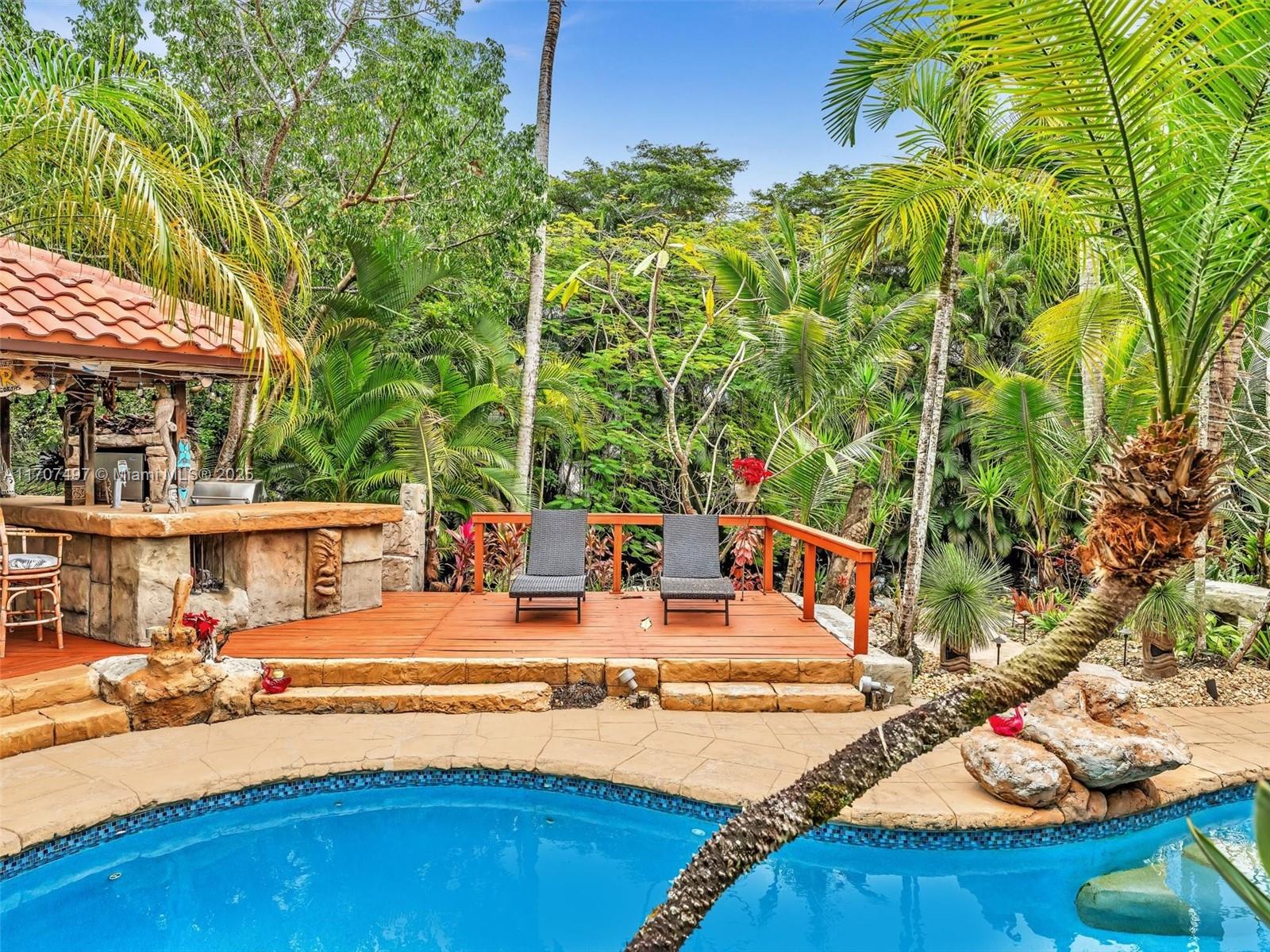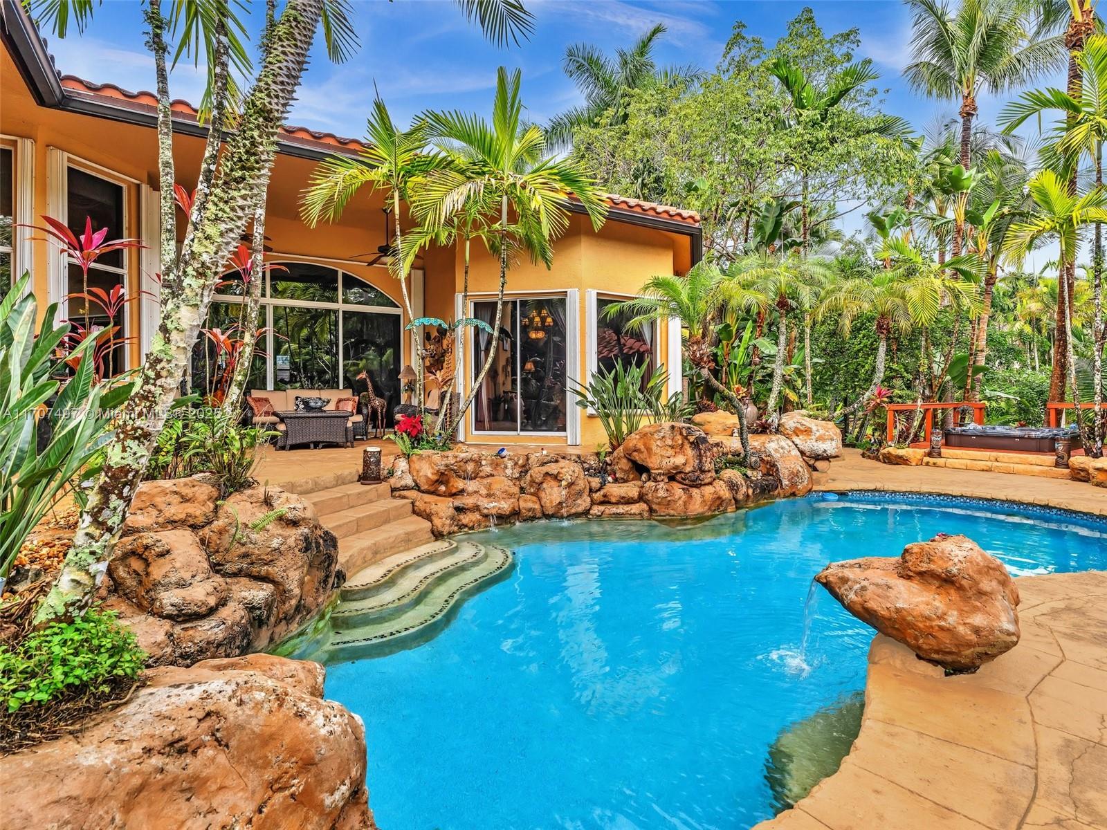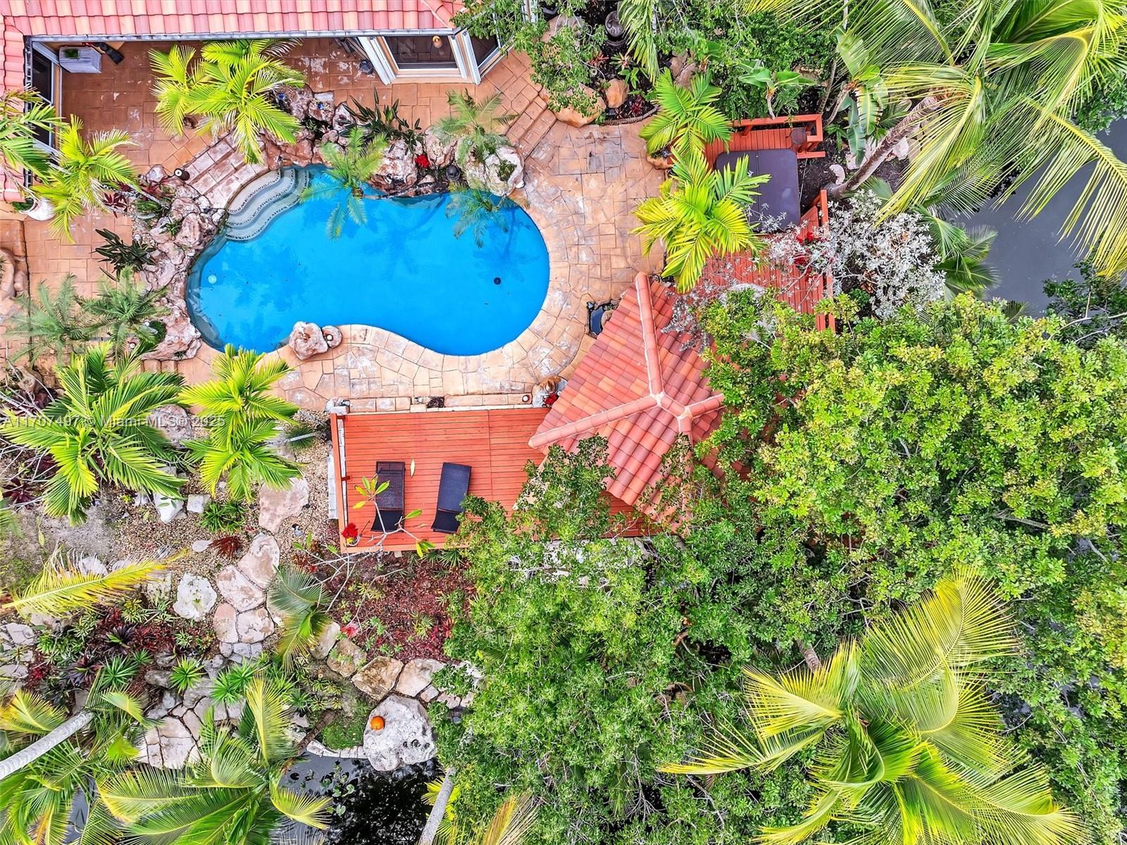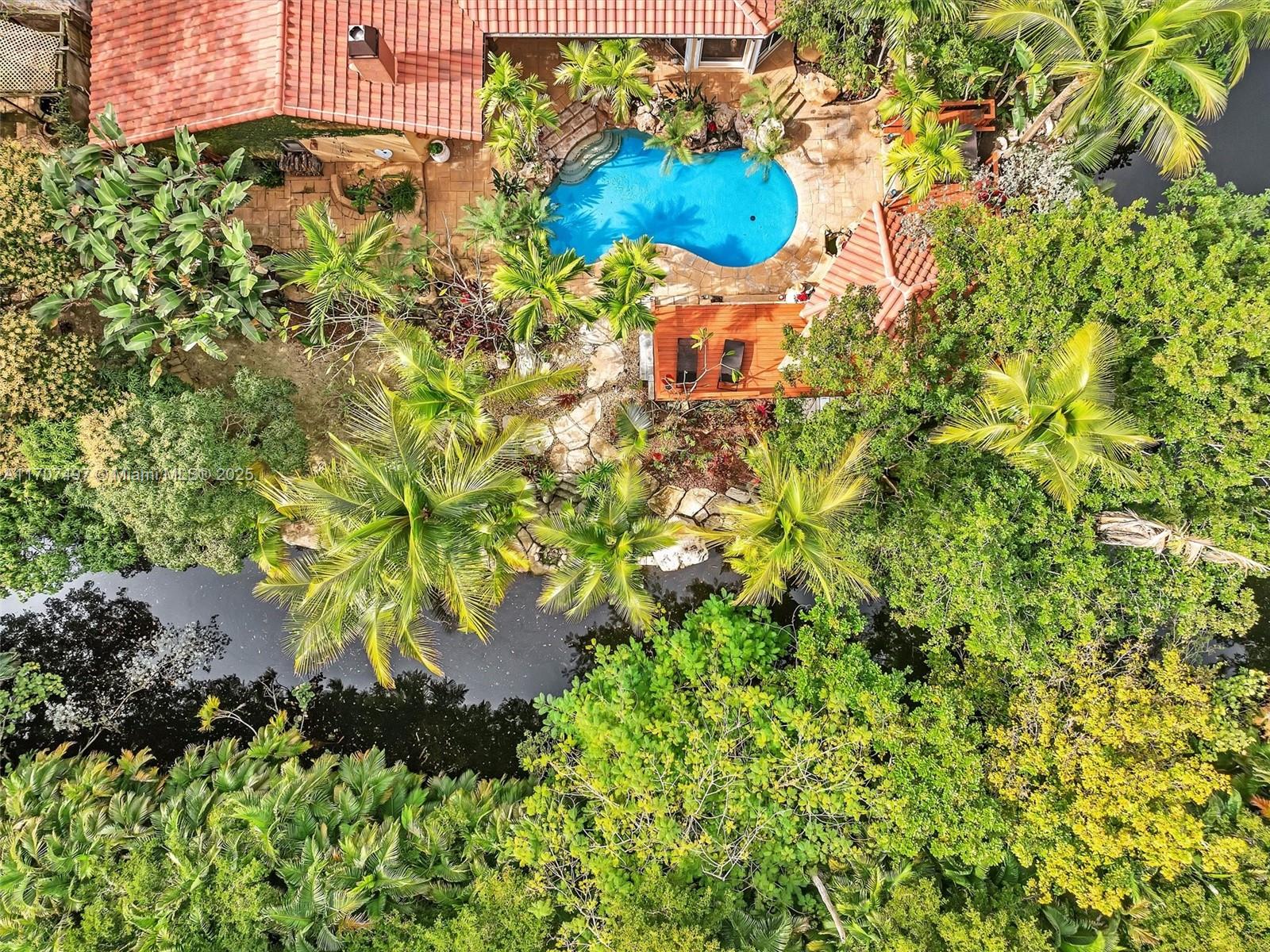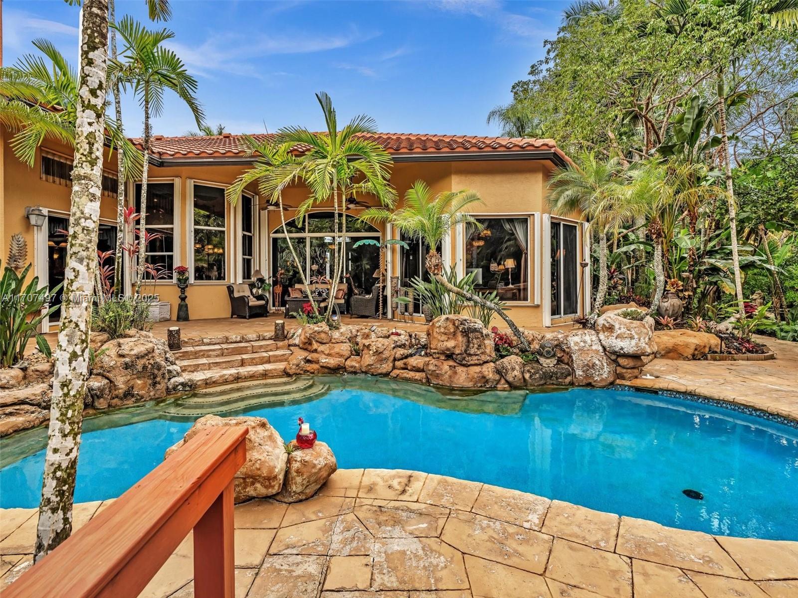 Nestled on a tropical waterfront .84 acre lot, this stunning custom-built Mediterranean-style home uniquely blends elegance & comfort. The thoughtfully designed floor plan includes 3 Bedrooms + Large Office, 2.5 Baths, and volume ceilings throughout. The private outdoor oasis features a sparkling freeform pool, outdoor shower, tiki bar, built-in BBQ area, expansive deck with a dock and hot tub overlooking the canal, & lush landscaping with fruit trees & exotic plants. Inside, the gourmet kitchen boasts Thermador appliances, custom wood cabinets & a spacious butler pantry. Relax by the wood-burning fireplace or host gatherings at the wet bar. With its balance of indoor & outdoor living, this private retreat is designed for unforgettable memories. NO HOA. NEW ROOF 2022. TWO NEW ACs.