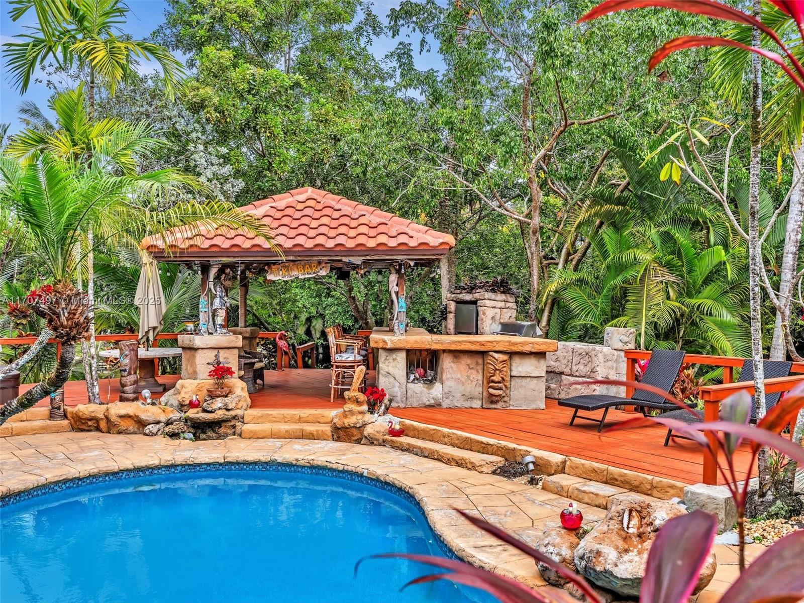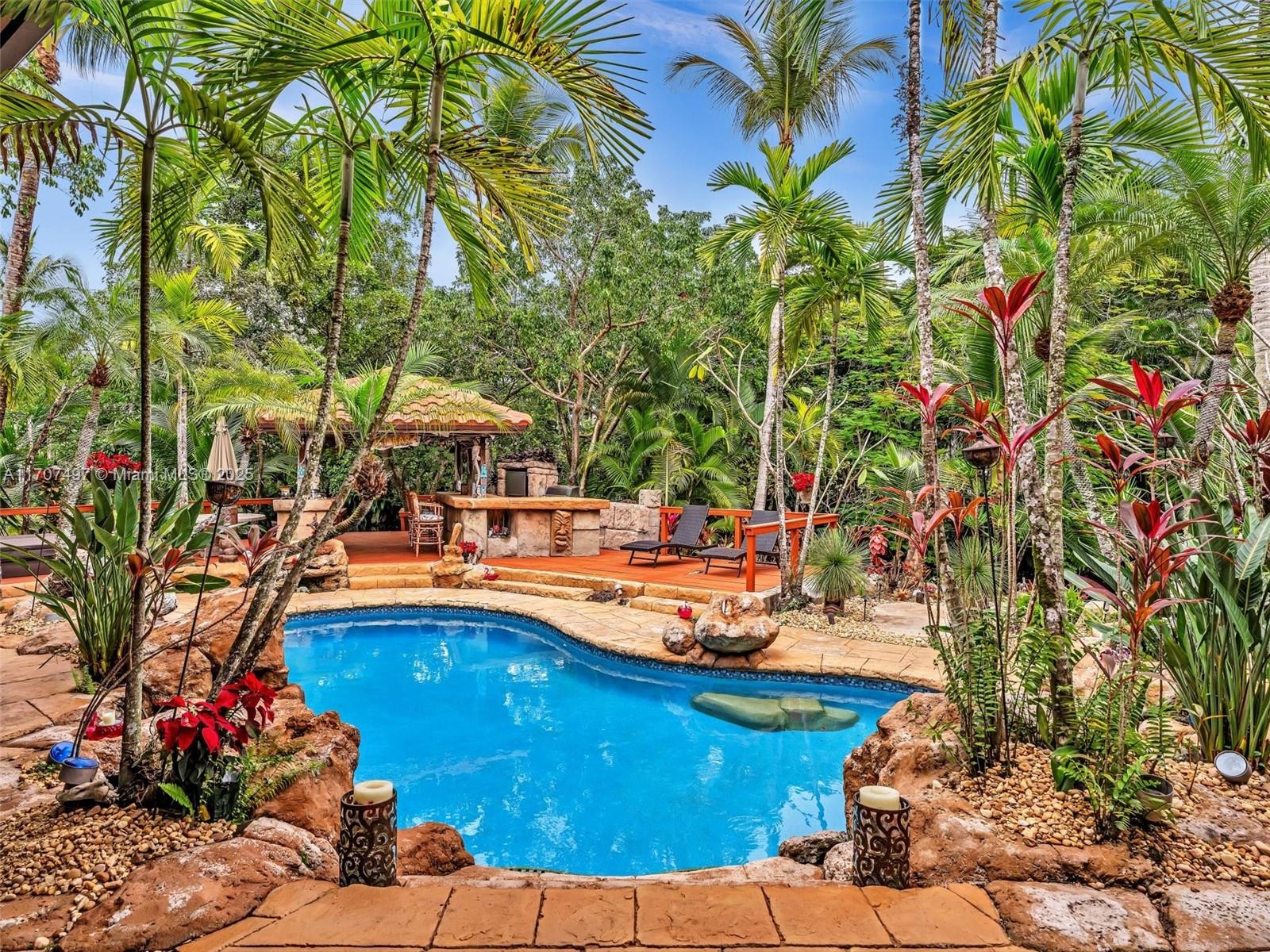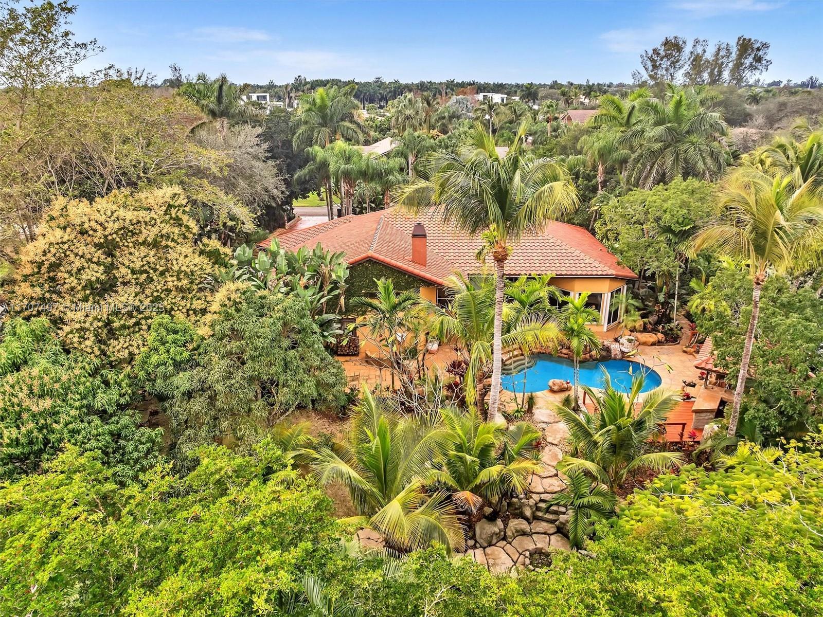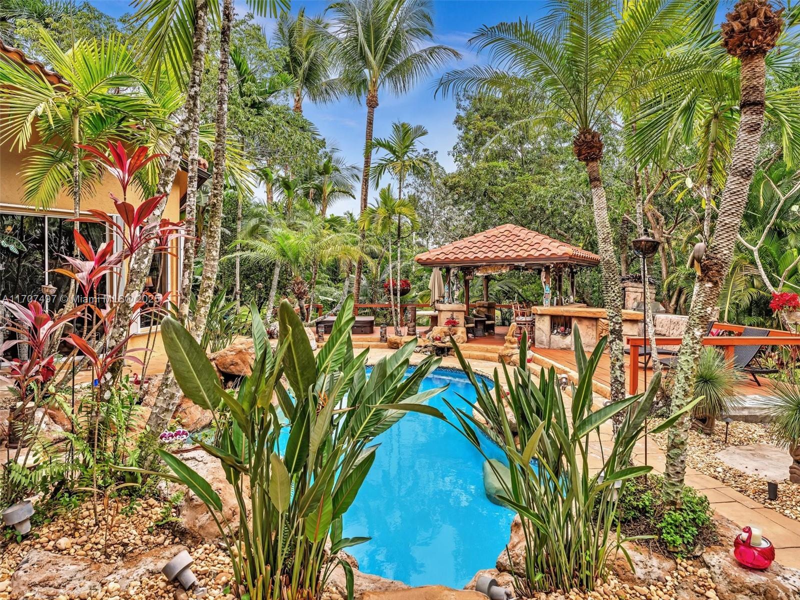 Nestled on a tropical waterfront .84 acre lot, this stunning custom-built Mediterranean-style home uniquely blends elegance & comfort. The thoughtfully designed floor plan includes 3 Bedrooms + Large Office, 2.5 Baths, and volume ceilings throughout. The private outdoor oasis features a sparkling freeform pool, outdoor shower, tiki bar, built-in BBQ area, expansive deck with a dock and hot tub overlooking the canal, & lush landscaping with fruit trees & exotic plants. Inside, the gourmet kitchen boasts Thermador appliances, custom wood cabinets & a spacious butler pantry. Relax by the wood-burning fireplace or host gatherings at the wet bar. With its balance of indoor & outdoor living, this private retreat is designed for unforgettable memories. NO HOA. NEW ROOF 2022. TWO NEW ACs.
