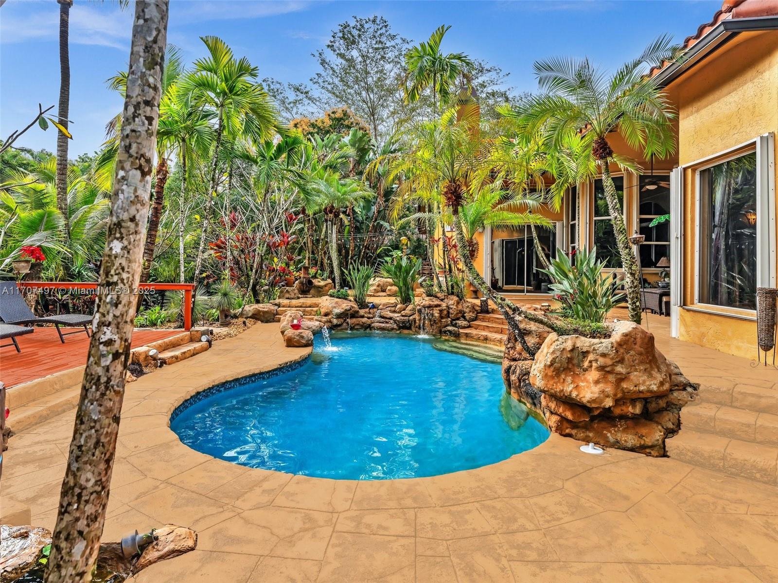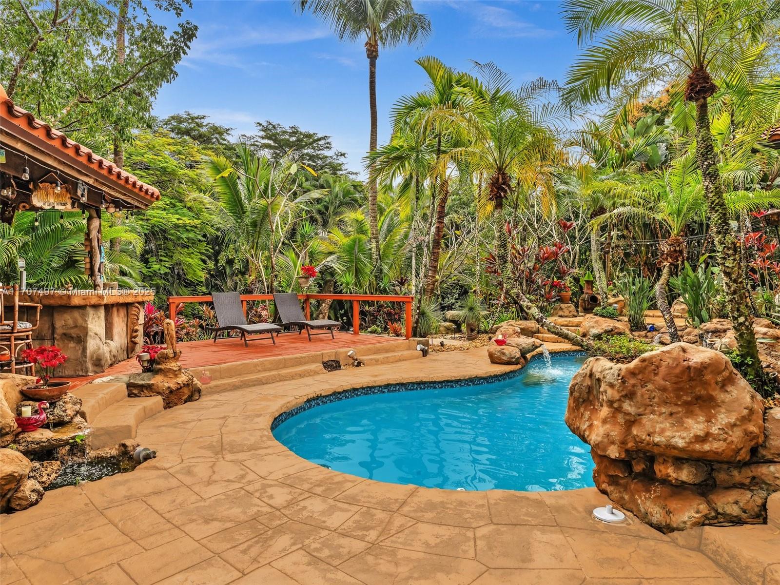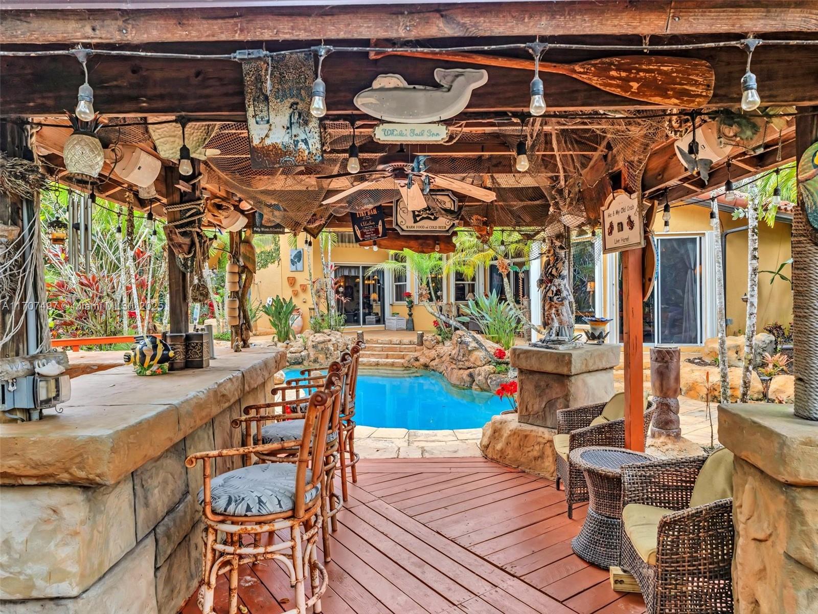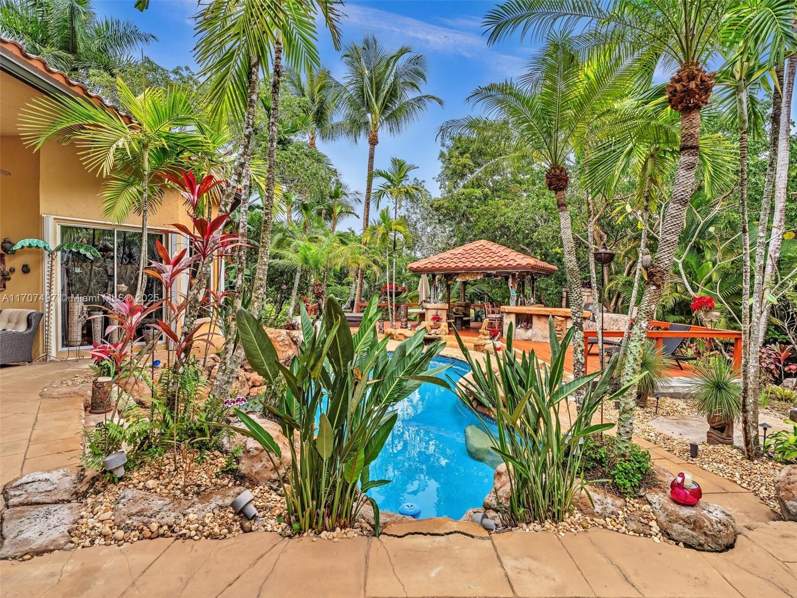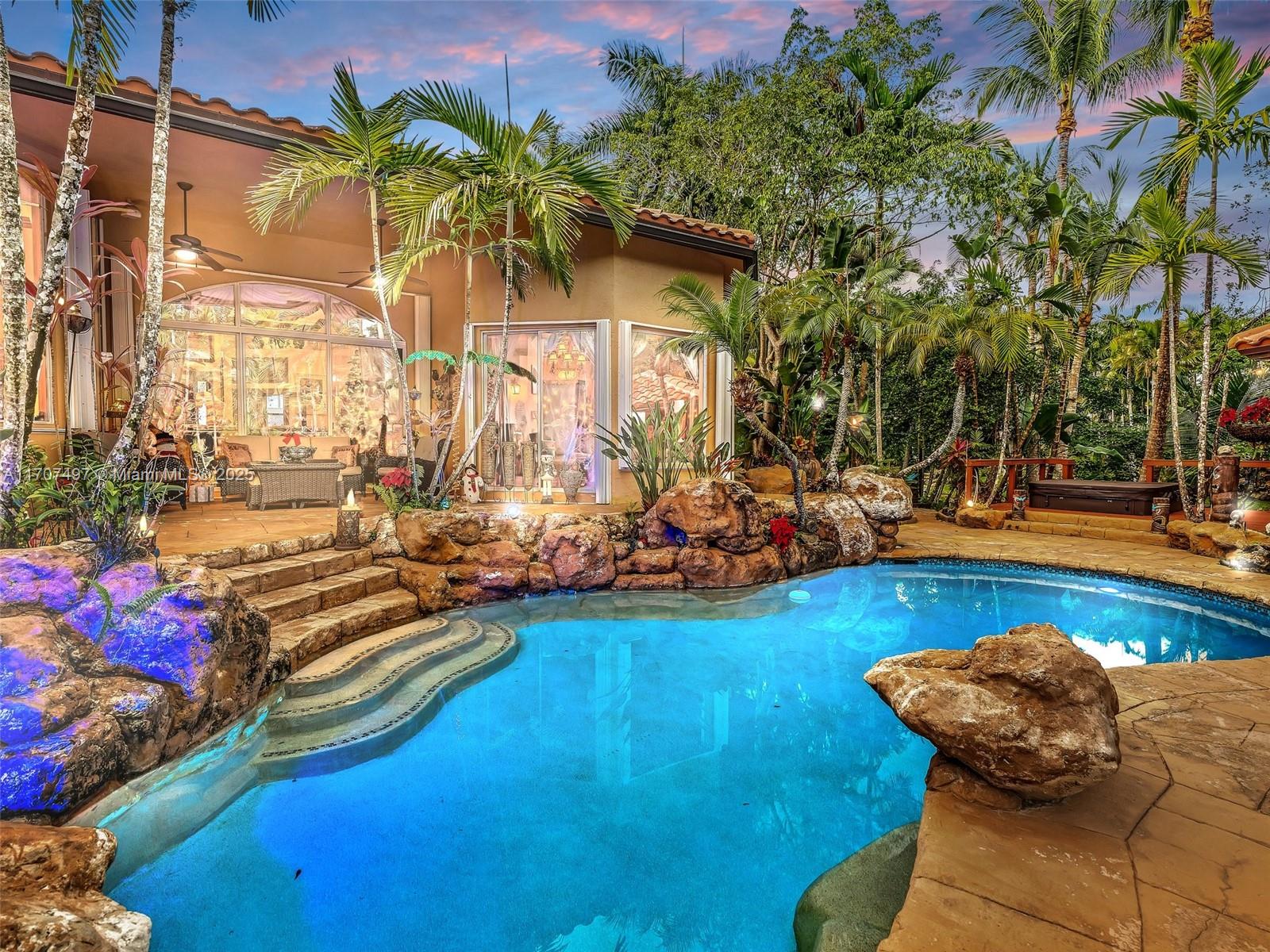 Nestled on a tropical waterfront .84 acre lot, this stunning custom-built Mediterranean-style home uniquely blends elegance & comfort. The thoughtfully designed floor plan includes 3 Bedrooms + Large Office, 2.5 Baths, and volume ceilings throughout. The private outdoor oasis features a sparkling freeform pool, outdoor shower, tiki bar, built-in BBQ area, expansive deck with a dock and hot tub overlooking the canal, & lush landscaping with fruit trees & exotic plants. Inside, the gourmet kitchen boasts Thermador appliances, custom wood cabinets & a spacious butler pantry. Relax by the wood-burning fireplace or host gatherings at the wet bar. With its balance of indoor & outdoor living, this private retreat is designed for unforgettable memories. NO HOA. NEW ROOF 2022. TWO NEW ACs.