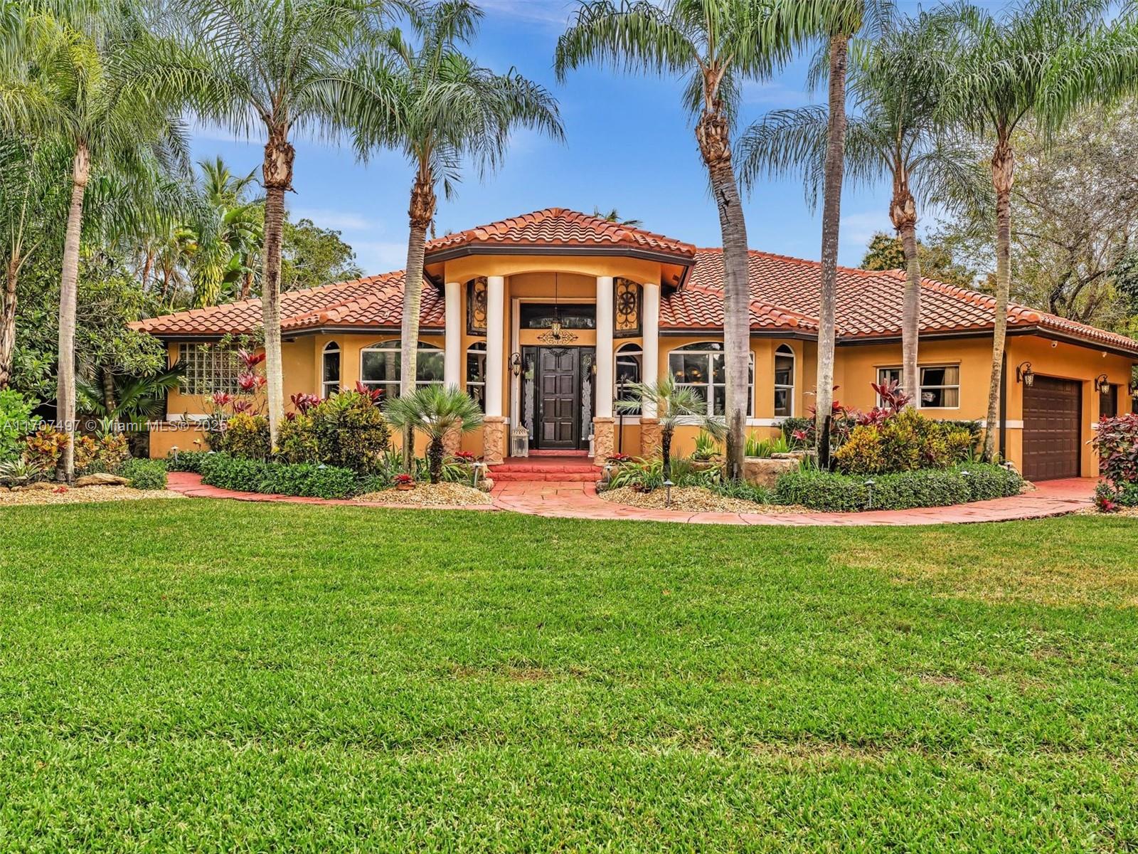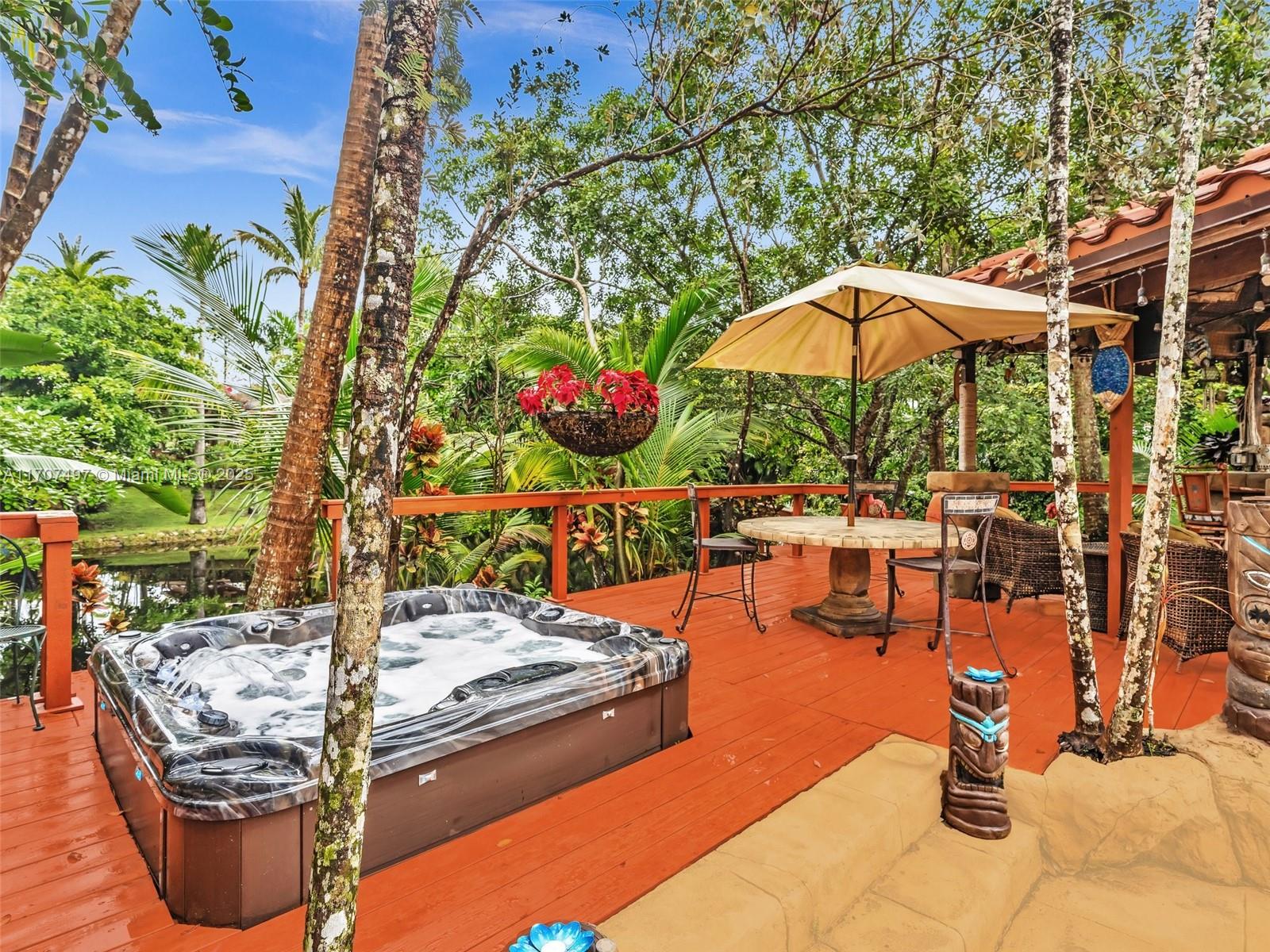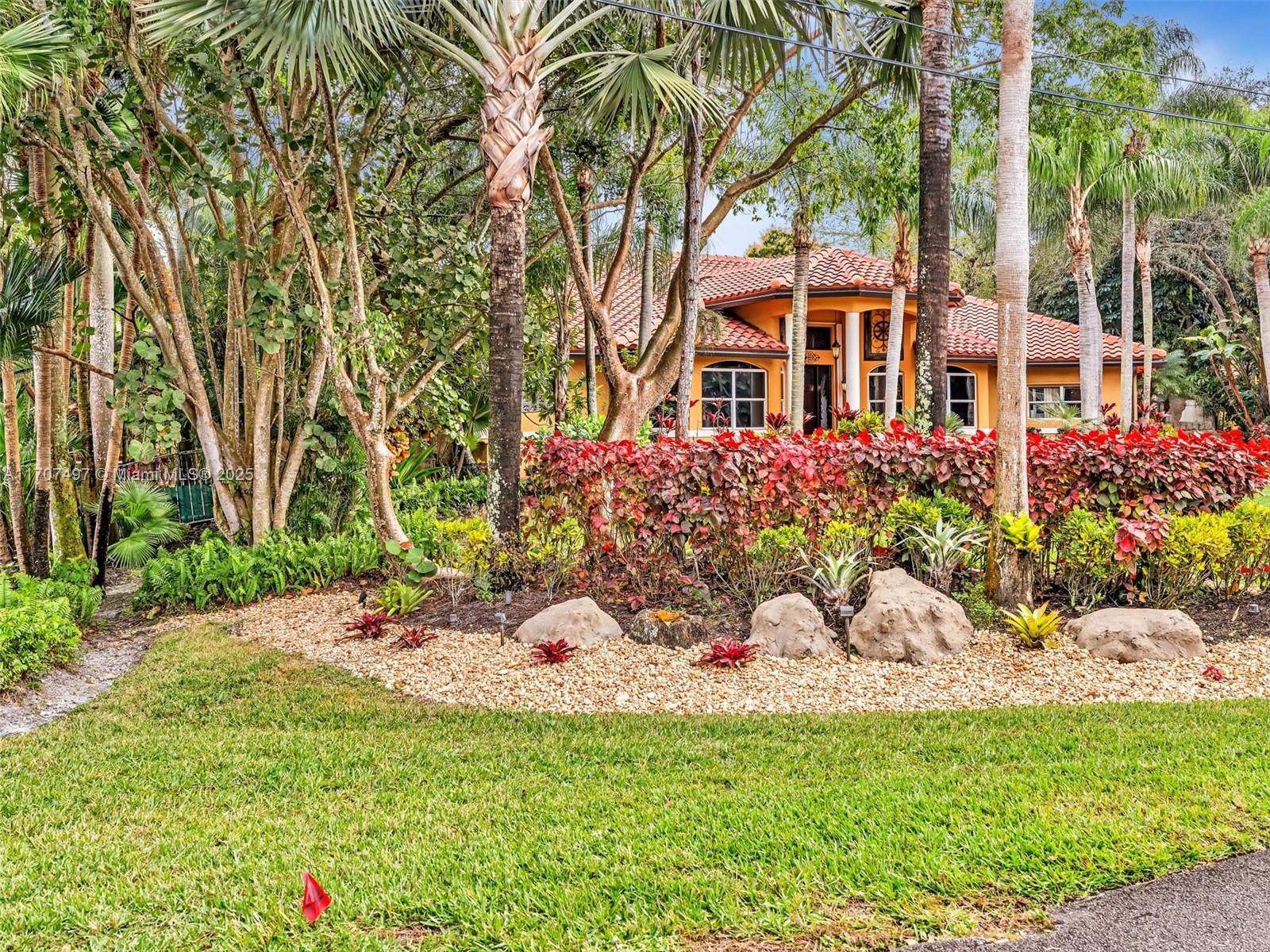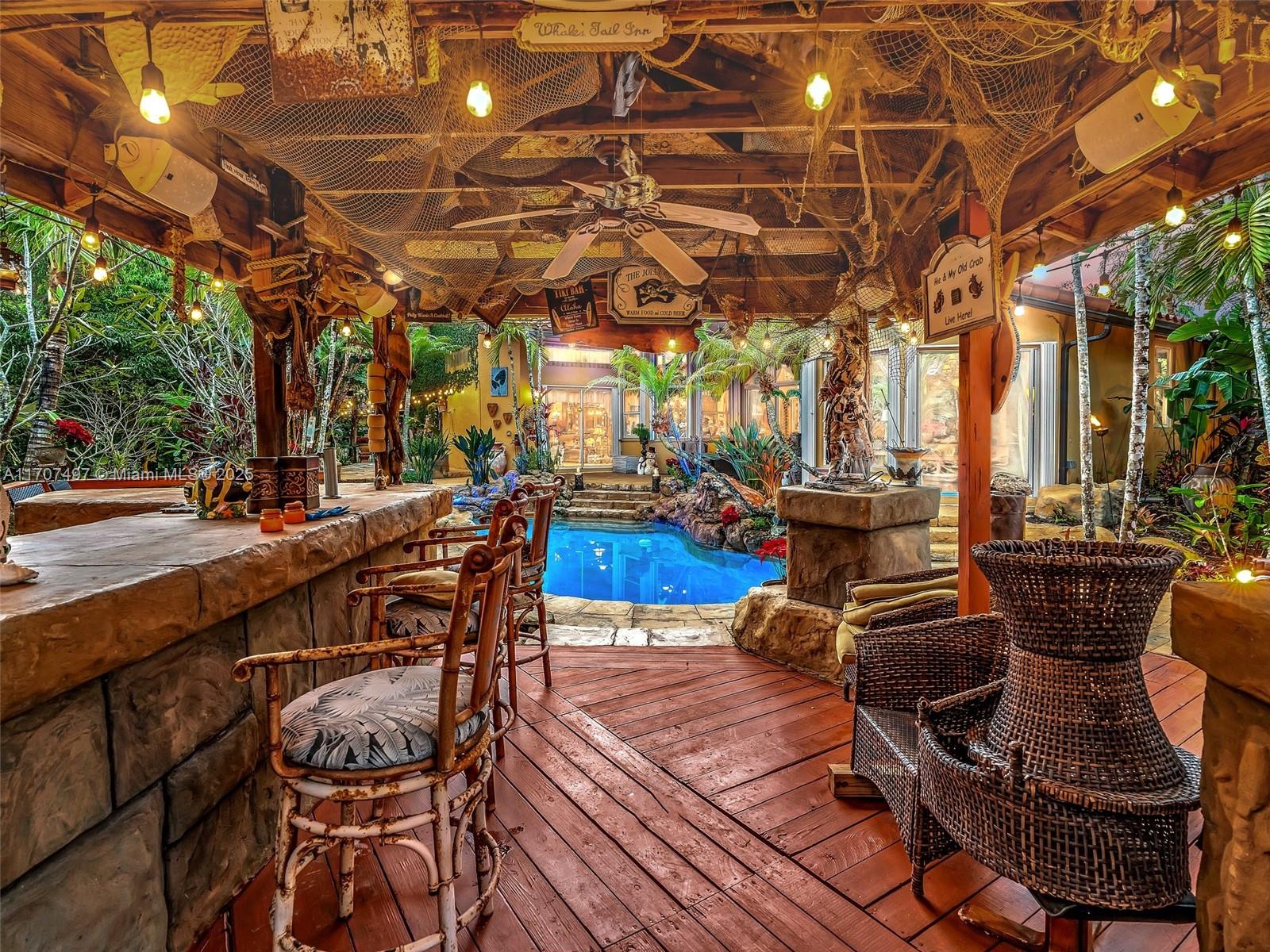 Nestled on a tropical waterfront .84 acre lot, this stunning custom-built Mediterranean-style home uniquely blends elegance & comfort. The thoughtfully designed floor plan includes 3 Bedrooms + Large Office, 2.5 Baths, and volume ceilings throughout. The private outdoor oasis features a sparkling freeform pool, outdoor shower, tiki bar, built-in BBQ area, expansive deck with a dock and hot tub overlooking the canal, & lush landscaping with fruit trees & exotic plants. Inside, the gourmet kitchen boasts Thermador appliances, custom wood cabinets & a spacious butler pantry. Relax by the wood-burning fireplace or host gatherings at the wet bar. With its balance of indoor & outdoor living, this private retreat is designed for unforgettable memories. NO HOA. NEW ROOF 2022. TWO NEW ACs.