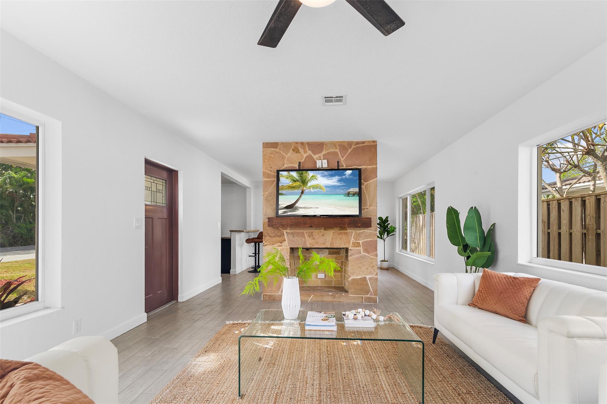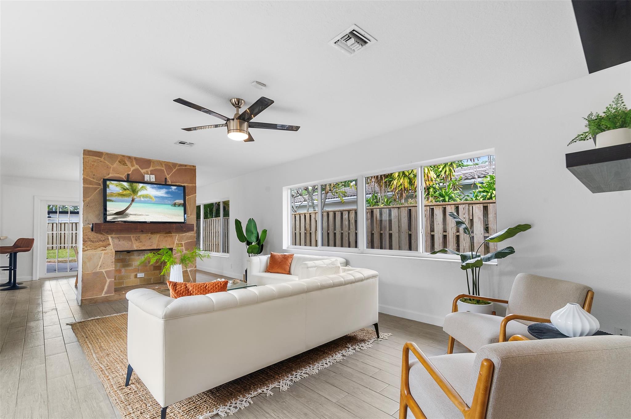 Welcome to this charming 2 bedroom, 2 bathroom home in desirable Lake Ridge positioned on a corner lot providing additional privacy and tranquility. This home perfectly blends comfort, style, and functionality, this beautiful residence is a must-see. Key features include, impact windows and doors, updated kitchen with stainless steel appliances, brick fireplace elegantly dividing living and dining rooms and spacious laundry room with ample storage. Fenced-in backyard oasis with deck, perfect for outdoor entertaining. Lake Ridge is the perfect suburb of Ft. Lauderdale located 1.5 Miles from Ocean and Las Olas, Walking distance to Gateway theater, shopping and restaurants and 1/2 mile to Galleria Mall, Holiday Park and Dog Park. No HOA/Restrictions. See attachments for insurance inspections
