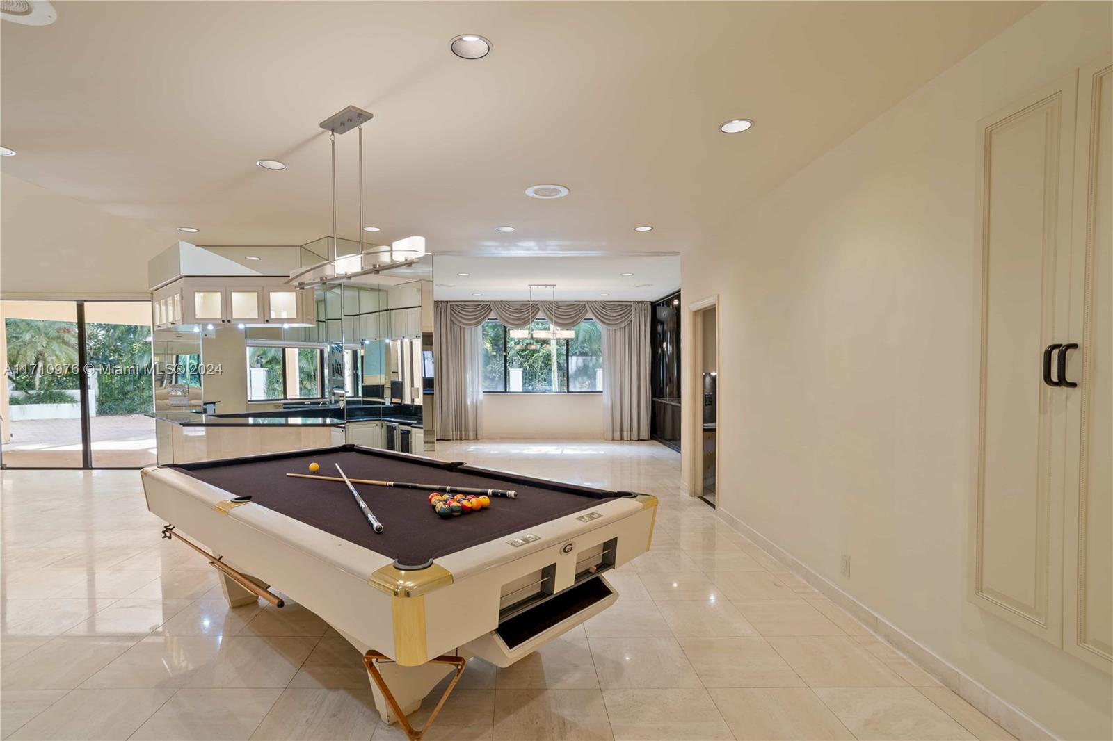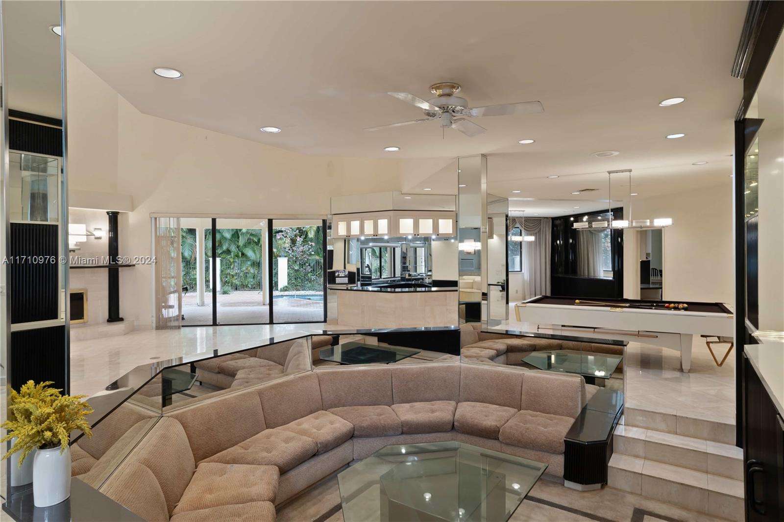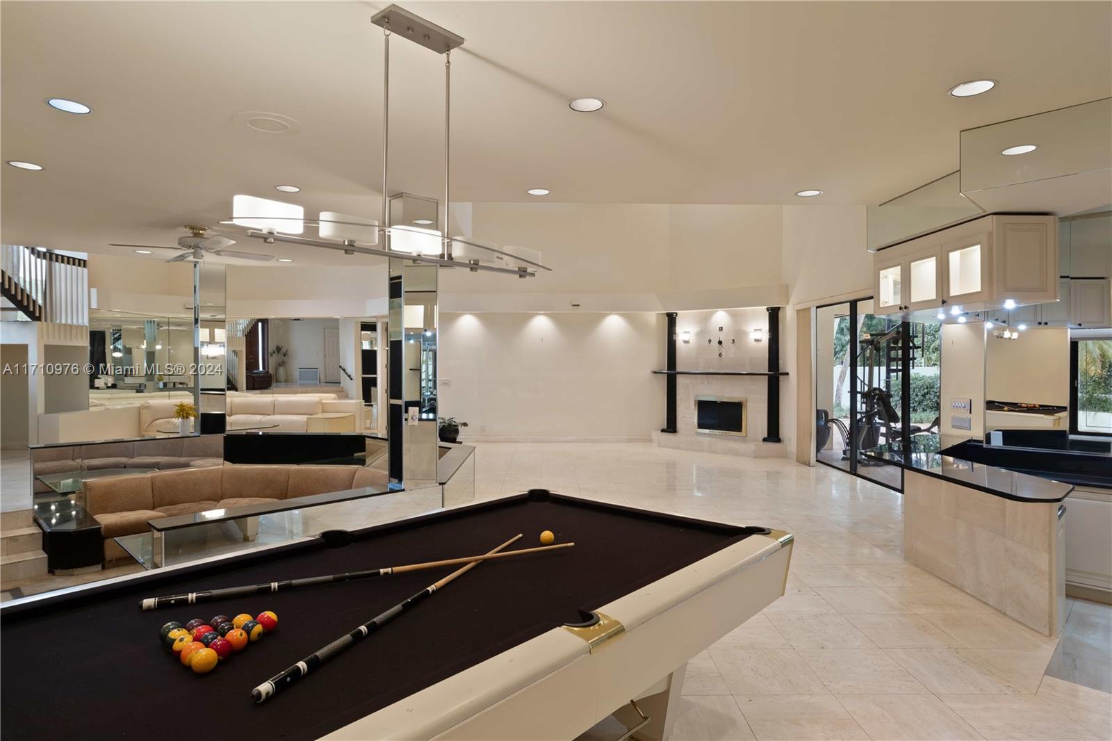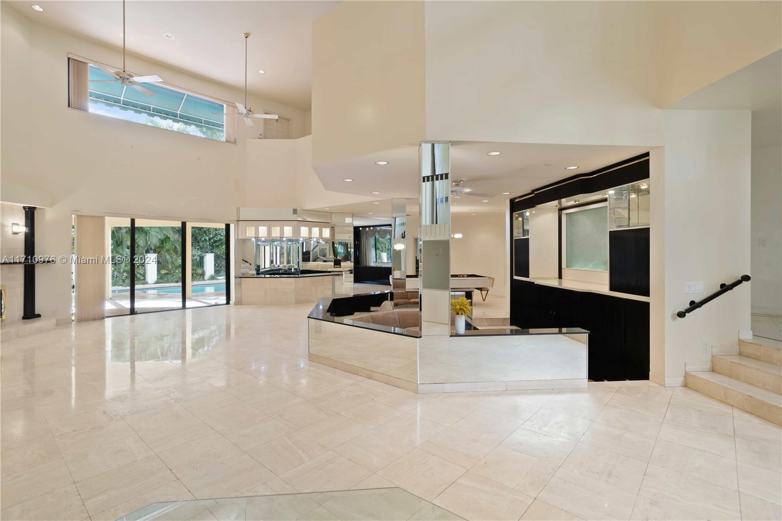 This exceptional residence, located in prestigious Jacaranda Country Club in Plantation, Florida, is truly one of a kind. Upon entering through the elevated entrance, you'll immediately sense a welcoming atmosphere. The expansive great room, featuring impressive 22-foot ceilings, includes five distinct areas designed for entertainment. A custom-built space is ready for your theater room, while a magnificent wood-burning fireplace creates a warm, relaxed environment. The wet bar, equipped with a refrigerator, ice maker, and ample seating around granite countertops, is perfect for hosting gatherings. The pool table and its equipment are also included. The open-concept layout flows effortlessly to the expansive outdoor patio, situated in a great golf course community, this home is a must-see!