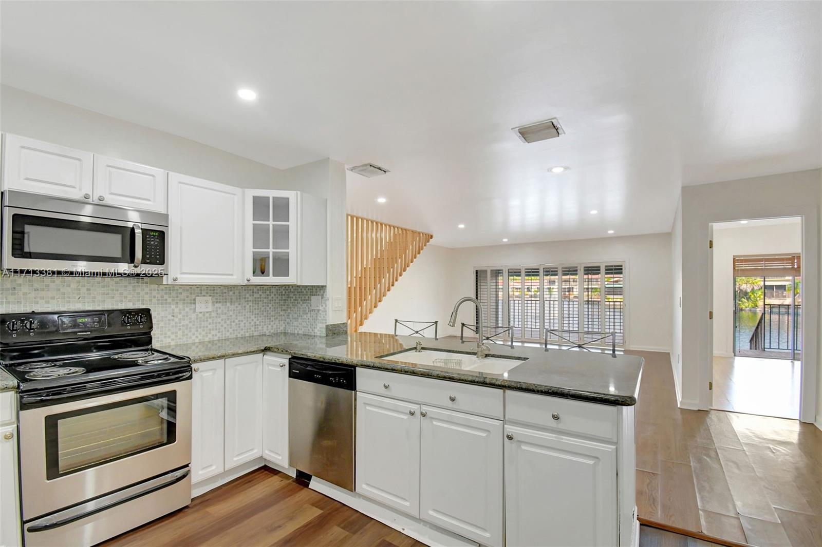 Great opportunity to own the largest model townhome in Miami Lakes with over 2000 square feet. Wide lake view from almost every room. First bedroom with private remodeled bath on the first floor. Second bedroom with private remodeled bath. New flooring on ground level. UPPER FLOOR bedroom overlooks lake with 2 large walk-in closets and newly carpeted floors. Upgraded kitchen with stainless steel appliances and granite counter tops. Roof was replaced in 2021. Centrally located within walking distance to parks, play areas, restaurants and A+ schools. Sip your coffee enjoying the sunrise from the covered patio and private dock!