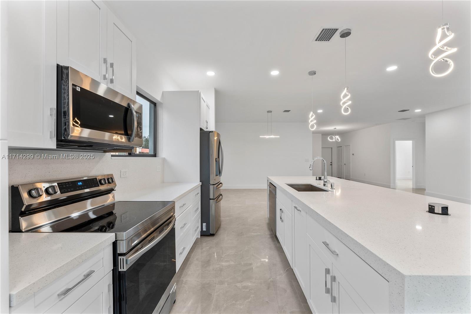 Stunning new construction home, ideally located near the beach, Hard Rock Hotel & Casino, Hard Rock Stadium, and Gulfstream Park. This luxury designer styled home has 4-bedrooms, 3.5-baths, a 2 car garage, and features two on-suite bedrooms with private bathrooms. One can easily be an in-law suite or perfect guest room. This home also has impact windows, doors, custom closets, and Bluetooth-enabled front door and garage door. It boasts 32x32 porcelain tiles, quartz countertops with waterfall edge, and upgraded Samsung stainless steel appliances. The spacious fenced yard includes irrigation and room for a pool. No HOA. NO FLOOD ZONE. You will have peace of mind with this turn key new home!