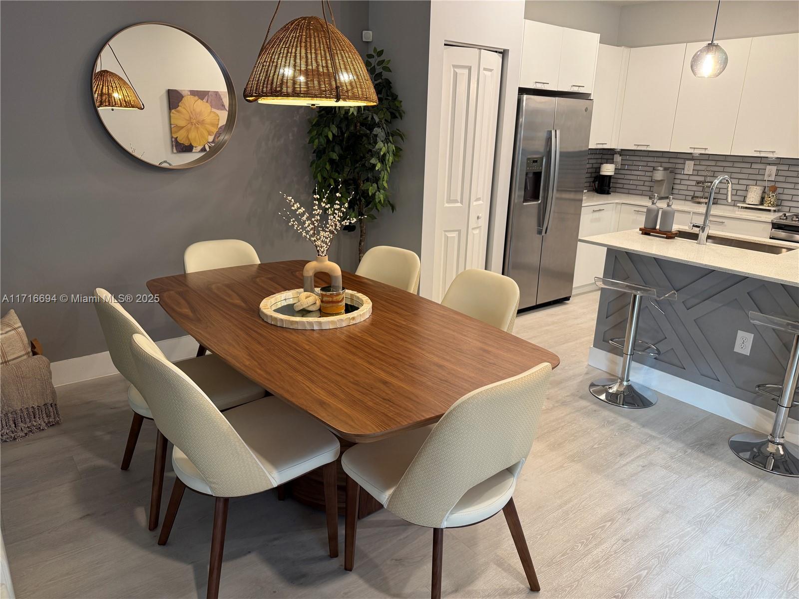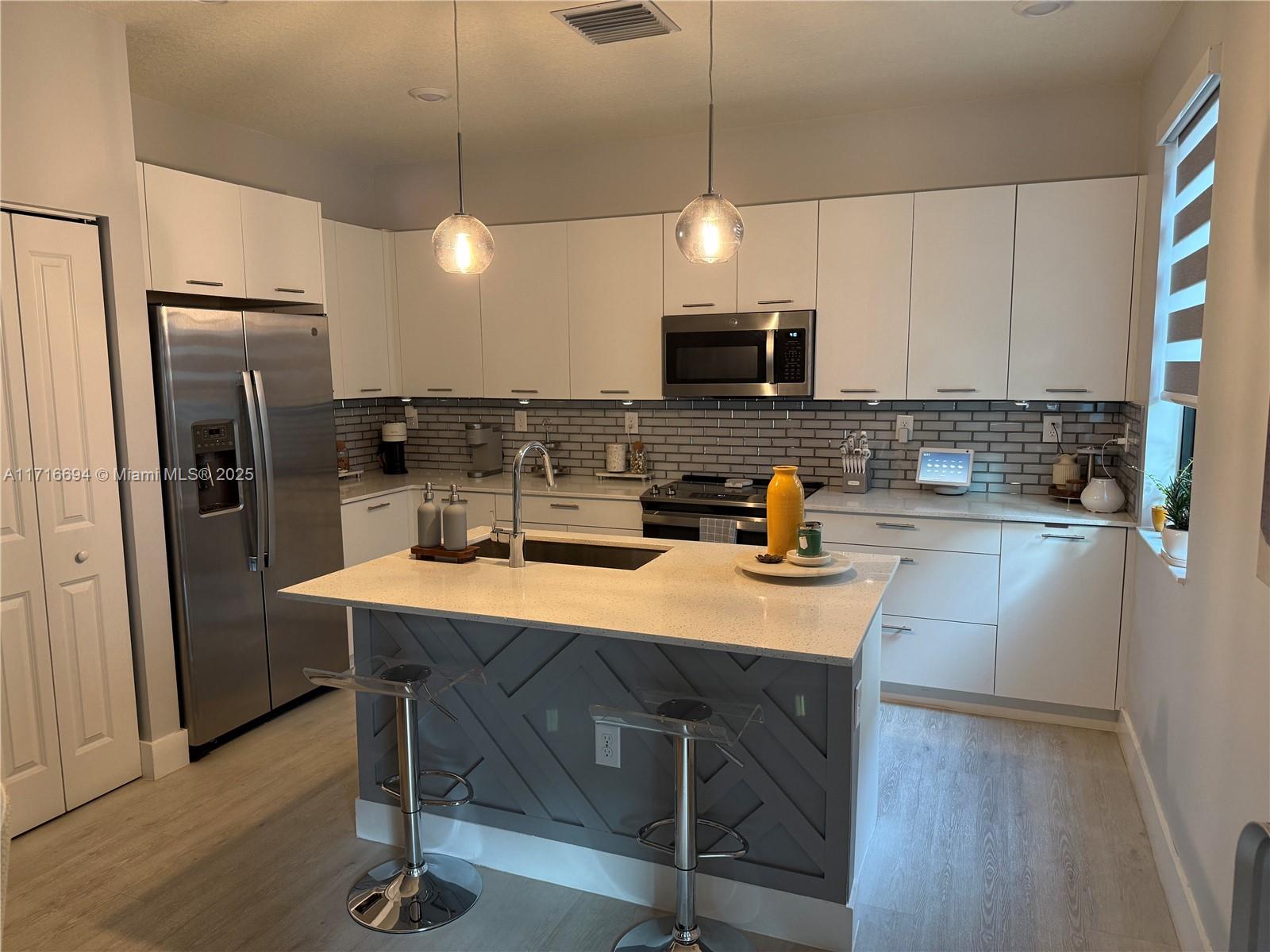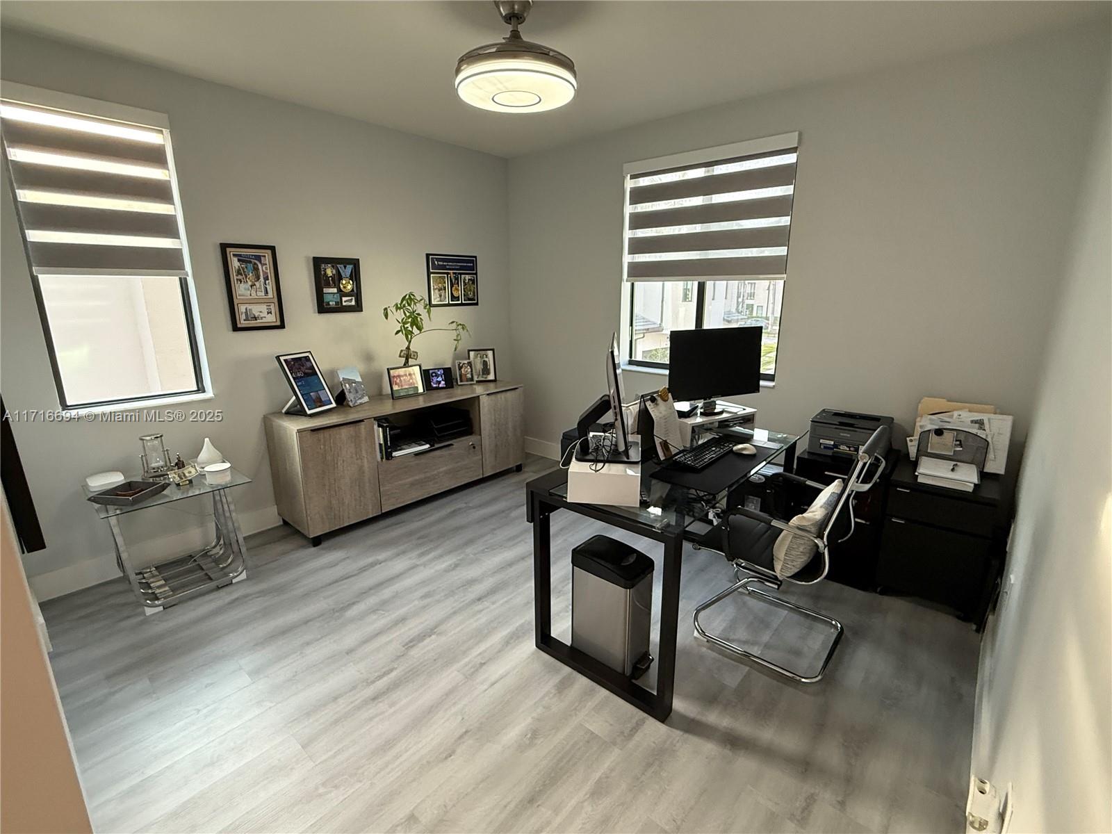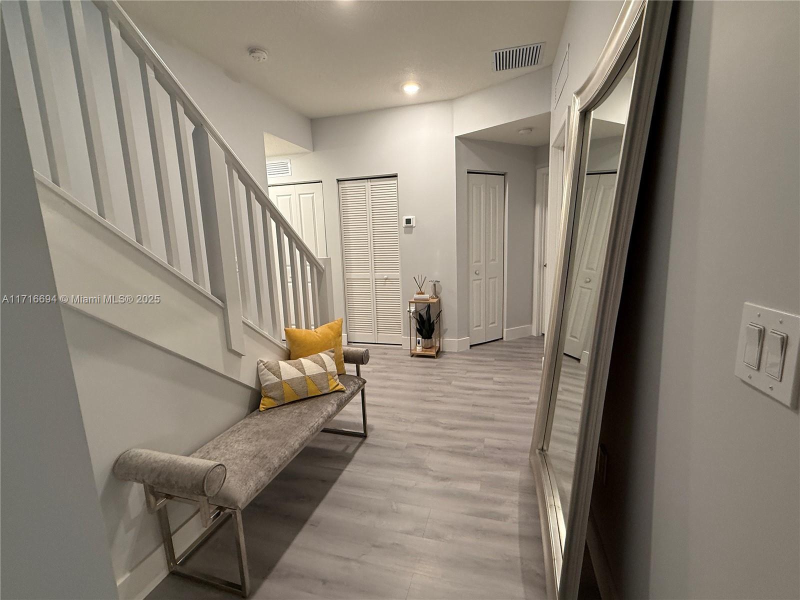 Upgraded luxury 3 story corner townhouse with two roof top terraces. Views of the Paseo Urbana and downtown Doral Skyline. All new vinyl plank floor covering throughout living area on first and second floor with ceramic tiles on third floor and bathrooms. 3 full bedrooms with custom closets, 2 full bathrooms and two 1/2 bathrooms. Laundry area and pantry with custom built ins. Outdoor covered summer kitchen in 3rd floor terrace as well as a second open terrace. Custom floor covering in two car garage with custom storage shelfs. Wired for electric car charging. Smart home with both front door and garage door accessed from app as well as central AC, lights and security system.