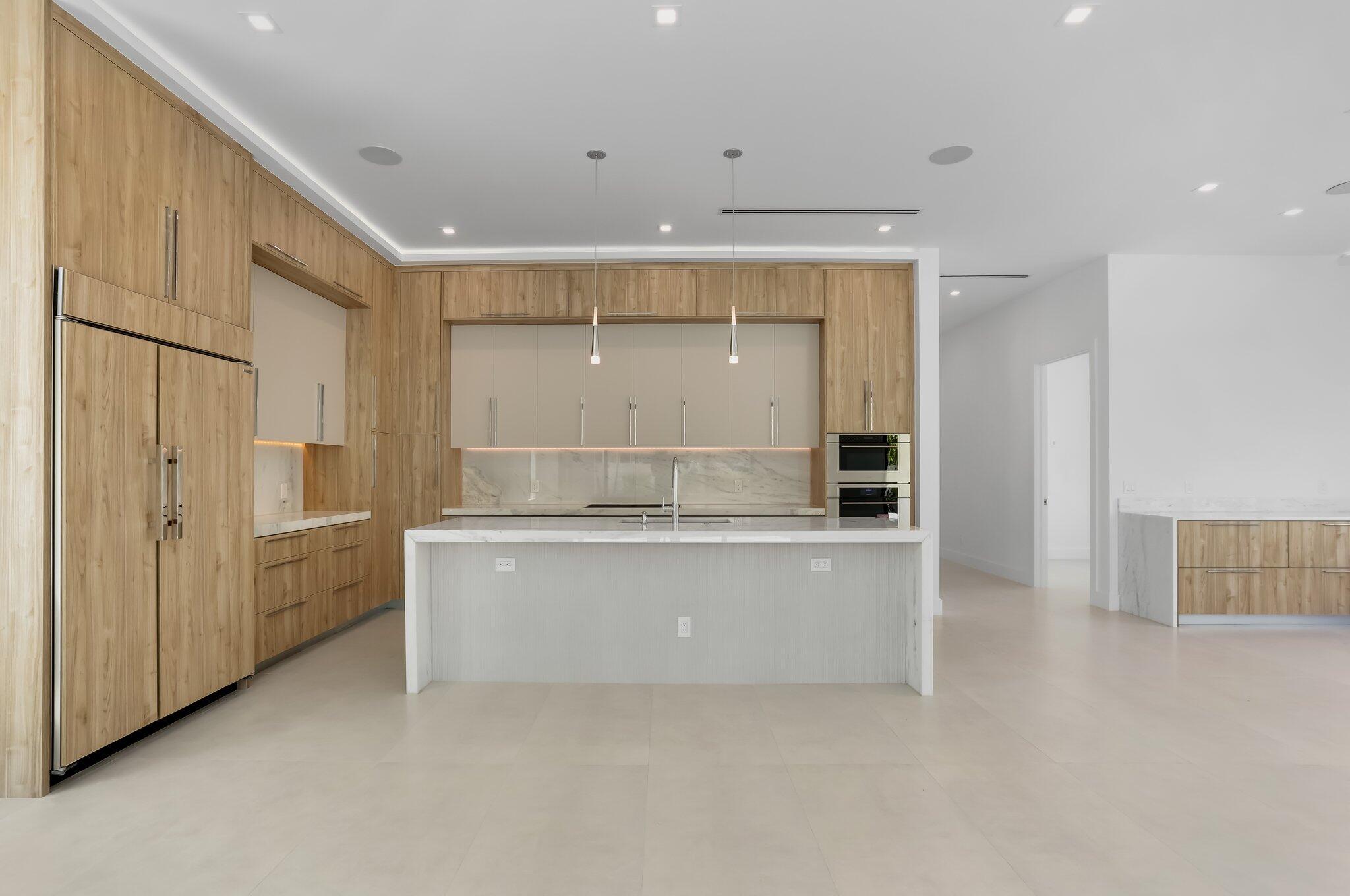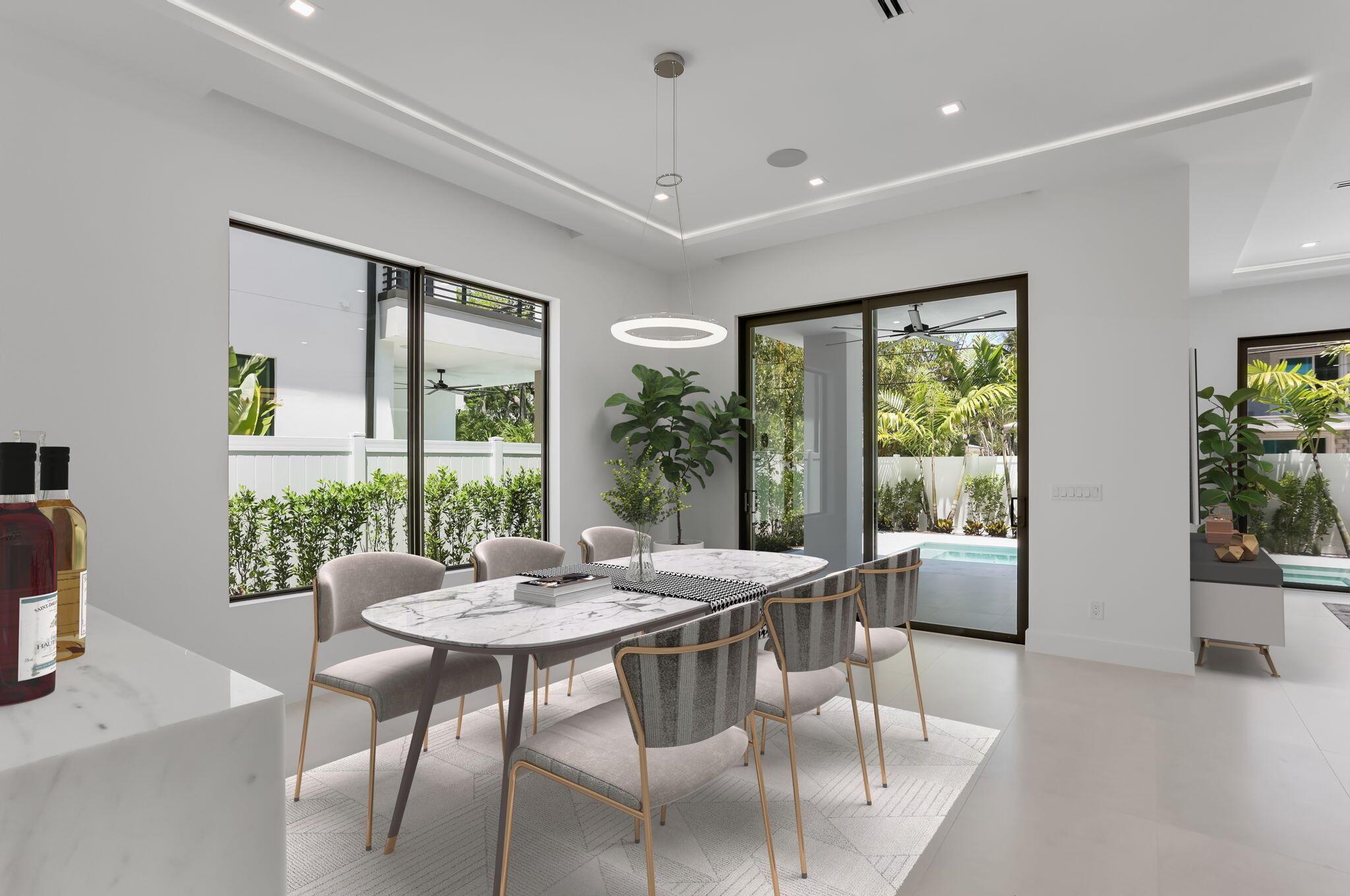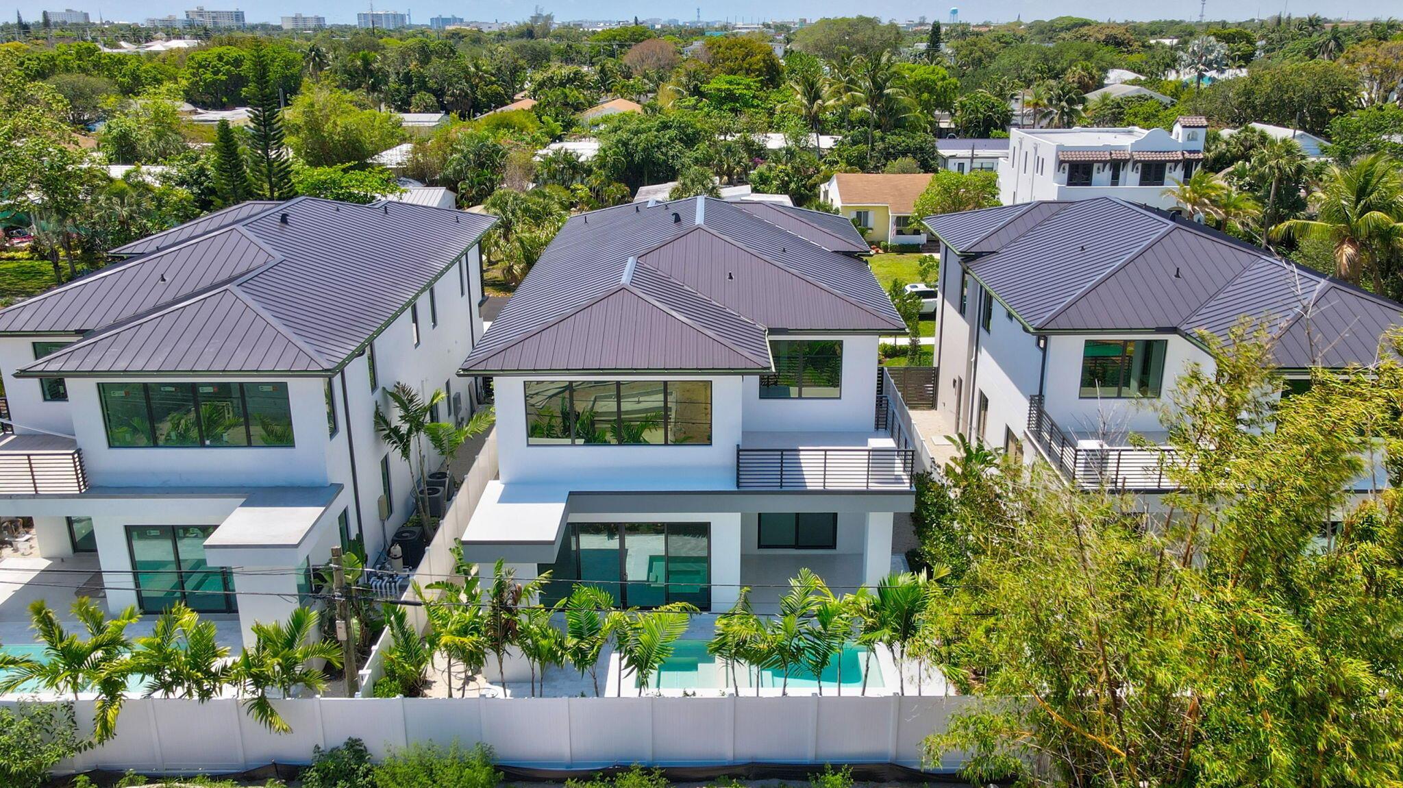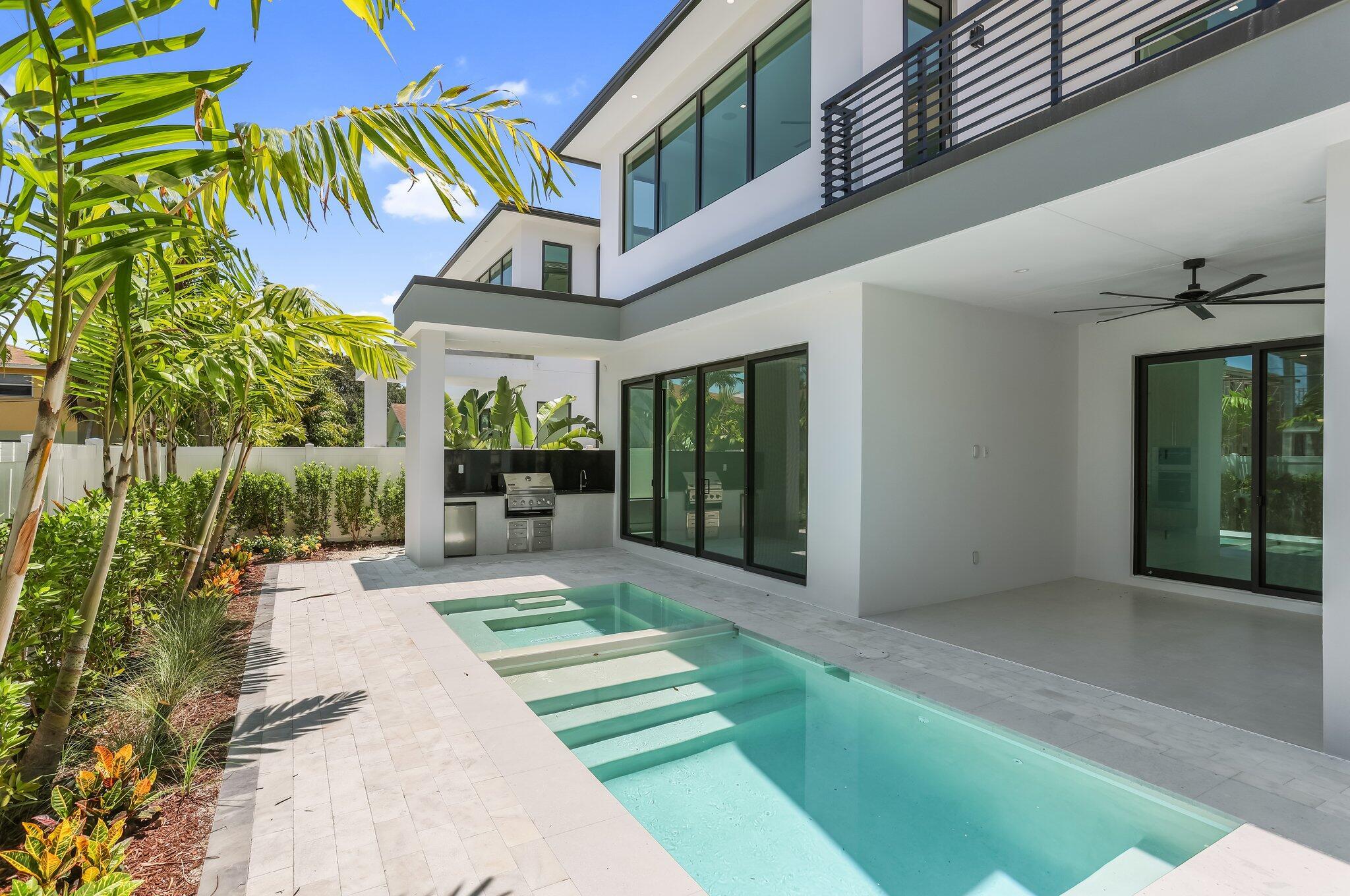 Newly constructed luxury residence with soaring ceilings, impact windows, a metal roof, and porcelain tile throughout. Features include an elevator, CAT6 wiring, Wolf & Sub-Zero kitchen appliances, natural stone waterfall island, and custom 8' doors. The spa-like primary bath offers a frameless shower, soaking tub, and designer finishes. Outdoors: a complete kitchen, marble paver patio, saltwater pool with spa, and privacy fencing. Additional highlights: dual-zone HVAC, smart home prewiring, 2-car garage with tiled floor, and full outdoor kitchen. Don't miss out on this opportunity for luxurious urban living.