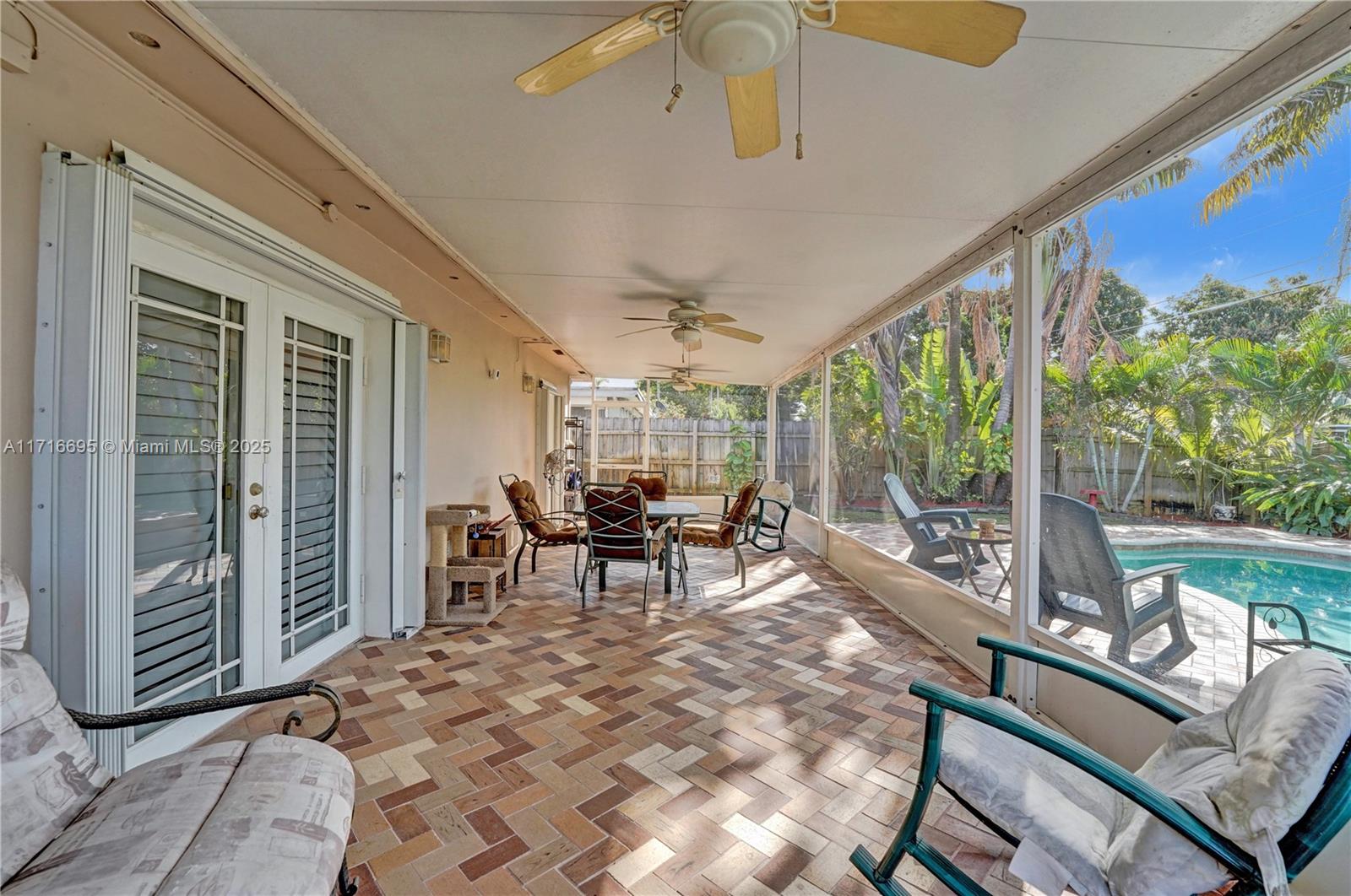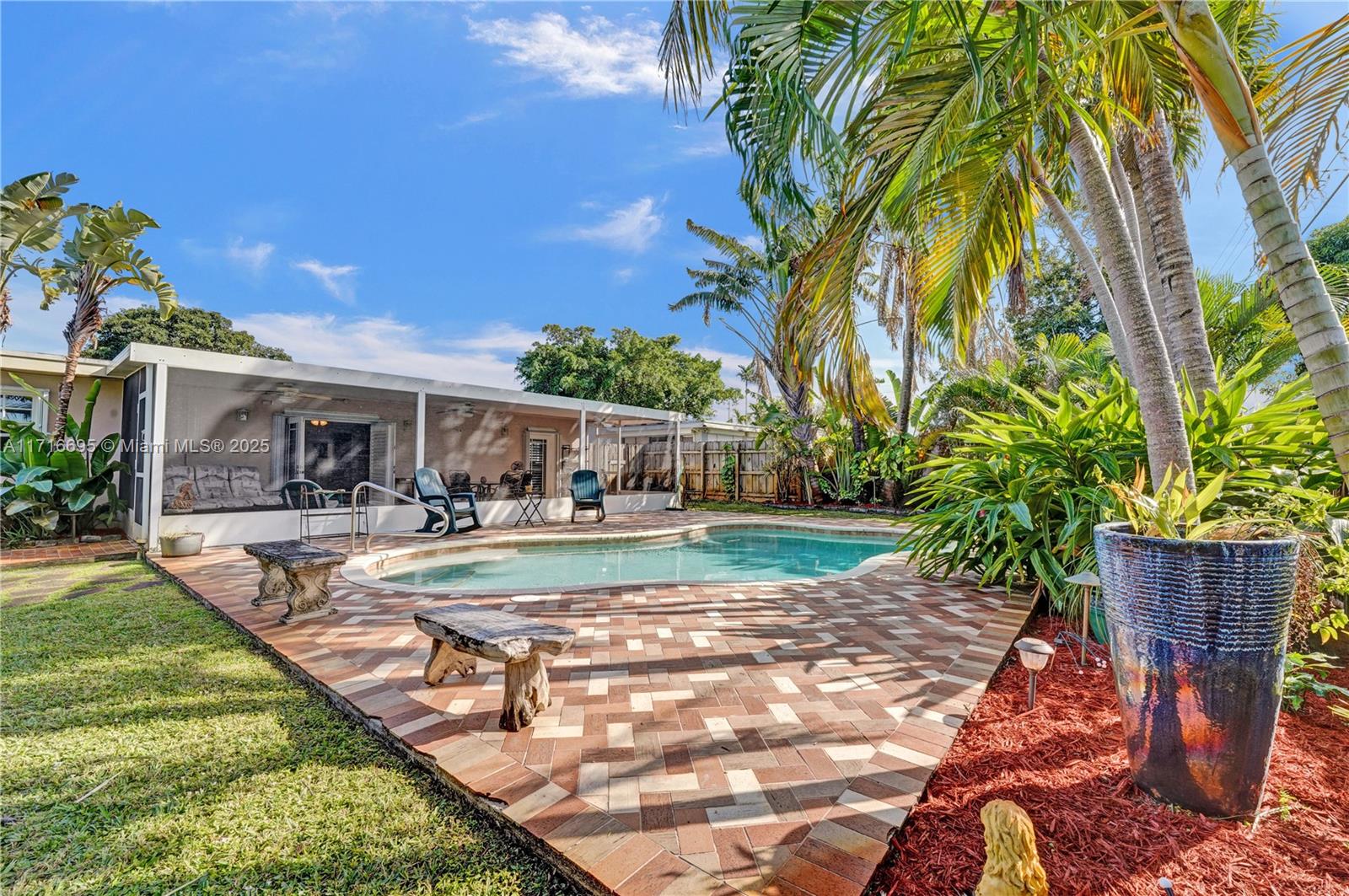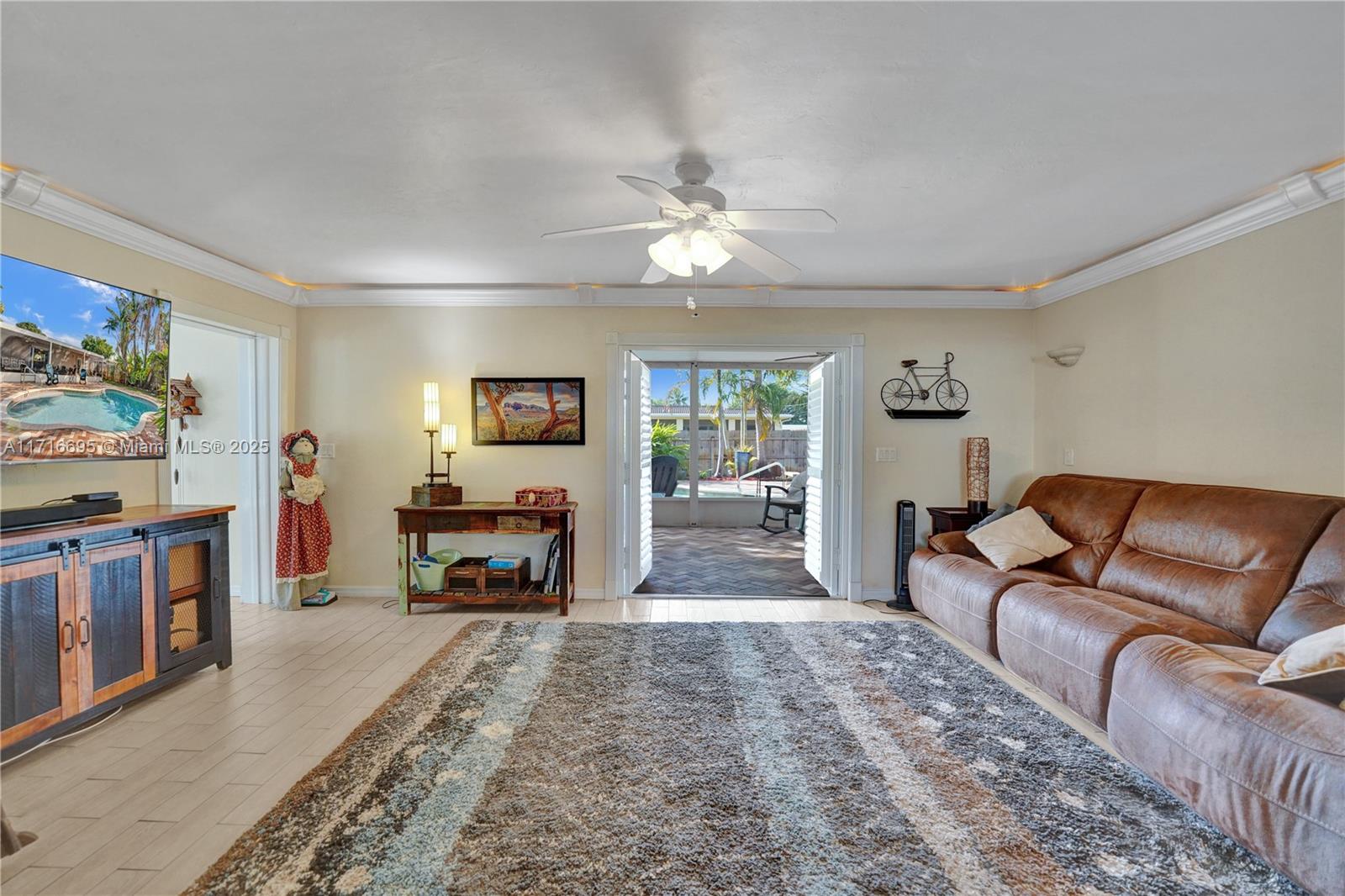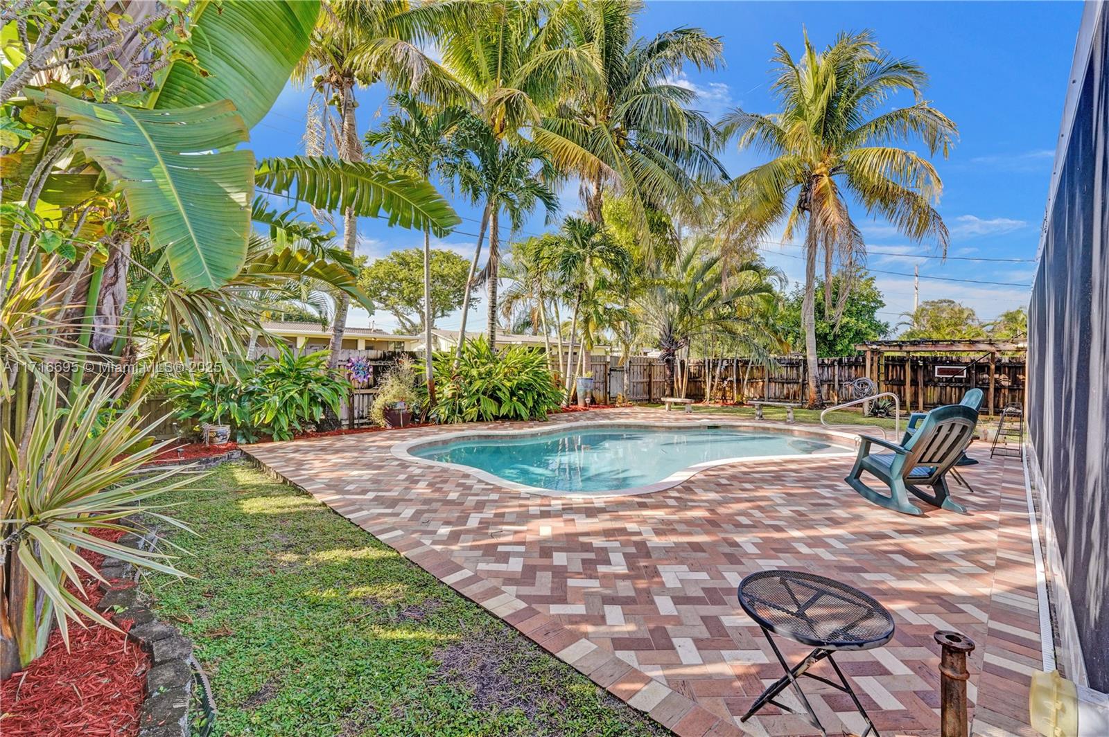 This 3 BR 2 Bath home features a kitchen with quartz countertops/ backsplash, and custom cabinets. The home also has custom tile floors. Throughout the home, there is crown molding with lighting in the living room, dining room, den, and two of the bedrooms. The windows and doorways have custom molding, and plantation shutters. The living room, dining room, den, and one bedroom have faux wood ceramic floors. The bathrooms are remodeled, including a soaking tub & large shower with four body sprays in the primary bathroom. Walk-in closets with built-ins. The large screened-in porch and the pergola in the yard by the pool will provide ample outdoor living space, and the tropical landscaping throughout the fenced-in yard creates a lush, private environment. Close to the beach,shopping,airport