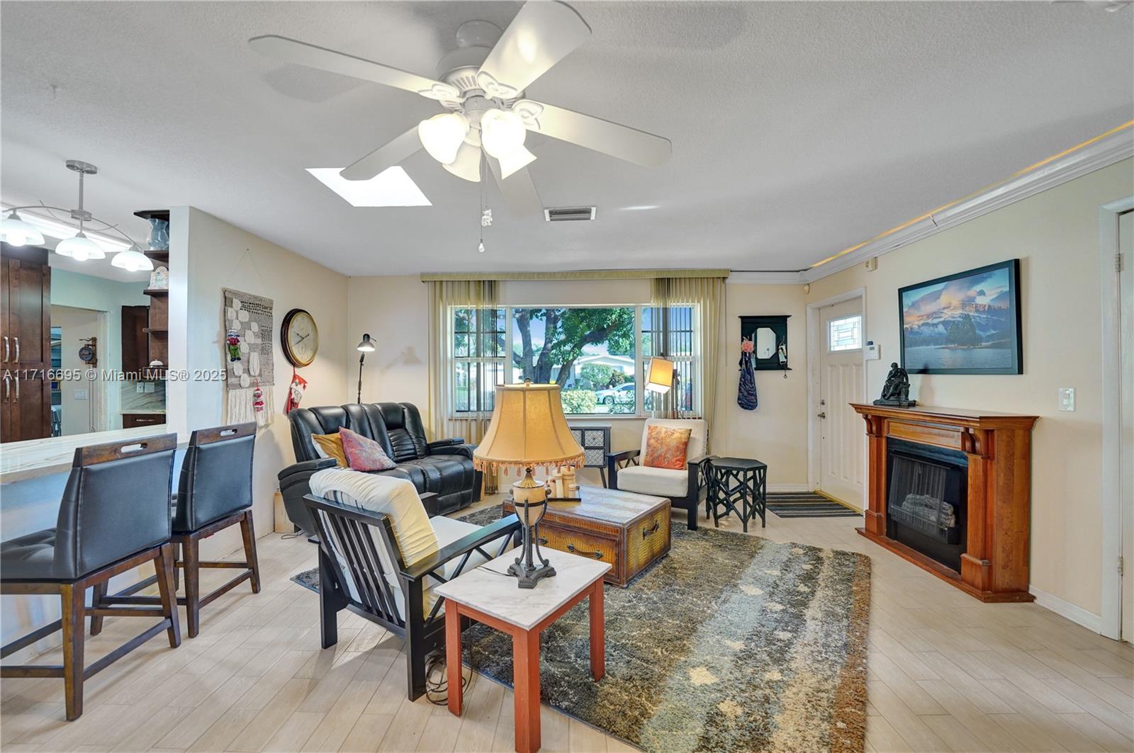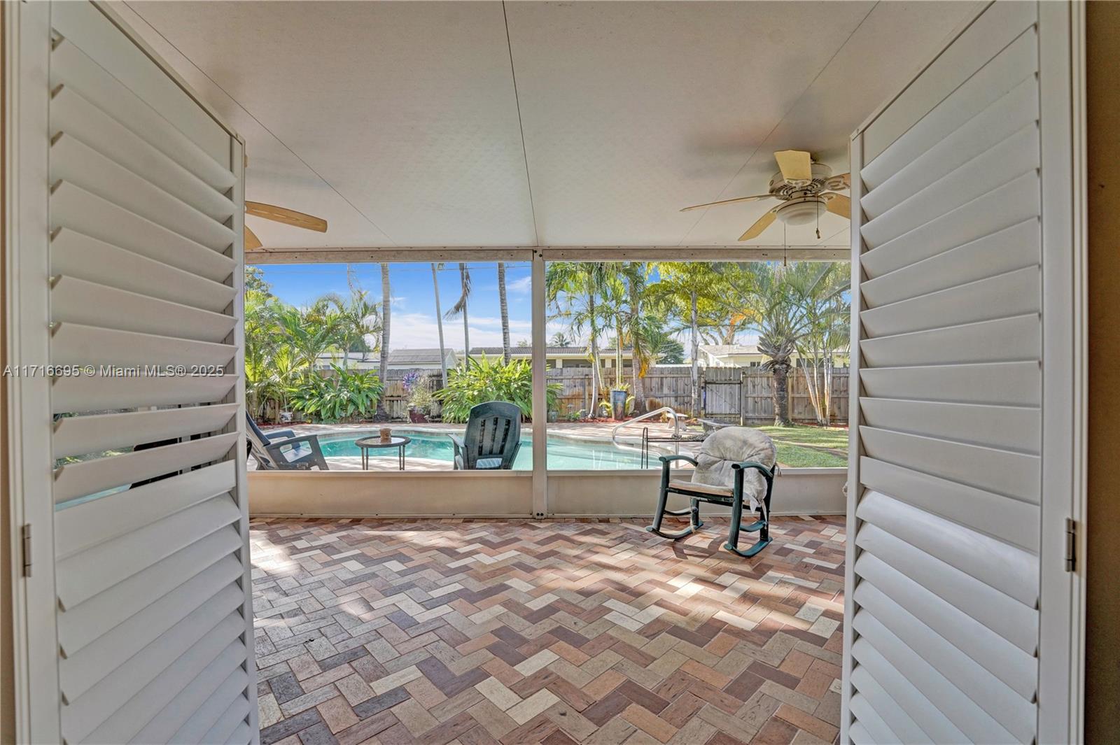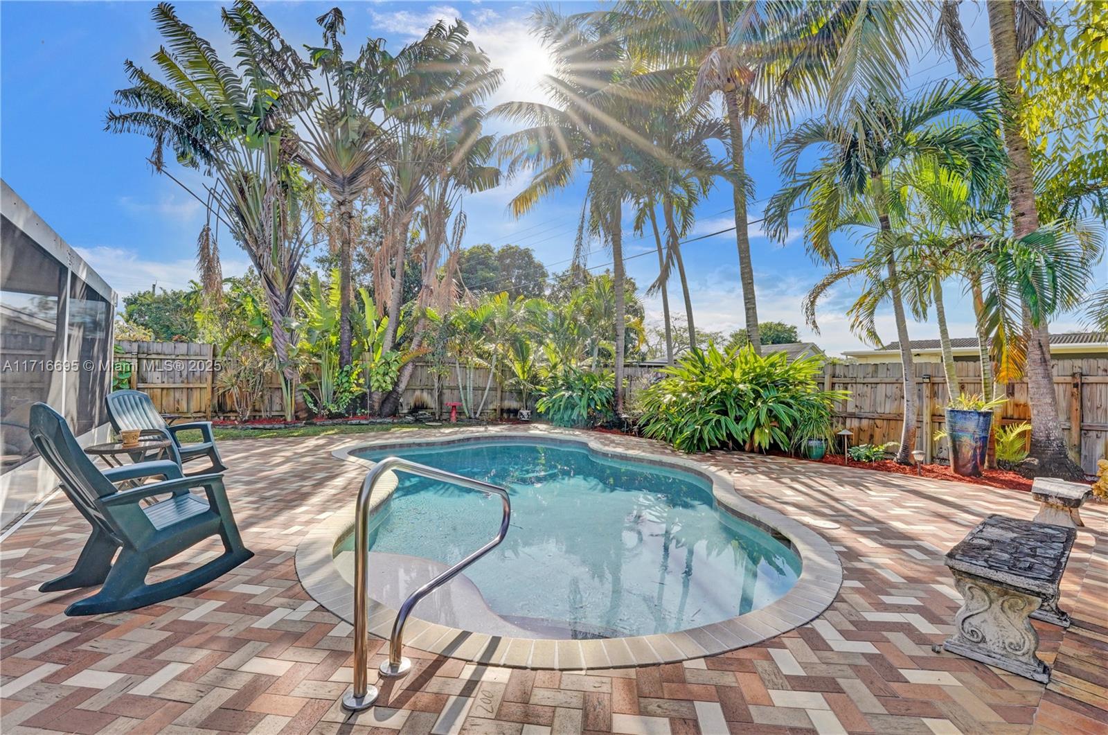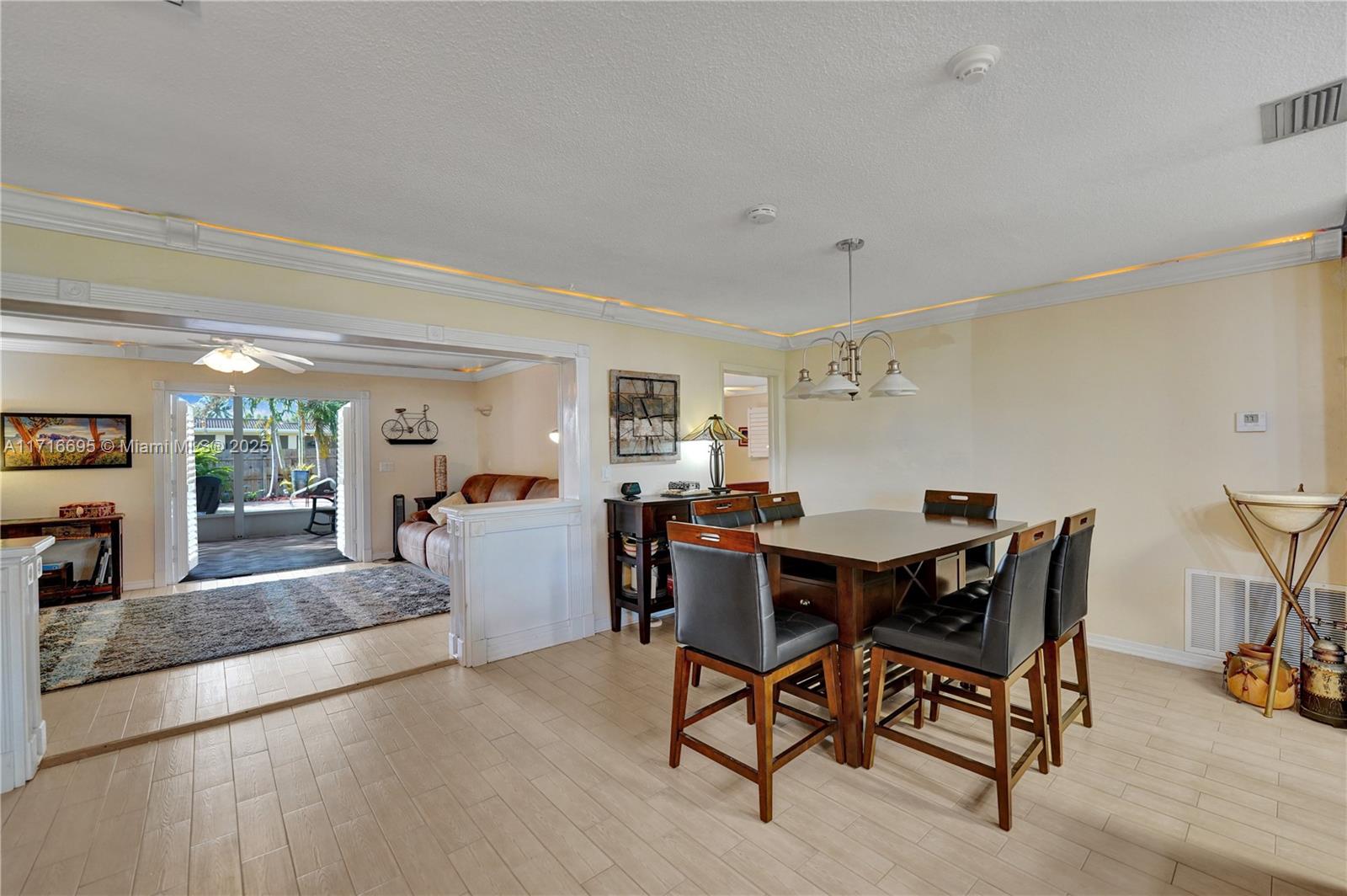 This 3 BR 2 Bath home features a kitchen with quartz countertops/ backsplash, and custom cabinets. The home also has custom tile floors. Throughout the home, there is crown molding with lighting in the living room, dining room, den, and two of the bedrooms. The windows and doorways have custom molding, and plantation shutters. The living room, dining room, den, and one bedroom have faux wood ceramic floors. The bathrooms are remodeled, including a soaking tub & large shower with four body sprays in the primary bathroom. Walk-in closets with built-ins. The large screened-in porch and the pergola in the yard by the pool will provide ample outdoor living space, and the tropical landscaping throughout the fenced-in yard creates a lush, private environment. Close to the beach,shopping,airport