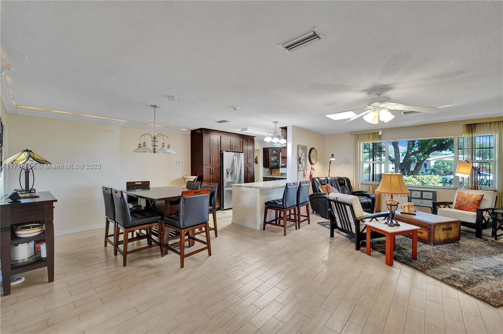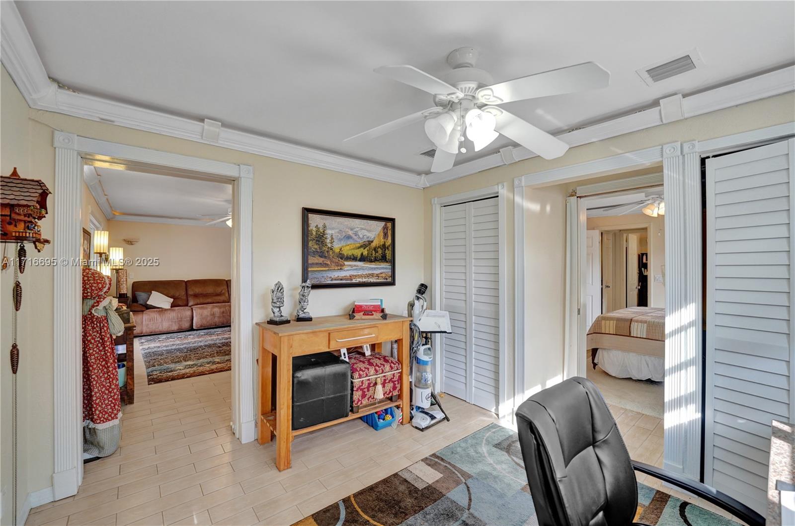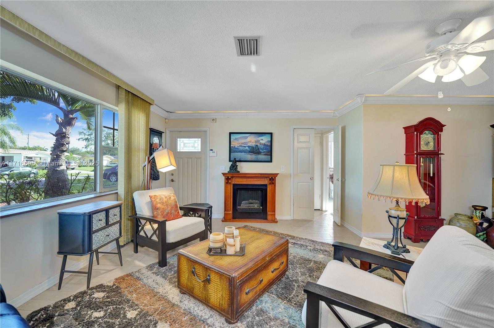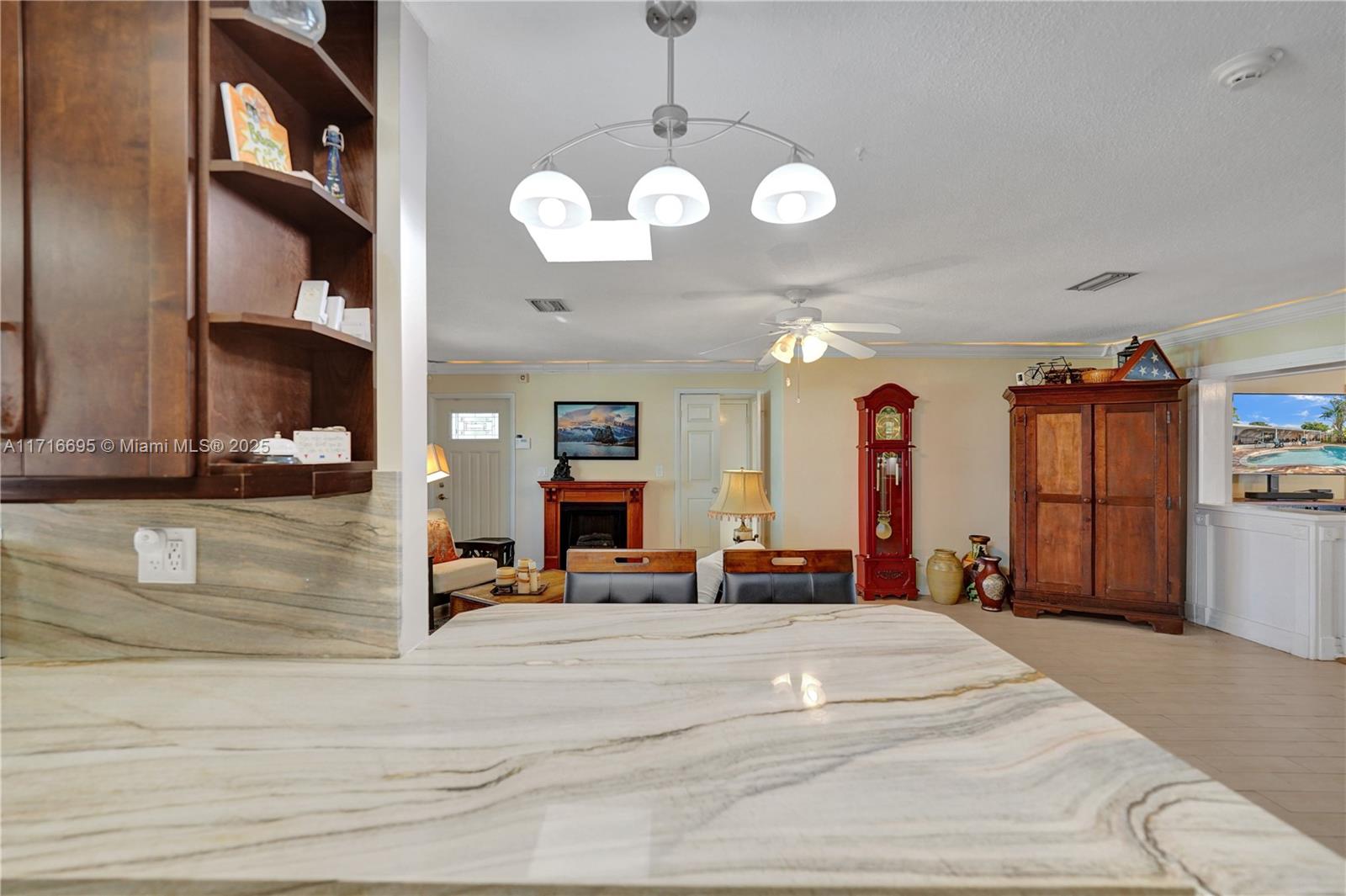 This 3 BR 2 Bath home features a kitchen with quartz countertops/ backsplash, and custom cabinets. The home also has custom tile floors. Throughout the home, there is crown molding with lighting in the living room, dining room, den, and two of the bedrooms. The windows and doorways have custom molding, and plantation shutters. The living room, dining room, den, and one bedroom have faux wood ceramic floors. The bathrooms are remodeled, including a soaking tub & large shower with four body sprays in the primary bathroom. Walk-in closets with built-ins. The large screened-in porch and the pergola in the yard by the pool will provide ample outdoor living space, and the tropical landscaping throughout the fenced-in yard creates a lush, private environment. Close to the beach,shopping,airport
