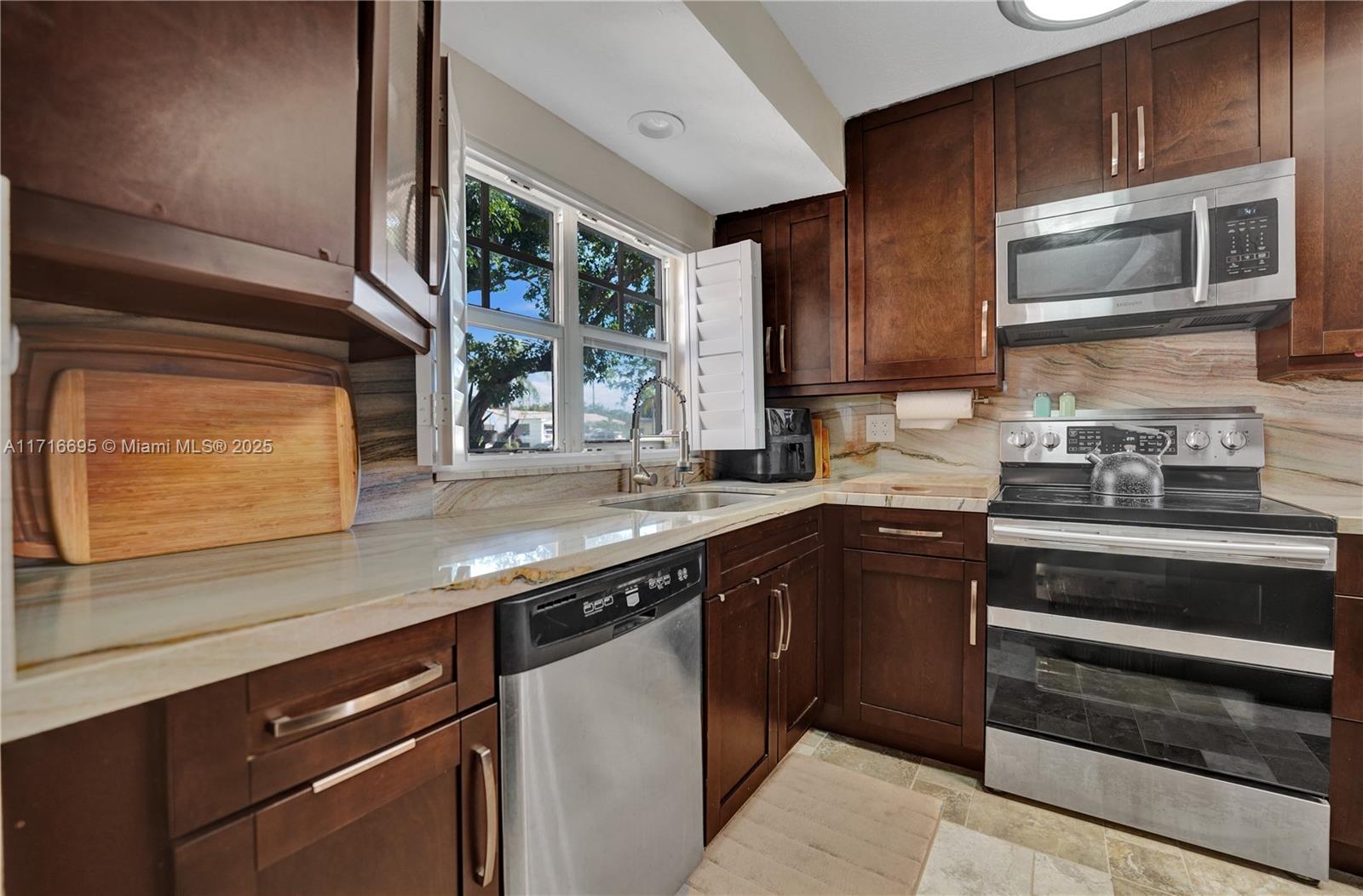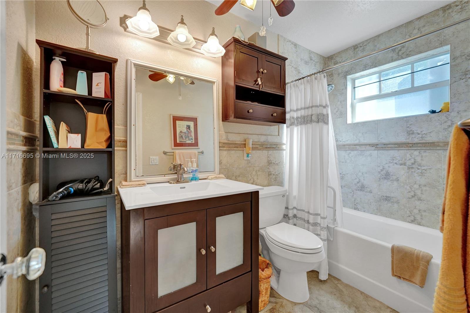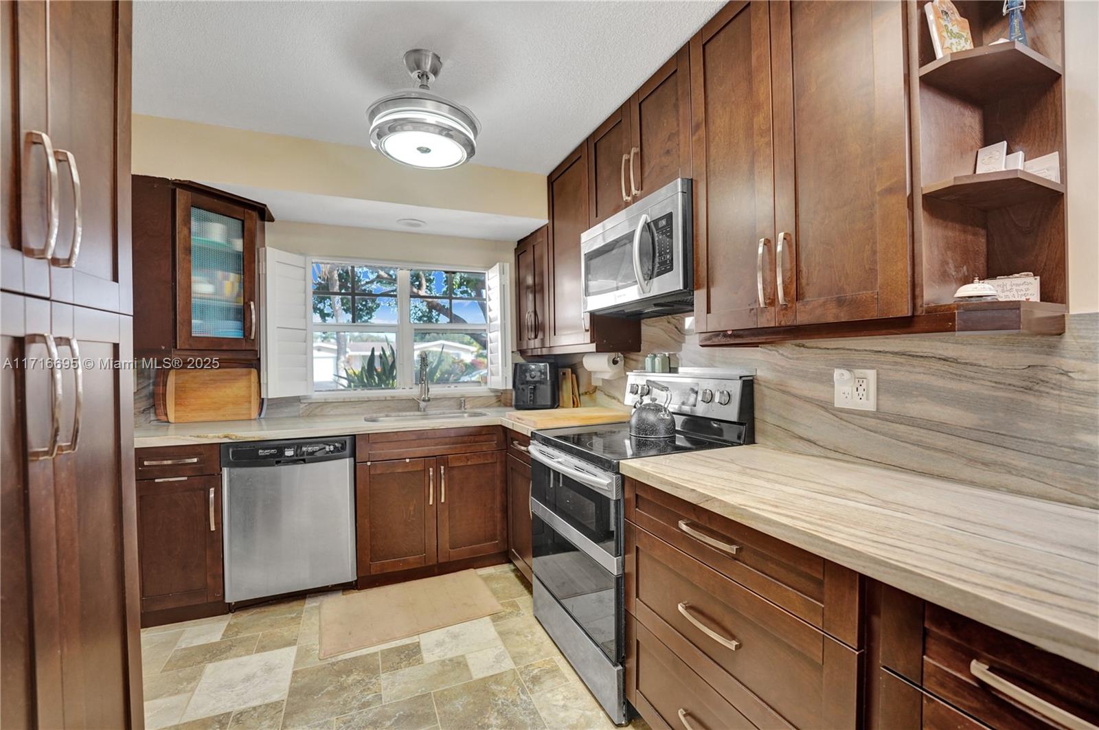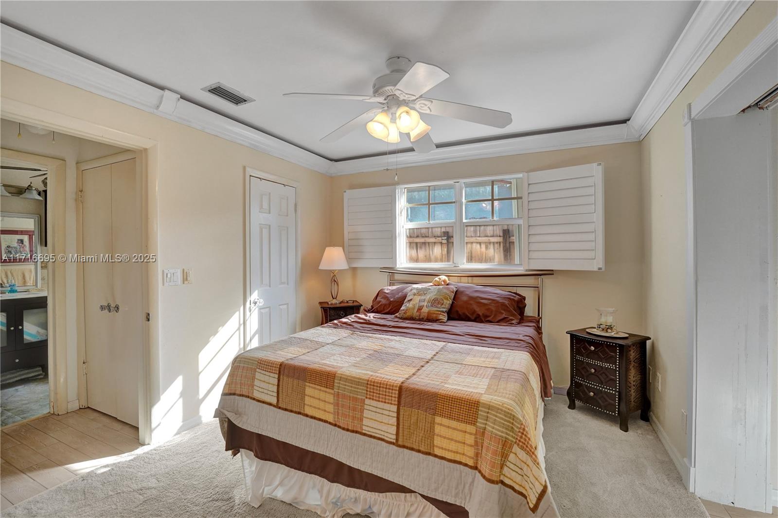 This 3 BR 2 Bath home features a kitchen with quartz countertops/ backsplash, and custom cabinets. The home also has custom tile floors. Throughout the home, there is crown molding with lighting in the living room, dining room, den, and two of the bedrooms. The windows and doorways have custom molding, and plantation shutters. The living room, dining room, den, and one bedroom have faux wood ceramic floors. The bathrooms are remodeled, including a soaking tub & large shower with four body sprays in the primary bathroom. Walk-in closets with built-ins. The large screened-in porch and the pergola in the yard by the pool will provide ample outdoor living space, and the tropical landscaping throughout the fenced-in yard creates a lush, private environment. Close to the beach,shopping,airport