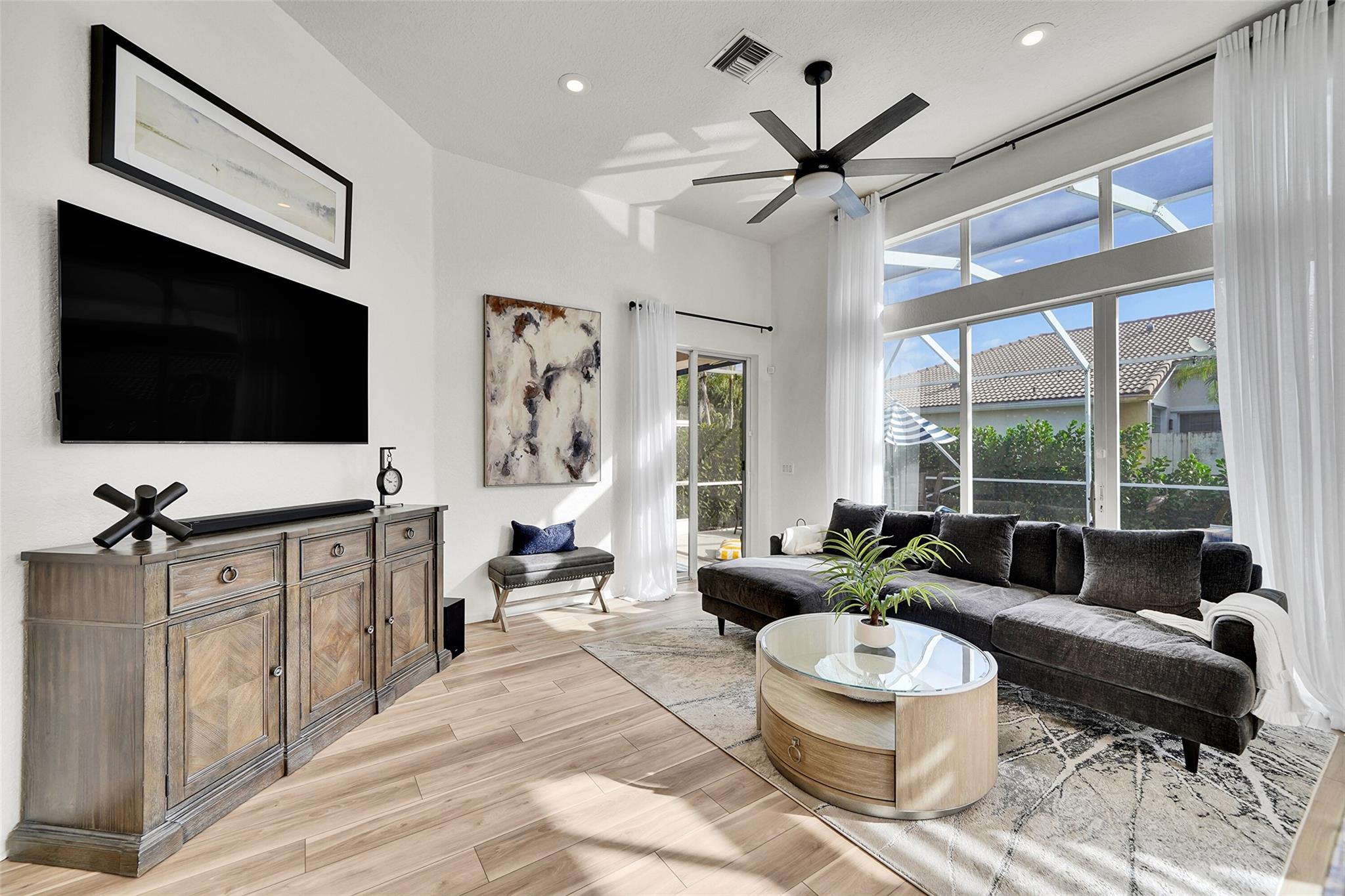 Discover this beautifully remodeled pool home, featuring 3 spacious bedrooms, 2 full bathrooms, 2-car garage with a 2021 roof and accordion shutters throughout. Step inside to find stunning vinyl flooring and updated modern doors, sleek zebra shades, remodeled open kitchen, bonus room for either a 4th room, office/den. The primary suite includes 2 large walk-in closets and a luxurious new bathroom with a separate shower, soaking tub, and double sinks, along with a remodeled 2nd bathroom. Enjoy Florida living with an enclosed outdoor lanai covered patio perfect for entertaining or relaxing by the pool. The home's upgraded landscaping enhances curb appeal, with a new hurricane-rated front door. This property combines modern elegance with tons of upgrades. Perfect place to call home.