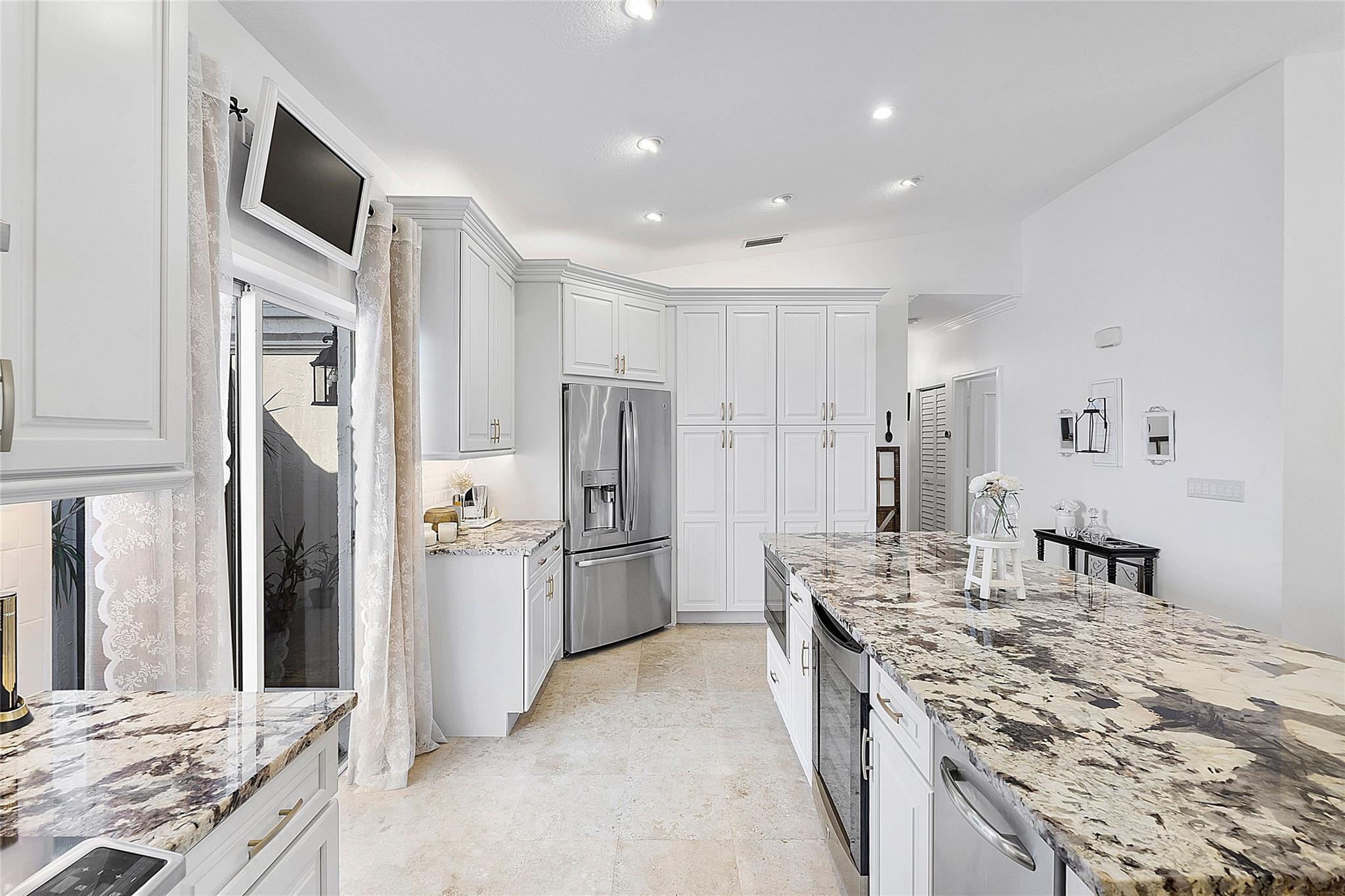 Rarely available home in The Mews of Cypress Head. Don't miss this beautifully remodeled 3 Bed 2 Bath home with a large backyard and screened in covered patio! Upgrades include fully remodeled kitchen with top-of-the-line appliances, wine fridge, microwave drawer, water filtration system, travertine marble & engineered wood floors, large primary bedroom with sky lights, two car garage, fruit trees, and more! The owner spared no expense to make this a fully functional smart home! Lutron Smart Lighting Control System in the house as well as the landscape lighting System. The low HOA includes lawn/landscaping as well as a pool and tennis courts. Enjoy the Parkland lifestyle, close to the Equestrian Center, Parks, Dog Parks, A+ Schools!