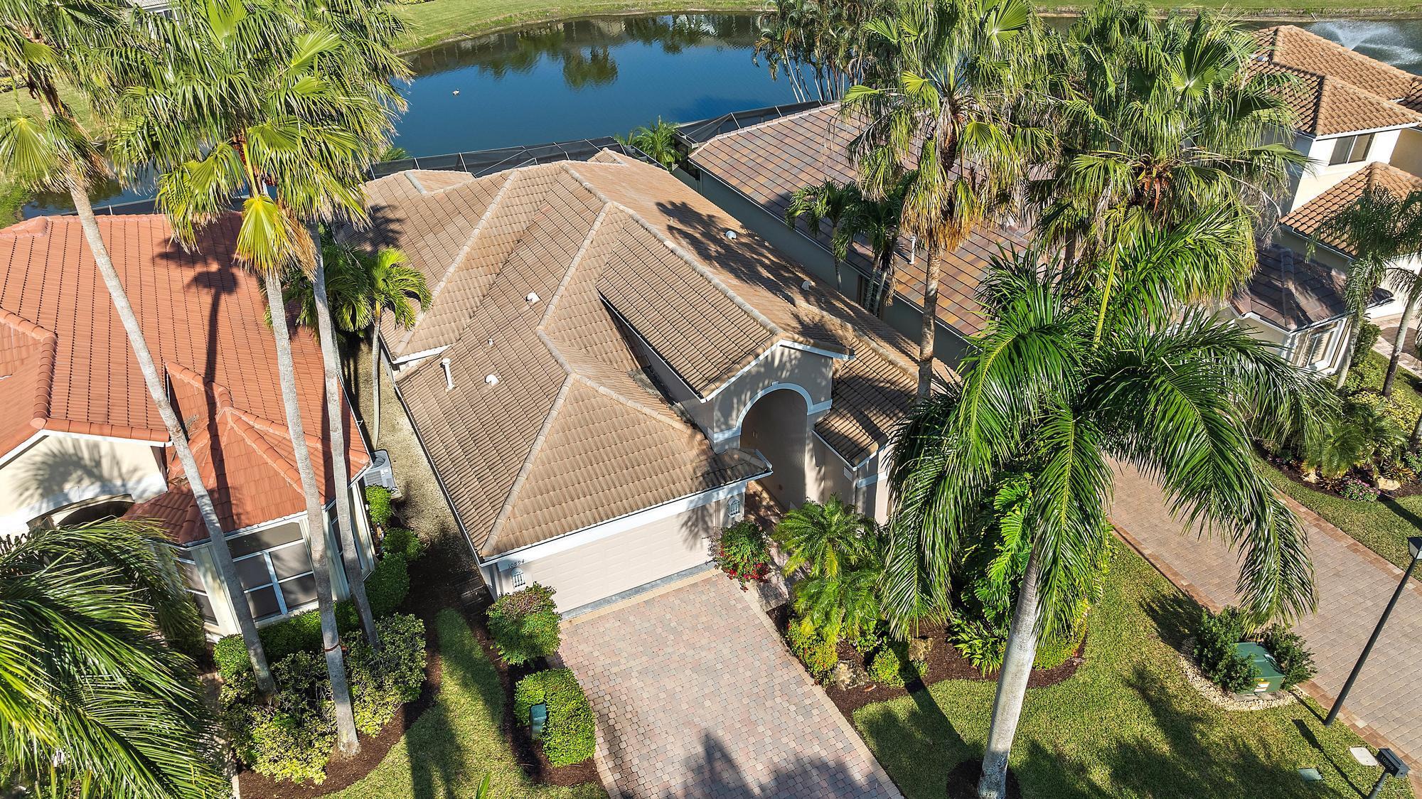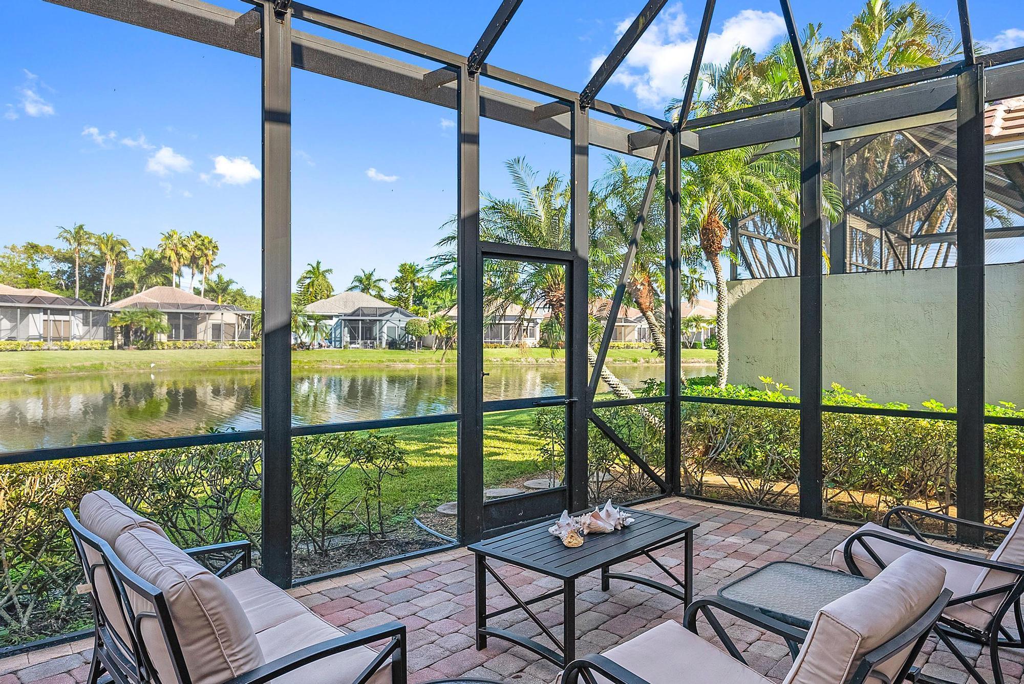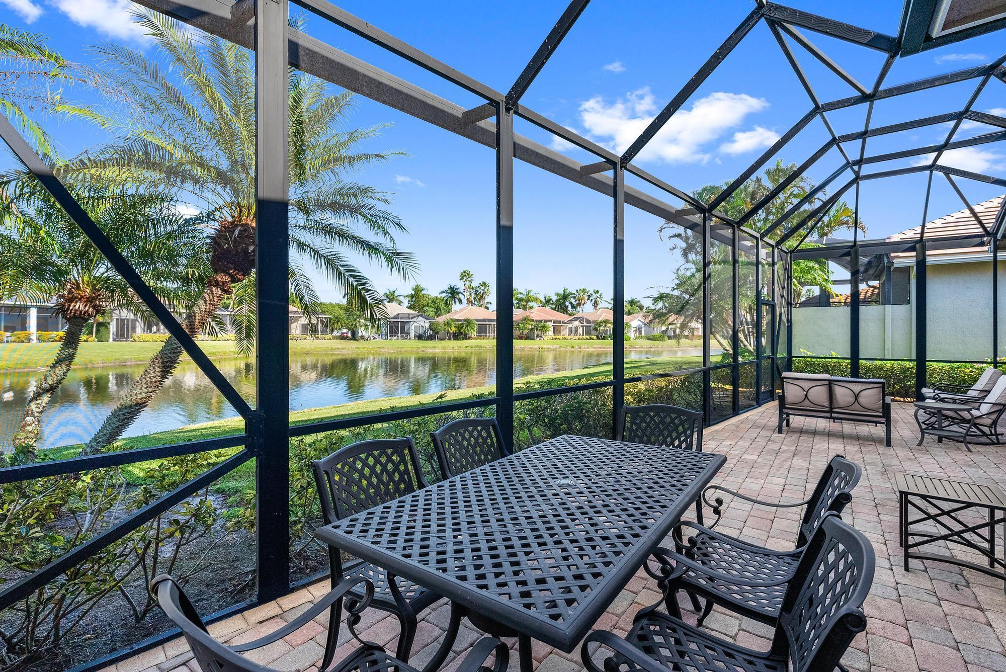 BRAND NEW 2025 ROOF! With 50 FEET OF WATER FRONTAGE, this 3BR/2.5BA upgraded home expands beautifully to the outdoors. Enjoy serene water views from this 2200 SF single-family home. The popular Hamilton floor plan offers soaring ceilings, and generous space. Accordian shutters and Impact Glass double front doors provide ample hurricane protection. Light, bright, and neutral, this immaculate home boasts a redone primary bath, upgraded kitchen with stainless appliances, granite counters, and elegant subway tile backsplash. The large screened enclosure provides fabulous outdoor living space, overlooking the premium lake view. Many upgrades throughout the property: