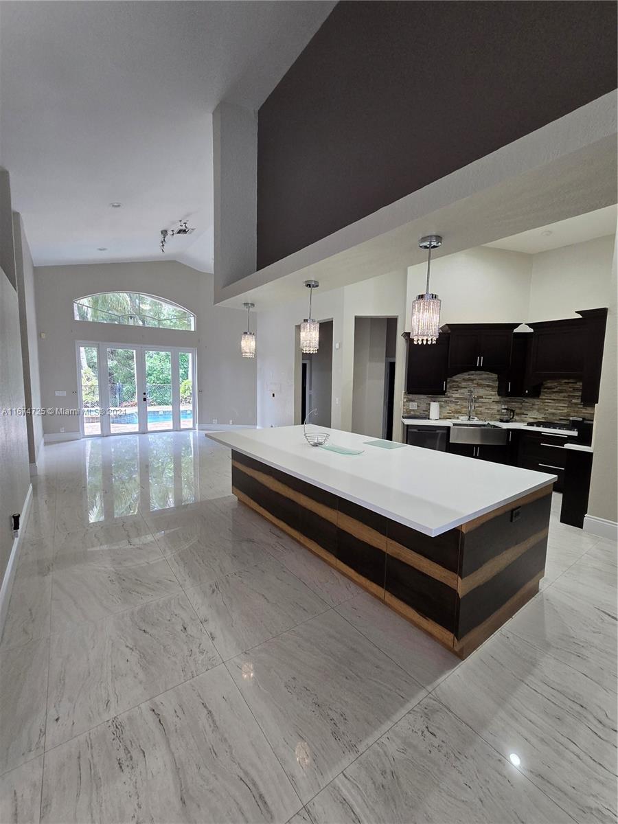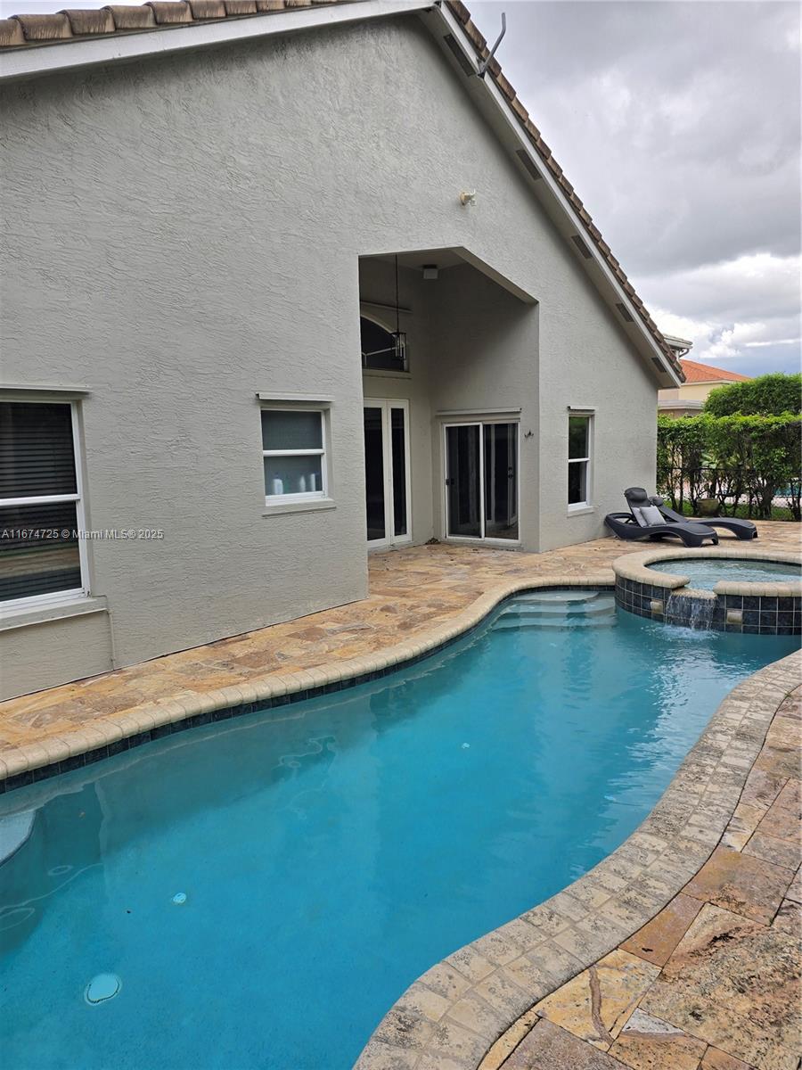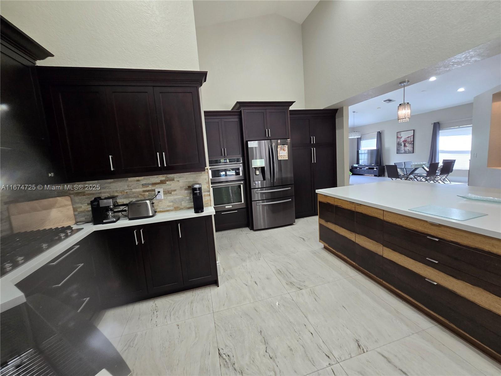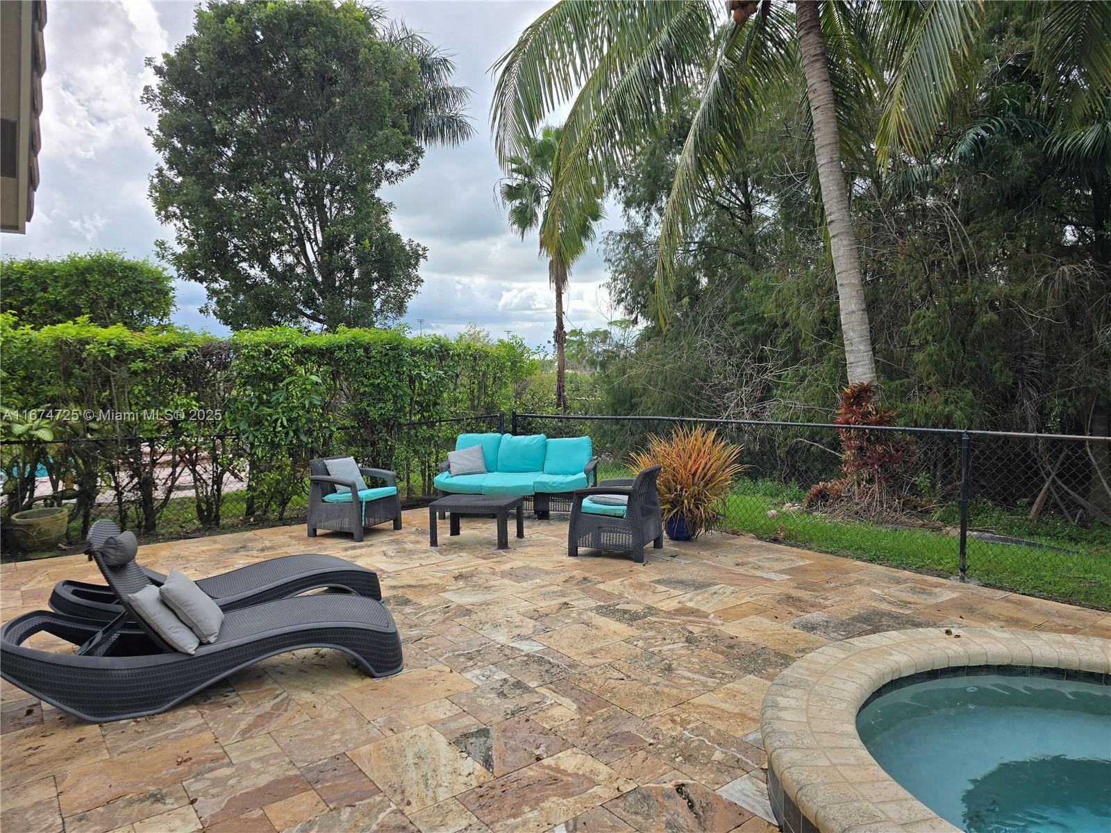 This stunning five-bedroom, three-bathroom, with two car garage home in the desirable Pembroke Shores neighborhood offers a perfect blend of comfort, style and functionality. The home boasts an open spacious split floor plan with vaulted ceilings, 32x32 porcelain tiles throughout the living areas, a large open style kitchen with white quartz counter tops, a huge island with extra storage, stainless steel appliances, a gas stove, and ample cabinet space. This home has an elegant main suite with his and hers closets and a large bathroom with a split tub and shower. Rear double French doors lead to a Free-form pool/spa with natural stone pavers, which overlooks a natural preserve with wooded views. The backyard is ideal for entertaining. Located near top-rated schools, shopping, and dining.