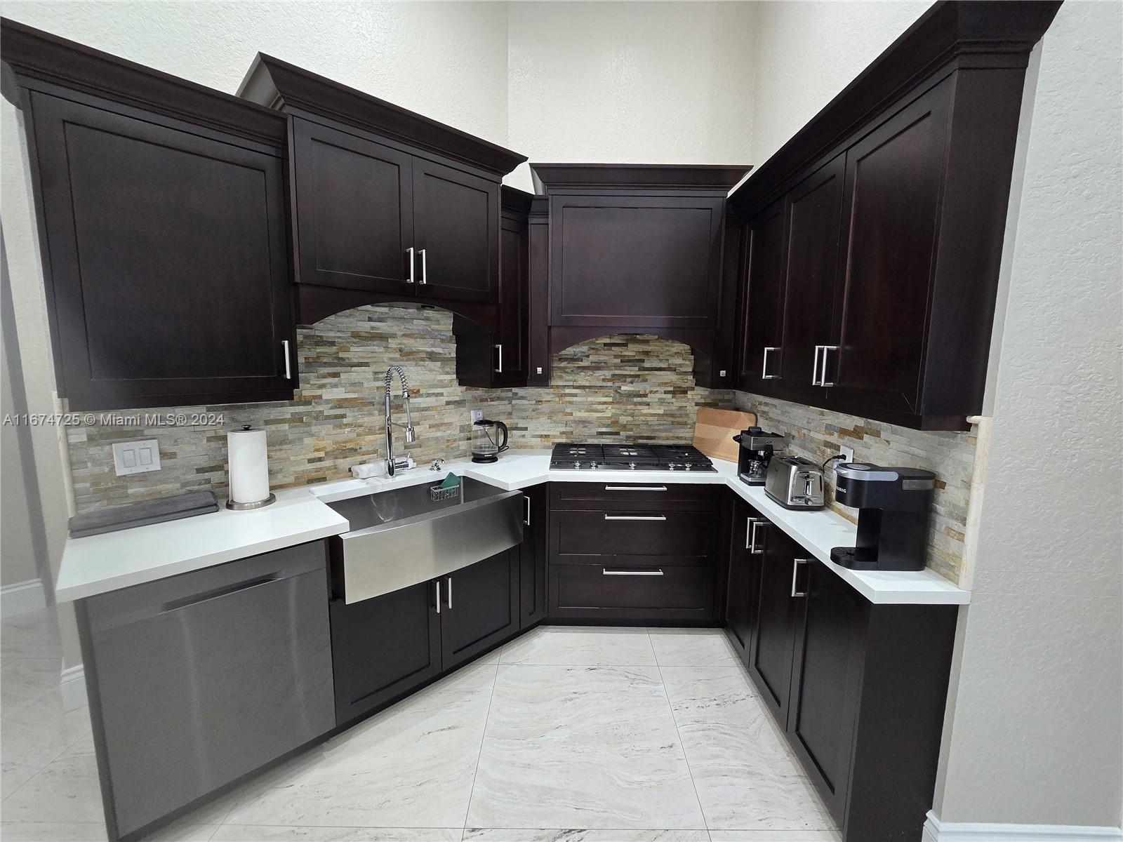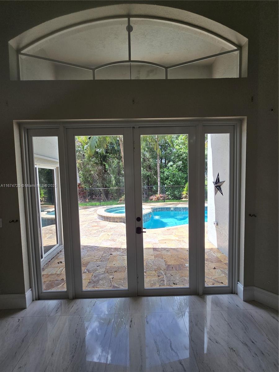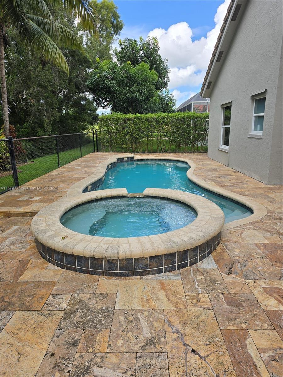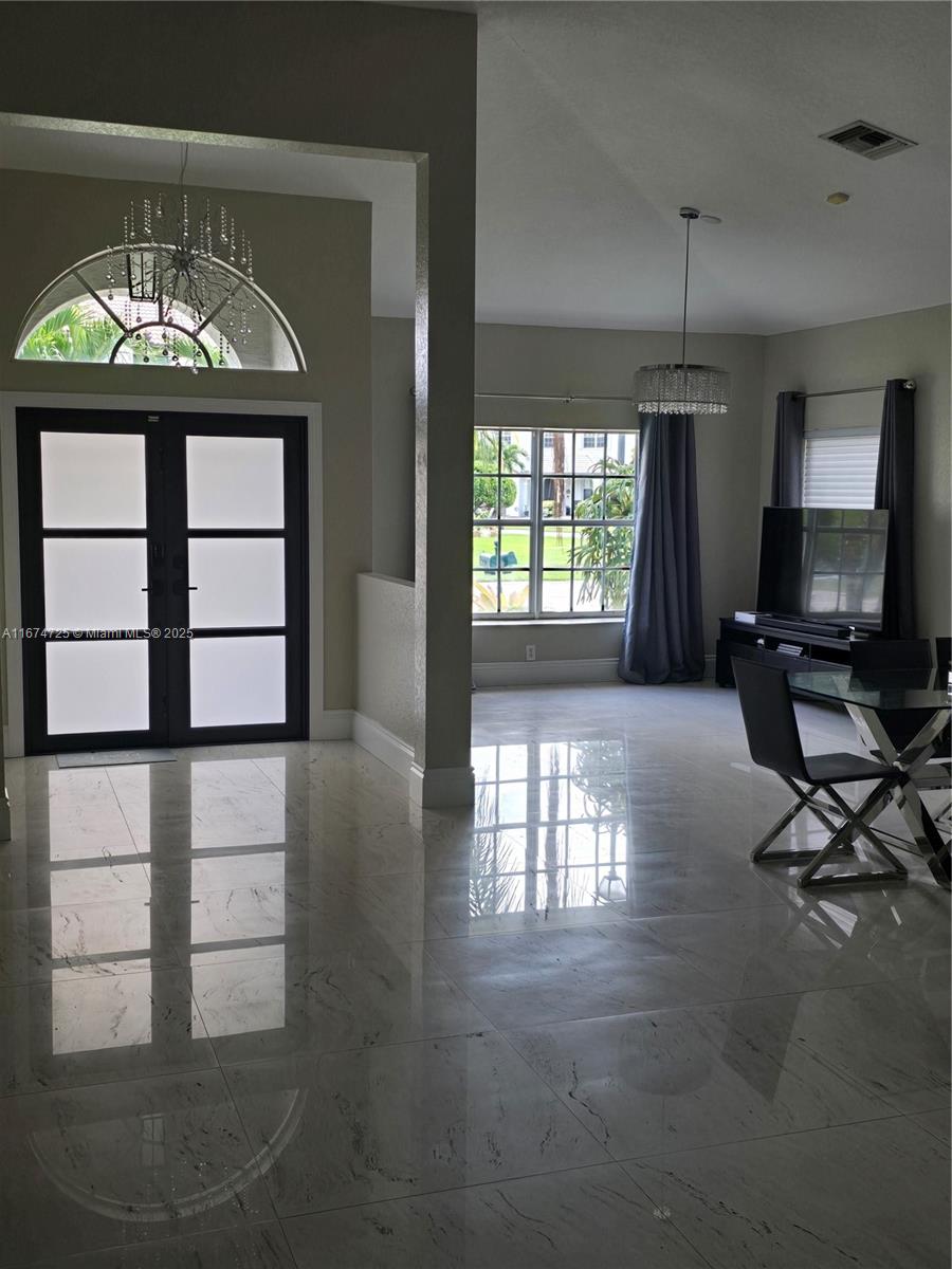 This stunning five-bedroom, three-bathroom, with two car garage home in the desirable Pembroke Shores neighborhood offers a perfect blend of comfort, style and functionality. The home boasts an open spacious split floor plan with vaulted ceilings, 32x32 porcelain tiles throughout the living areas, a large open style kitchen with white quartz counter tops, a huge island with extra storage, stainless steel appliances, a gas stove, and ample cabinet space. This home has an elegant main suite with his and hers closets and a large bathroom with a split tub and shower. Rear double French doors lead to a Free-form pool/spa with natural stone pavers, which overlooks a natural preserve with wooded views. The backyard is ideal for entertaining. Located near top-rated schools, shopping, and dining.