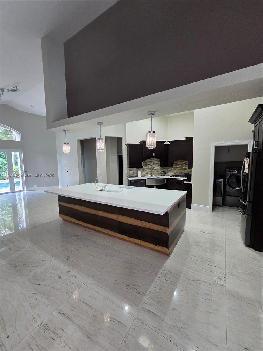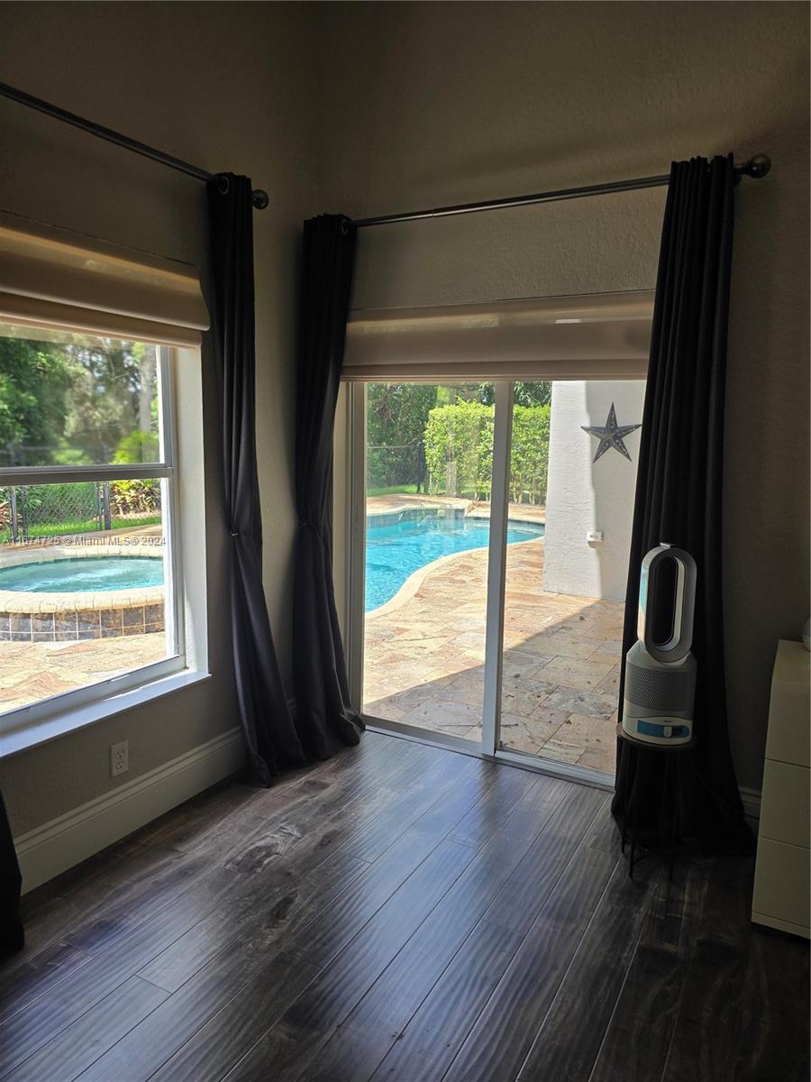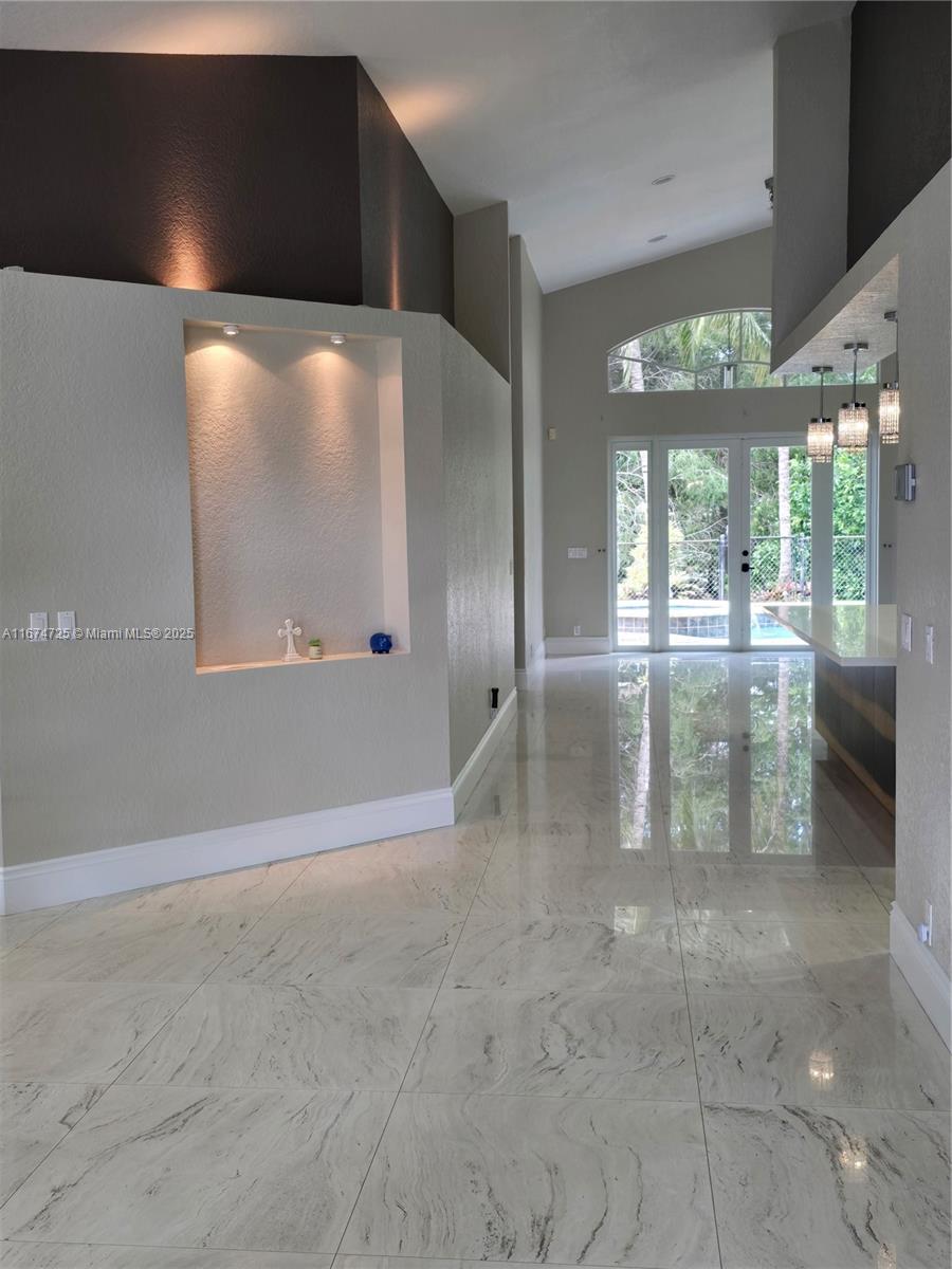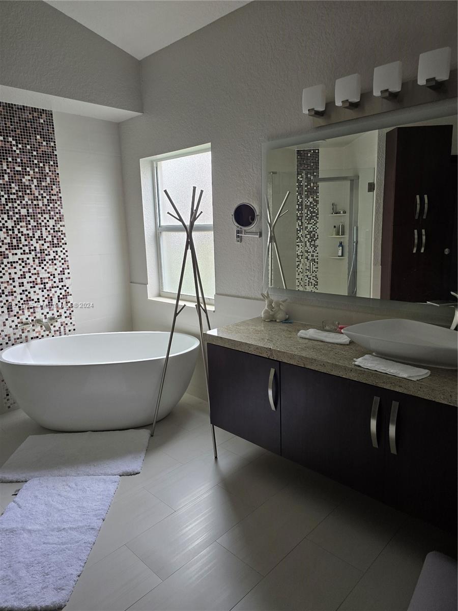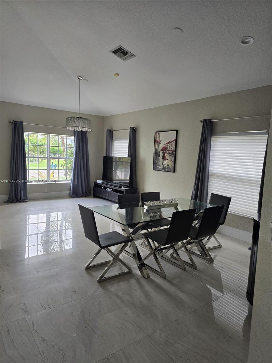 This stunning five-bedroom, three-bathroom, with two car garage home in the desirable Pembroke Shores neighborhood offers a perfect blend of comfort, style and functionality. The home boasts an open spacious split floor plan with vaulted ceilings, 32x32 porcelain tiles throughout the living areas, a large open style kitchen with white quartz counter tops, a huge island with extra storage, stainless steel appliances, a gas stove, and ample cabinet space. This home has an elegant main suite with his and hers closets and a large bathroom with a split tub and shower. Rear double French doors lead to a Free-form pool/spa with natural stone pavers, which overlooks a natural preserve with wooded views. The backyard is ideal for entertaining. Located near top-rated schools, shopping, and dining.
