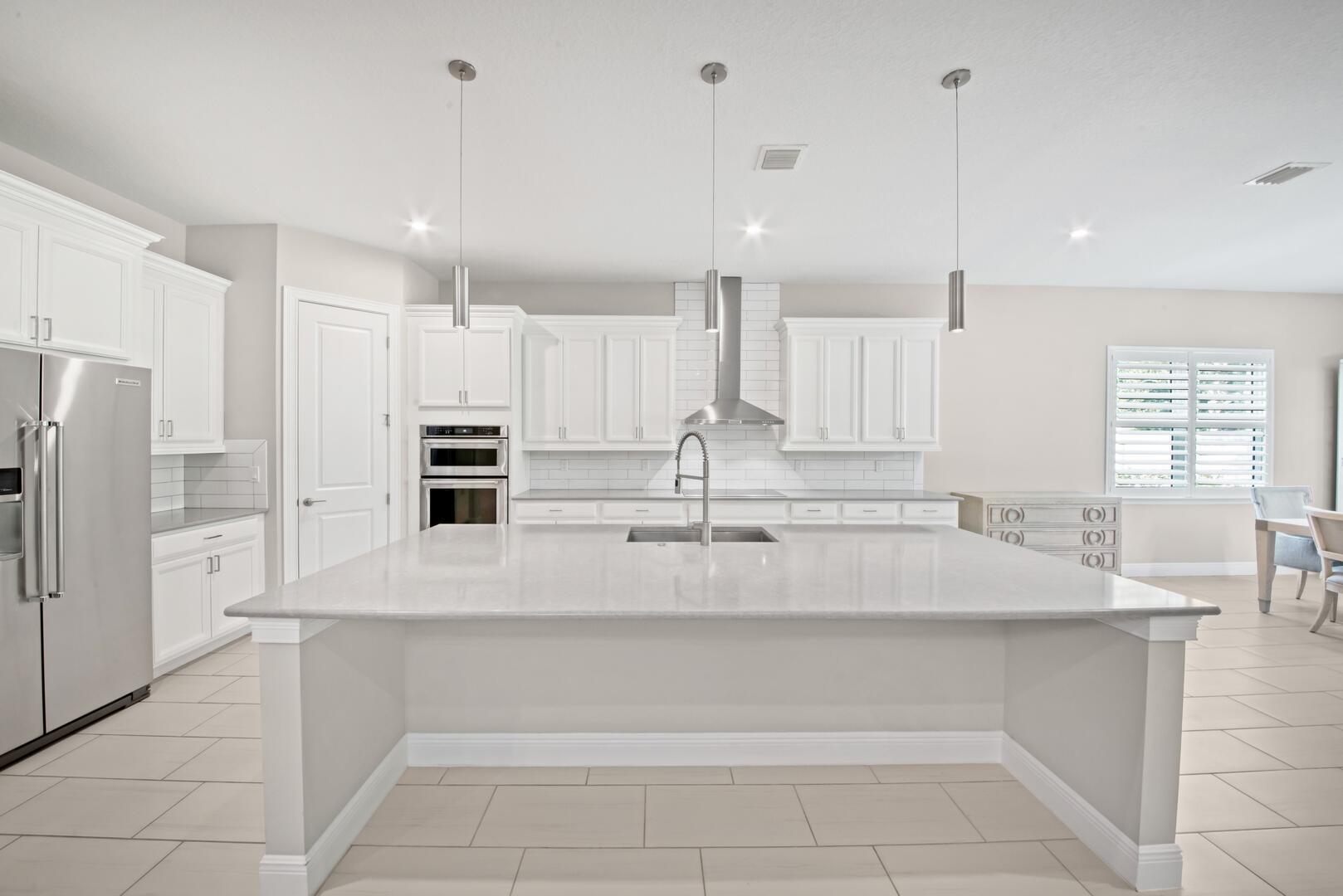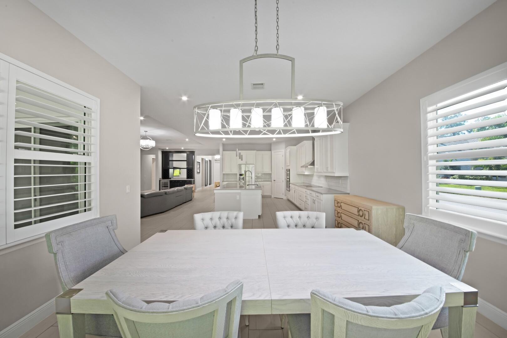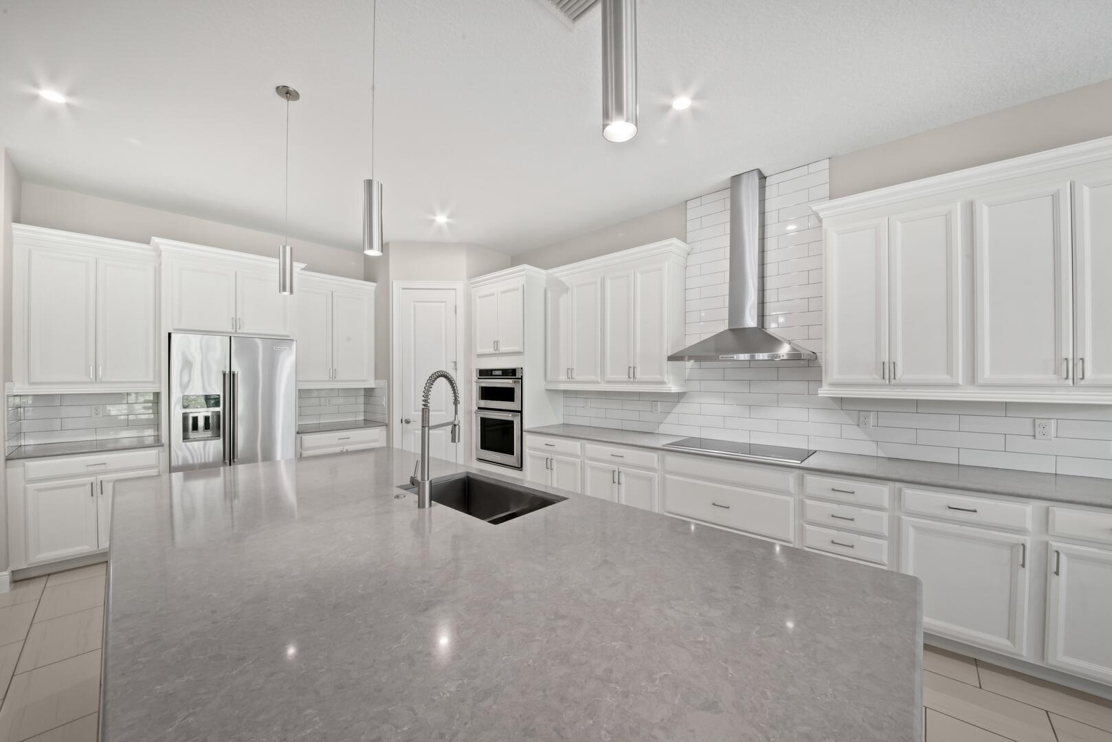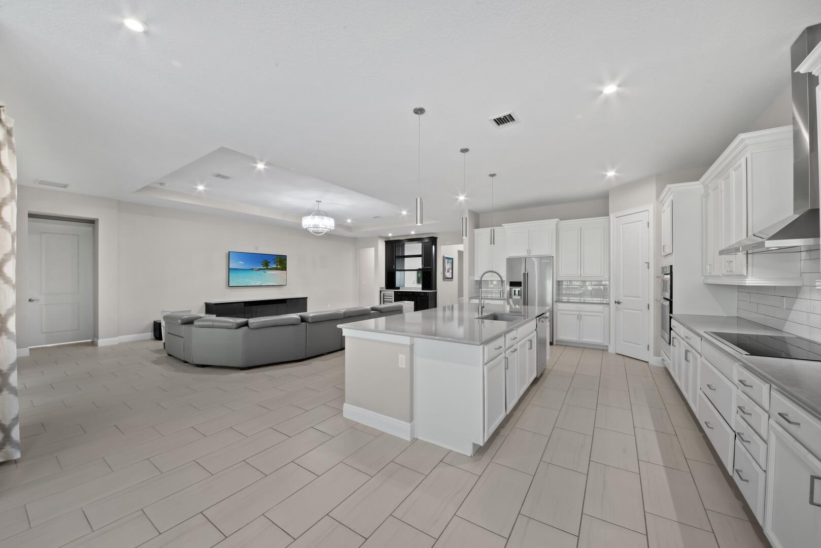 Welcome to this exquisite 4-bedroom, 3.5-bathroom single-story home, designed to impress with every detail. Nestled on a private lot backing to a serene preserve with no rear neighbors, this residence offers the ultimate in privacy, comfort, and contemporary luxury. Upon entering the inviting foyer, you'll be captivated by the open floorplan featuring neutral flooring, coffered ceilings, and custom lighting. The home's smart features include a Ring system and advanced smart home technology. Impact windows, a whole-house Generac generator, and a water softener provide security and convenience. The dream kitchen is a culinary masterpiece with classic white cabinetry, a tiled backsplash, stainless steel appliances, a wall oven, a walk-in pantry, pendant lighting, and a snack bar.