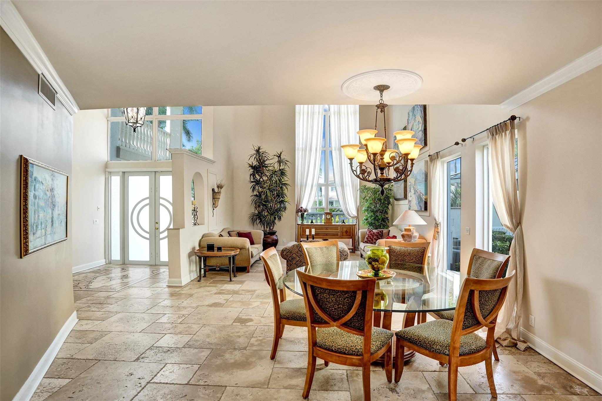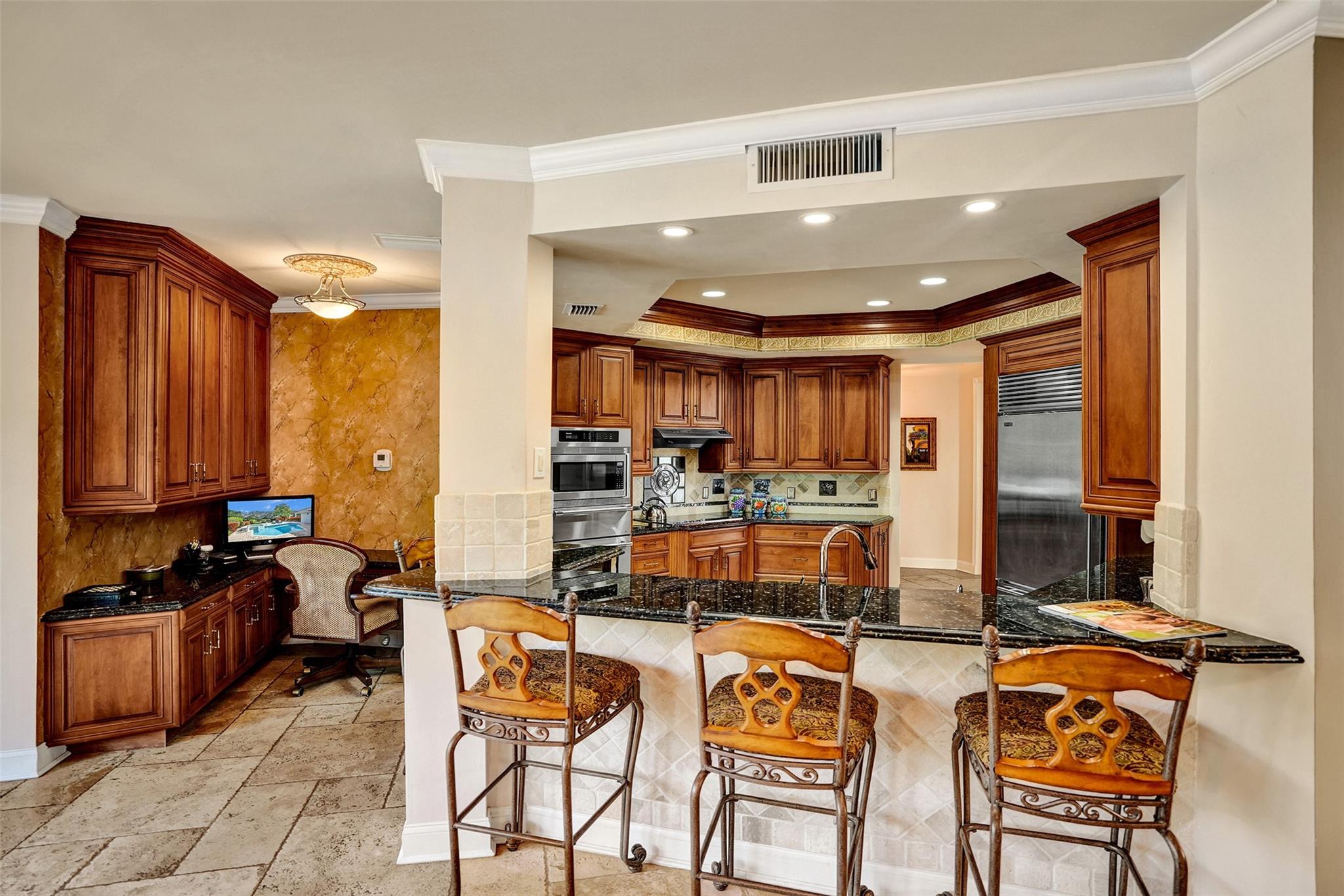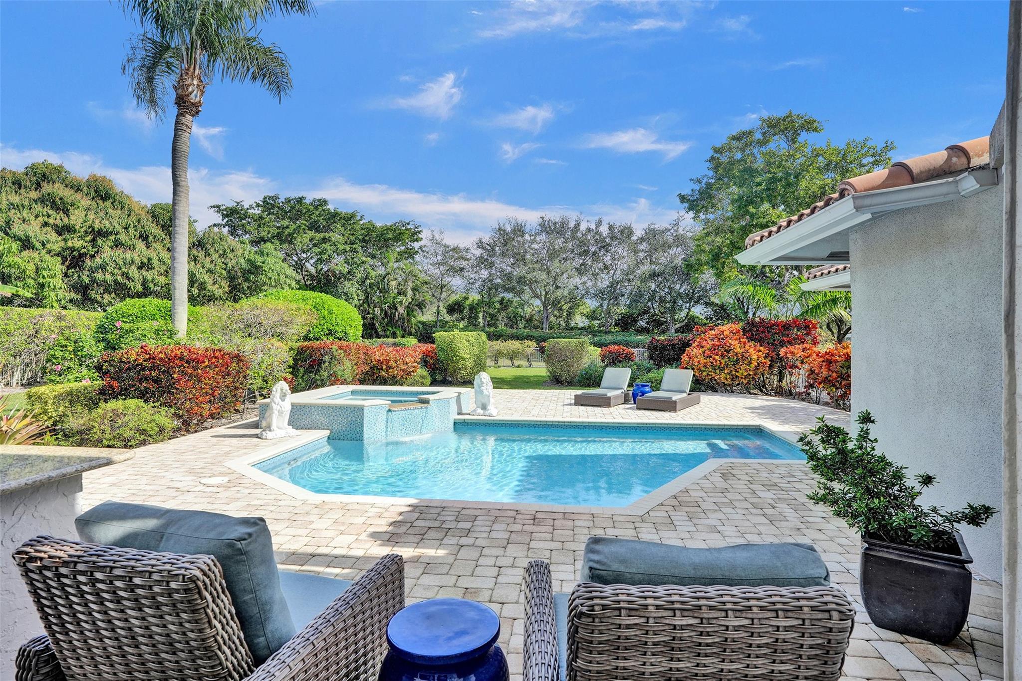 Excellent opportunity to experience luxury living in Woodfield Country Club. This 2-story home sits on an oversized private lot offering breathtaking landscaping and golf views. The kitchen is a delight, featuring stainless steel appliances, quartz countertops and custom inlaid backsplash. The master bedroom, located on the first floor, features spacious his and her custom closets and a sitting area overlooking the pool with lush landscaping. Elegant Jerusalem stone floors add charm to this unique home. Outdoors, enjoy the large brick paved patio, pool with spa and relax surrounded by colorful landscape. Impact windows and doors throughout adds security to this custom home. Make it yours!