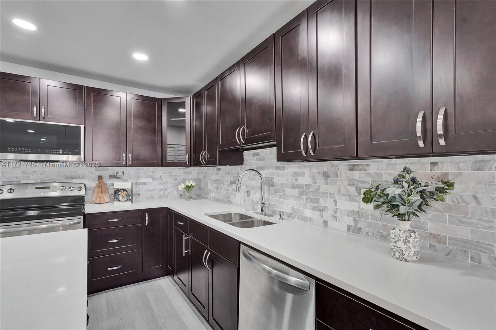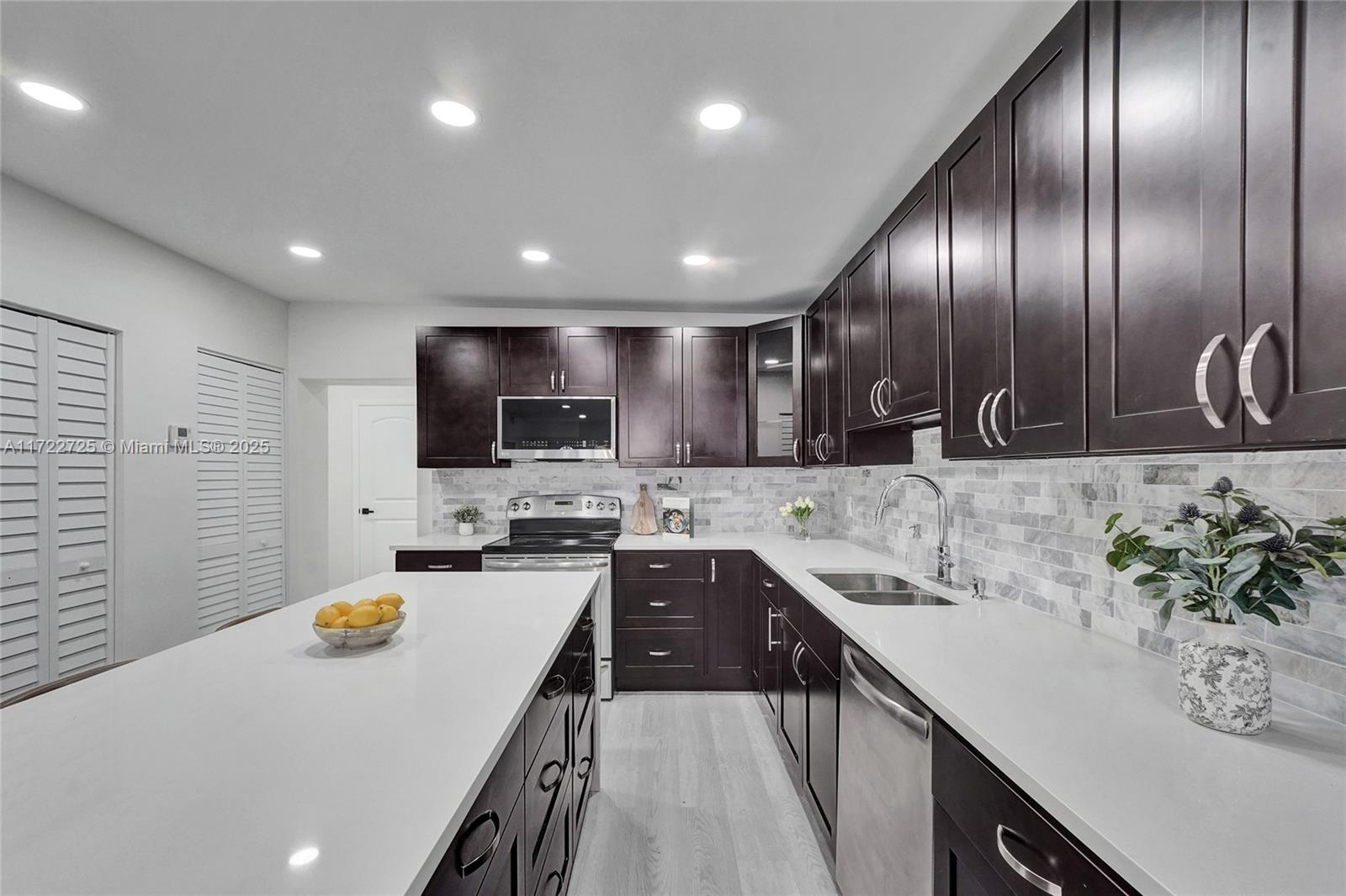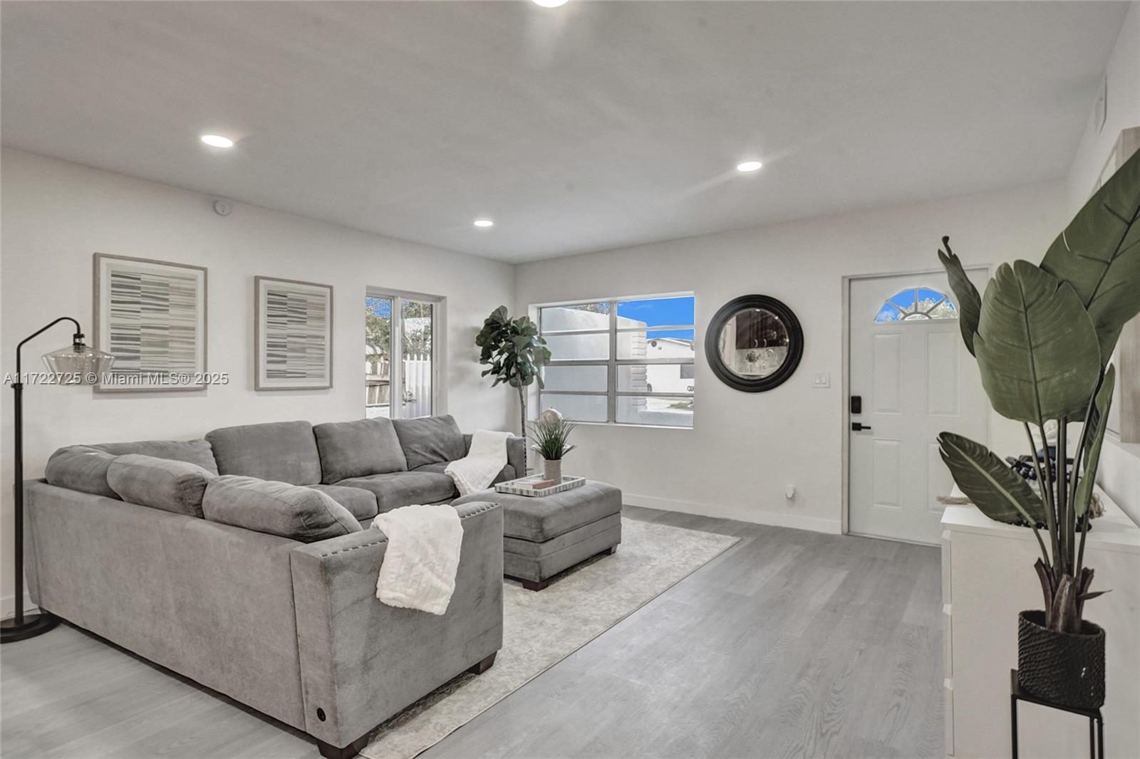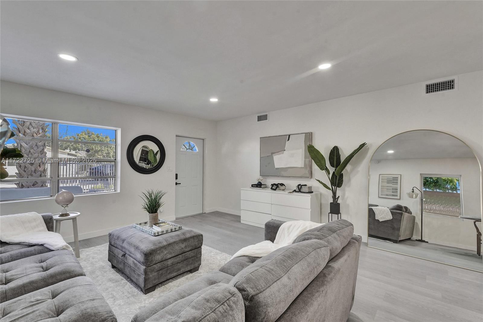 Modern living in this fully renovated 4/3 split floor plan in Miramar/West Park, over 1700 sq ft. It features all the bells and whistles. Gray wood-like vinyl floors throughout the home with a master suite, large walk in closet, spa-like luxurious bathroom with dual sinks, LED mirror, oversized porcelain tiles & gold fixtures. Enjoy modern upgrades like recess lighting throughout. Custom cabinets in the kitchen with a huge eat-in island with white Quartz waterfalls. You will love the electric gated entry for ultimate security & privacy. Palm trees and avocado tree creates a serene oasis you'll love. In law suite can be used as 4th bedroom or an efficiency that can be rented for $1300. Central location minutes from Miami, FLL, Hard Rock Stadium, malls & beaches. No HOA. Furniture included.