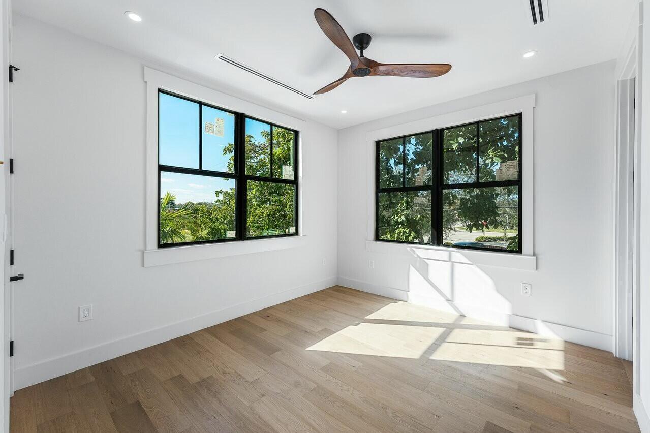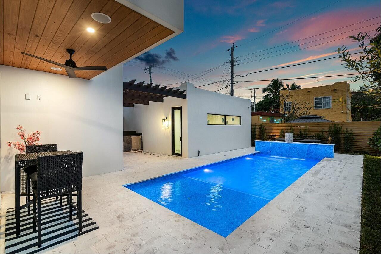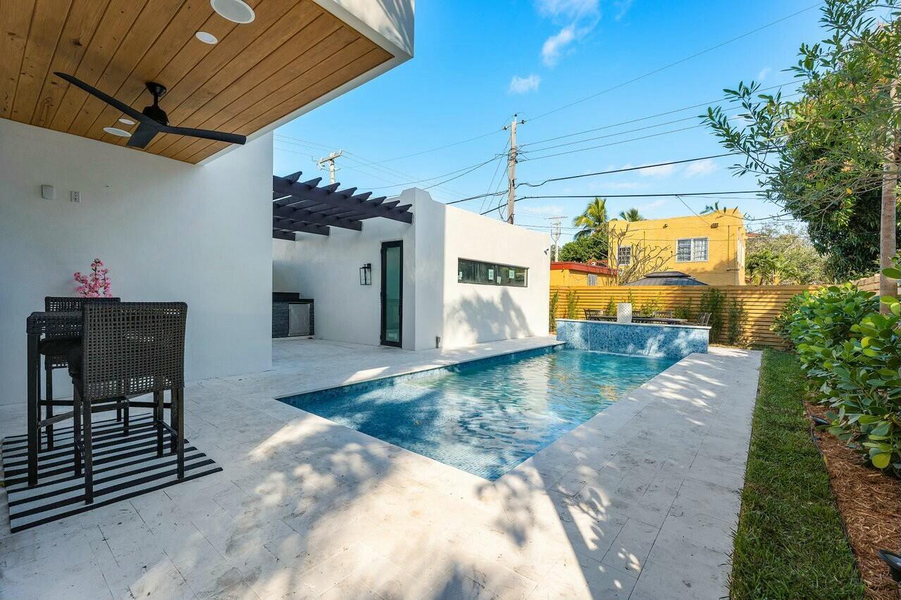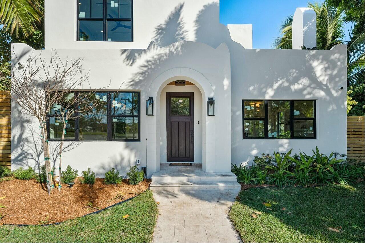 Discover unparalleled charm and sophistication in this brand-new Mission Revival home, ideally situated in the coveted College Park neighborhood of Lake Worth Beach. This architectural gem pays homage to the classic 1920s style while incorporating today's most sought-after modern amenities. From the moment you enter, you'll be greeted by soaring ceilings in the entryway that flood the space with natural light. The open-concept floor plan is anchored by a stunning chef's kitchen featuring top-of-the-line Thermador appliances, a quartz island, a pot filler, and a walk-in pantry with custom shelving. Perfect for entertaining or everyday living, the kitchen flows seamlessly into the great room and access the dining room via a butlers pantry.
