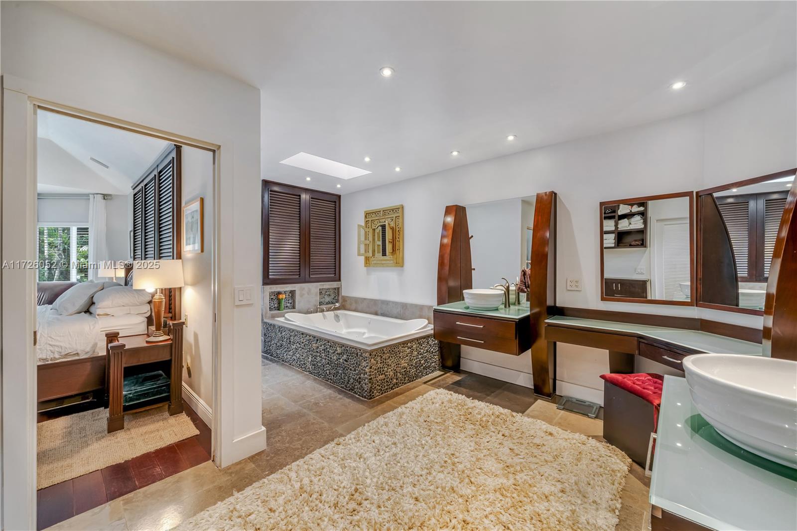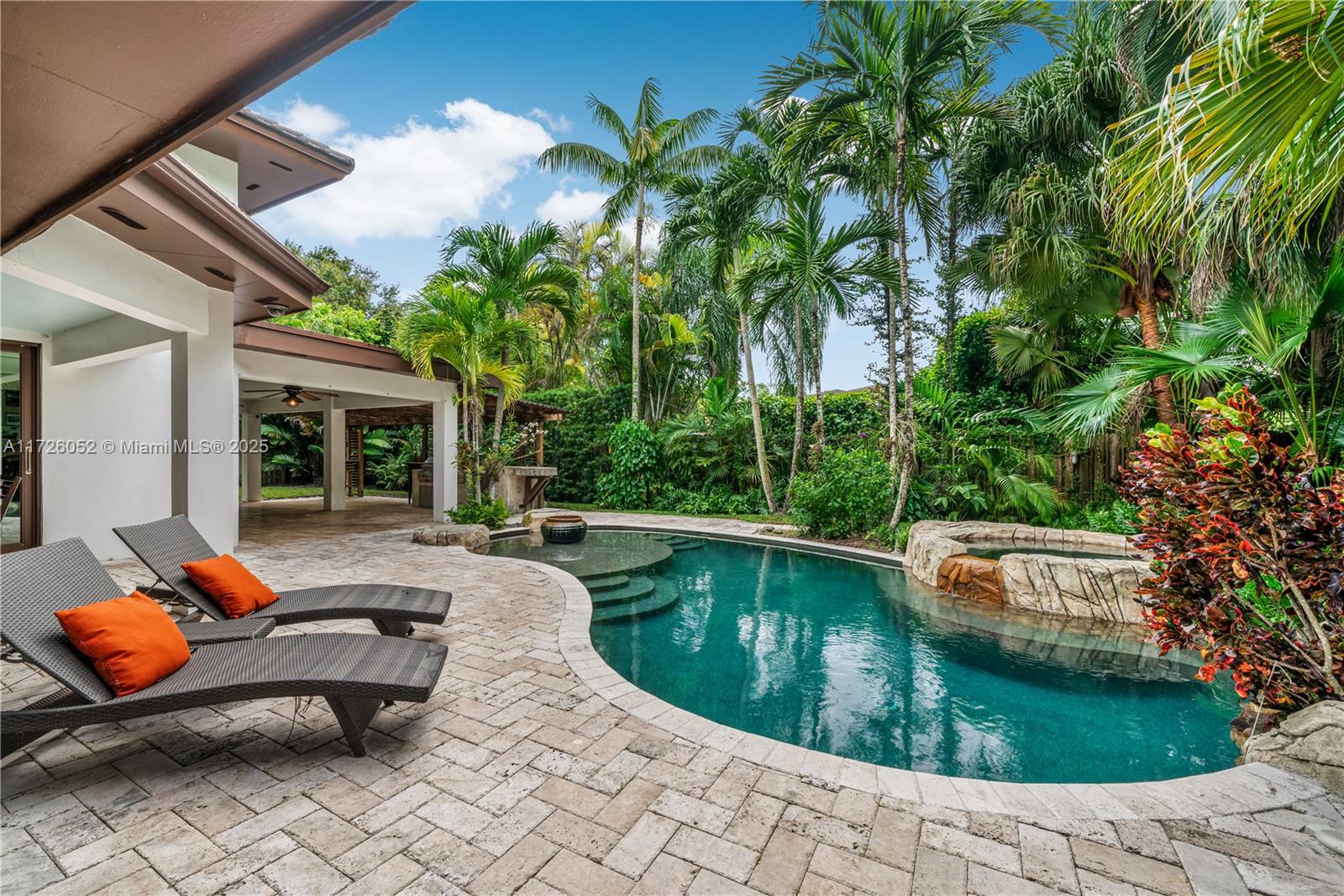 Repriced!! Custom Hollub home nestled on a quiet, verdant, no-traffic cul-de-sac in N. Pinecrest. Perfect floor plan, over 5,086 SF under roof w/4BR 3.5BA + 2 car gar. Spacious suite with lavish bath, steam shower, & jacuzzi tub + Media/Family RM + Guest RM w/ensuit bath on the first floor & powder room. Upstairs, there are two large bdrms with a Jack and Jill bath. Lots of natural light + 18" ceilings in the expensive open living/dining spaces; gourmet island kitchen, Thermador gas range, granite & SS appliances. Impact doors/windows connect indoor/outdoor living with large porches, a summer kitchen, a heated/cooled lagoon pool, an integrated hot tub, + a yard. Limestone & wood floors, fireplace. Close to schools & parks. An exceptional opportunity you won’t want to miss!
