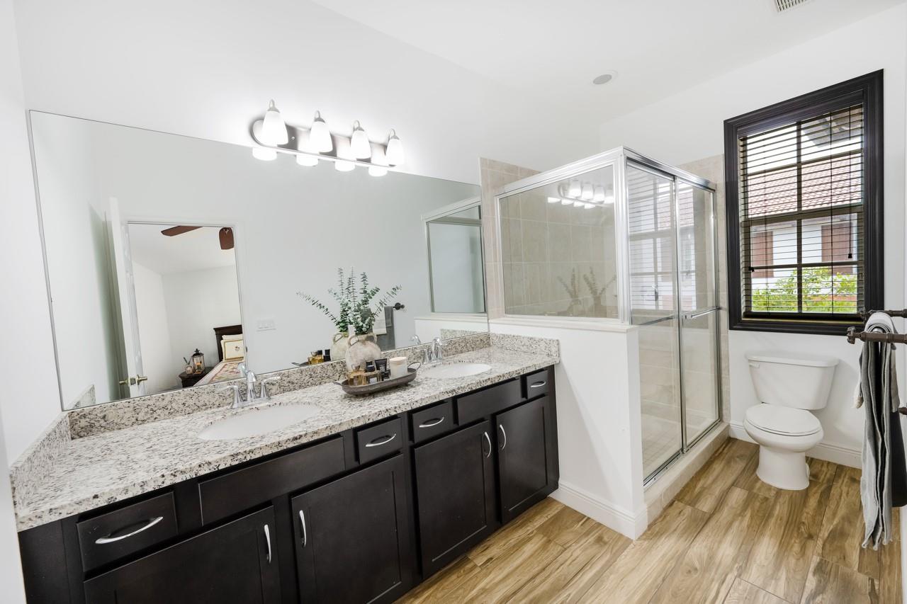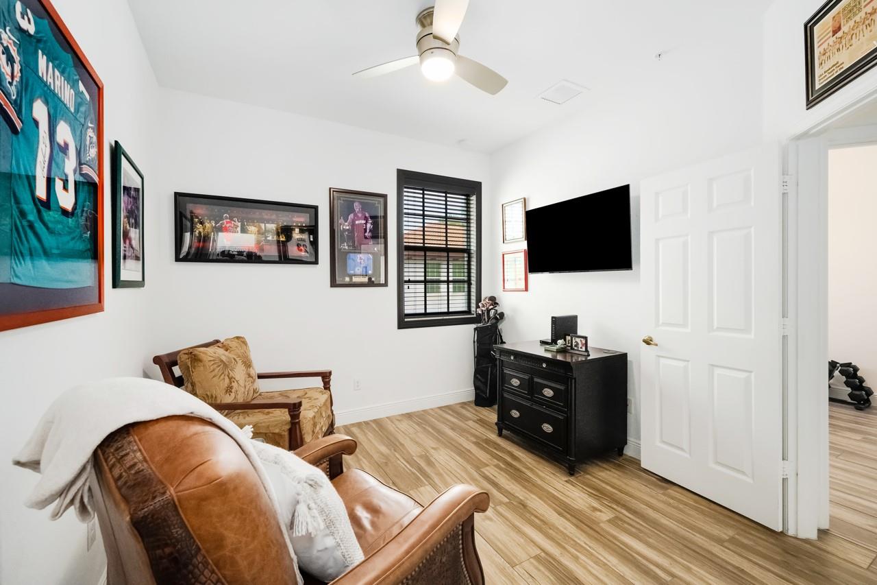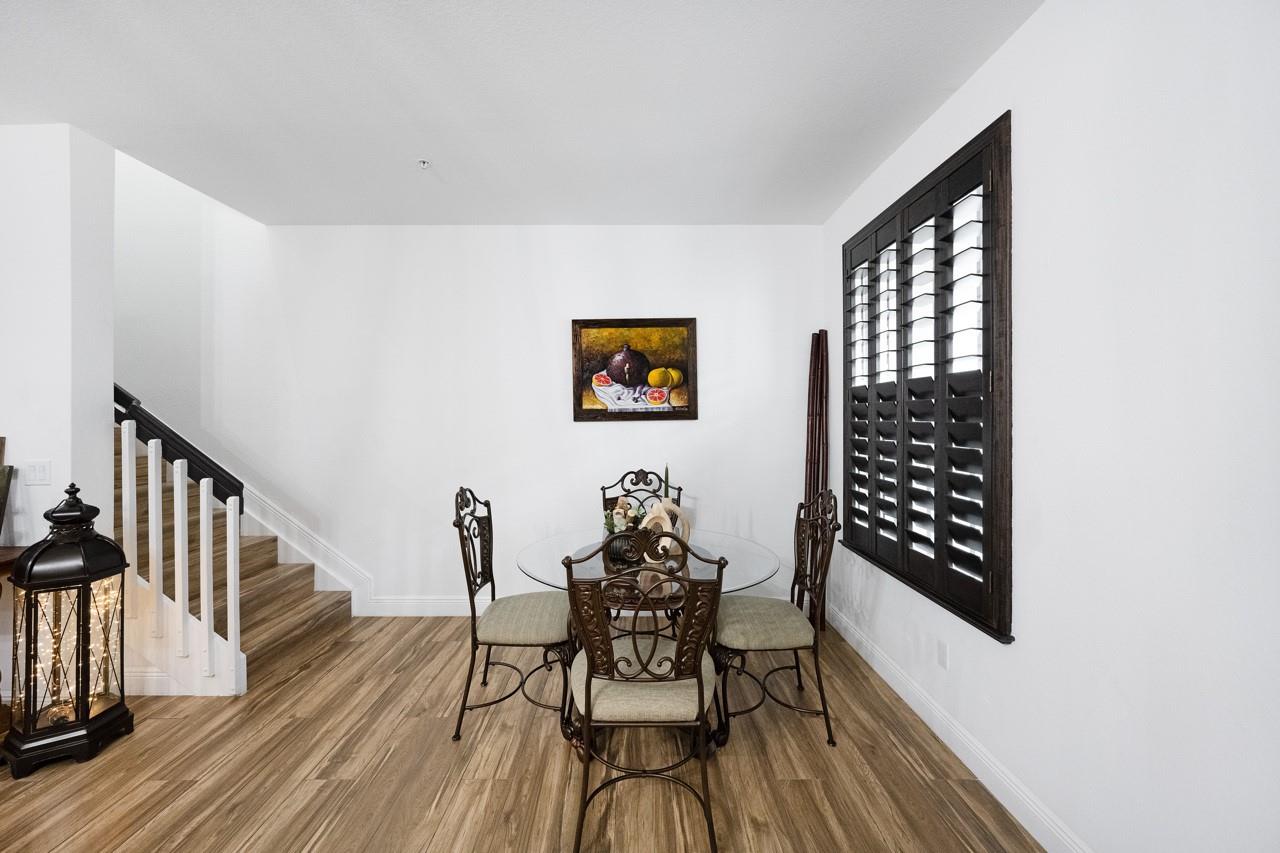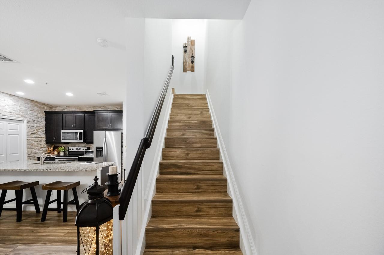This 3/2.5 2 car garage home has continuous wood grain porcelain tile flooring throughout. The kitchen is open and spacious, with plenty of cabinets, granite countertops, with a huge workspace on a peninsular bar, with ample seating. The kitchen backsplash flow into wall feature and entry to a large pantry. Window treatments include plantation shutters that match the color of the kitchen cabinets. Upstairs there are 3 bedrooms with 2 full bathrooms. There is also a loft that can be an entertainment area or serve as a 4th bedroom. The primary ensuite features a double sink and a walk-in shower. The primary has two large walk-in closets. The primary has a walk out balcony overlooking a tropical garden view. Home has all impact windows, fire alarm, fire sprinklers, upgraded light fixtures.