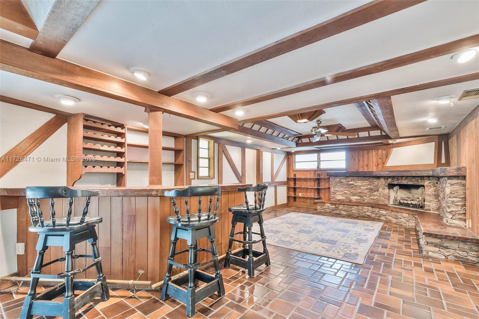 Beloved, spacious 5 bedroom/ 4.5 bath home in North Pinecrest, ready for your updates. Enter the formal living room with polished, original terrazzo floors and delightful view of the backyard from a wall of French doors. Grand formal dining room with china closet. Kitchen has eat in table, wood cabinetry and granite countertops, double wall oven and pantry. Charming family room with wet bar, beautiful stone fireplace. Split floorplan with 3 guest bedrooms, one ensuite, with walk in closets. Private, grand primary suite with large bath and walk in closet. 5th bedroom also ensuite w/ private entrance, perfect for in-laws or guests. 2 newer AC units. Laundry room and several storage closets. Expansive, screened pool and patio, 2 sheds.