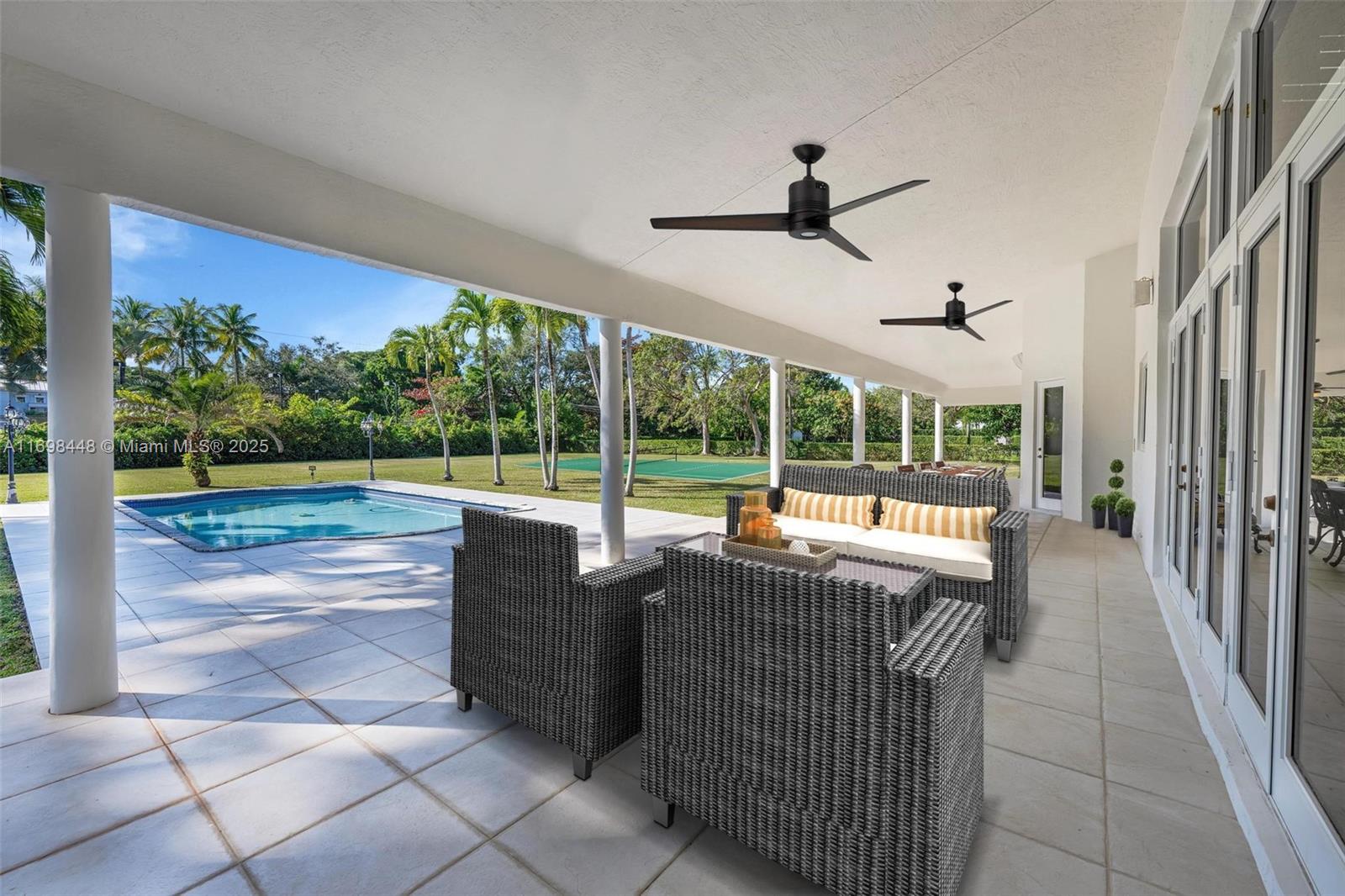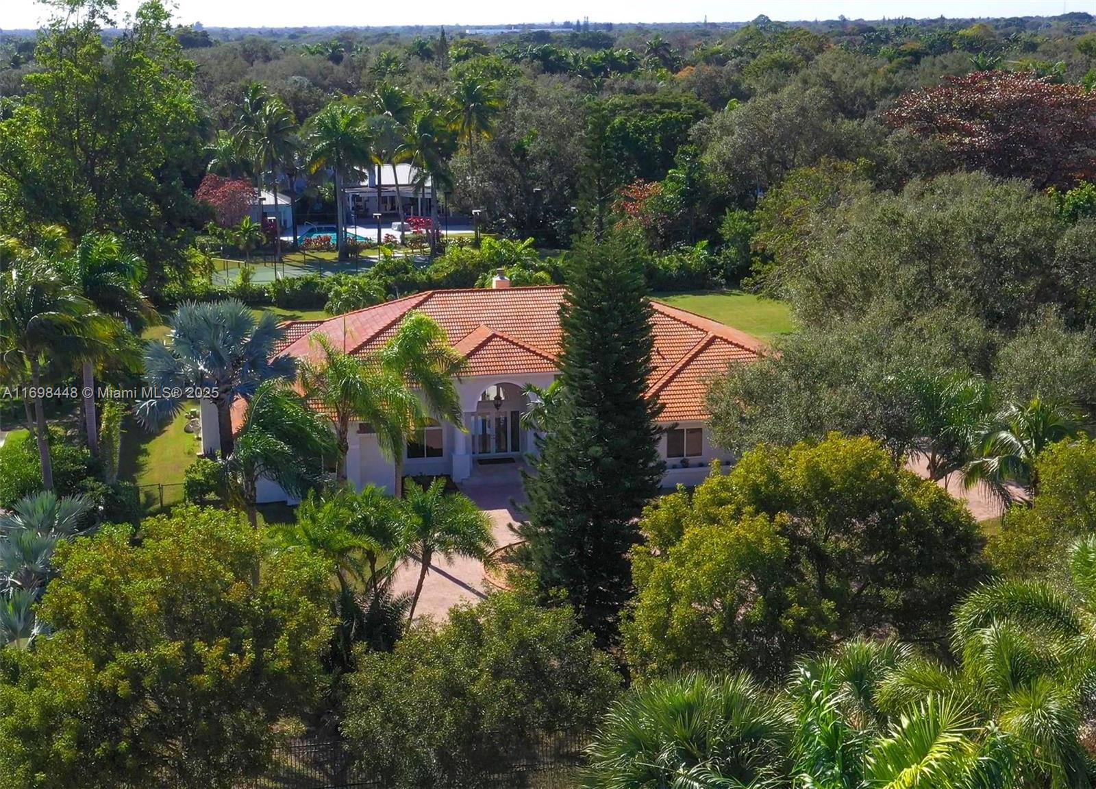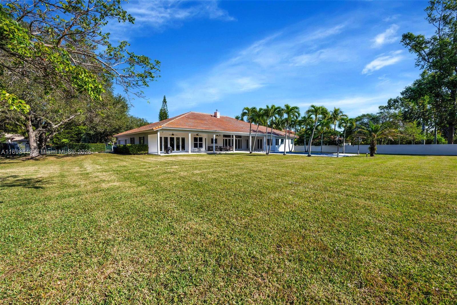 The perfect blend of space, privacy & prime location with this expansive 1.17-acre gated estate in one of Miami’s most sought-after neighborhoods. This Mediterranean-style 5-bedroom + den residence boasts 14-ft-high ceilings in common areas, impact windows throughout, & new HVAC units, ensuring comfort and durability. Designed for both elegance and recreation, the north/south-facing lot is planned to accommodate a tennis court or padel/pickleball, allowing all-day play. Generous driveway entry provides privacy, flexibility & ample room for parking, w/ a circular main driveway & separate parking area on the eastern exposure connecting to a three-car garage. With 5,011 interior SF, 7,036 total SF, & 15,395 SF of lawn space, this estate is primed to become your dream indoor/outdoor retreat.