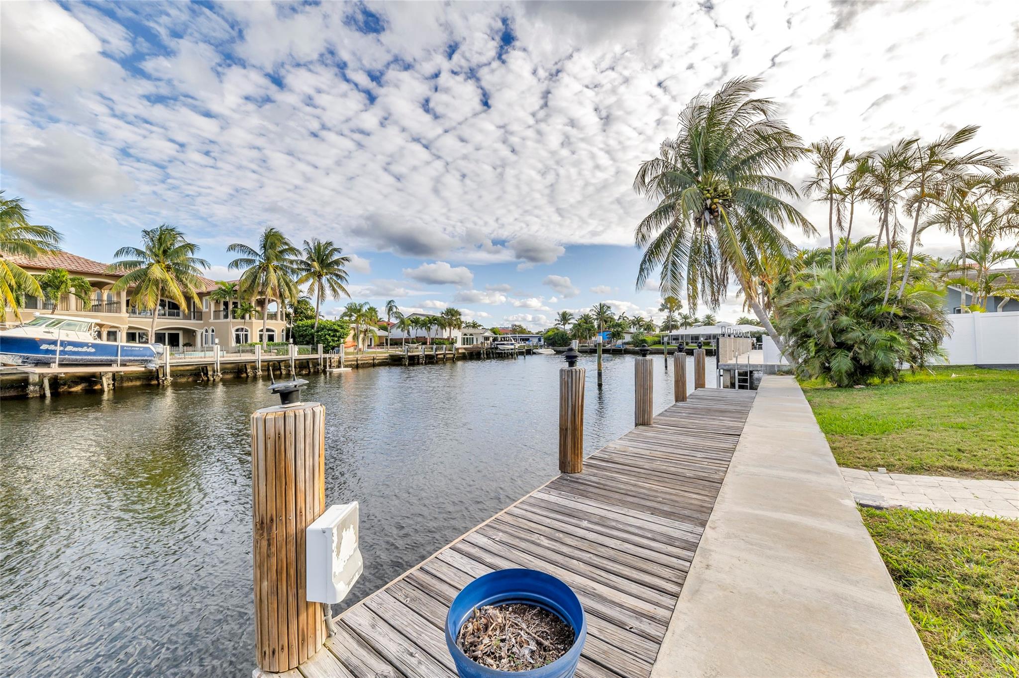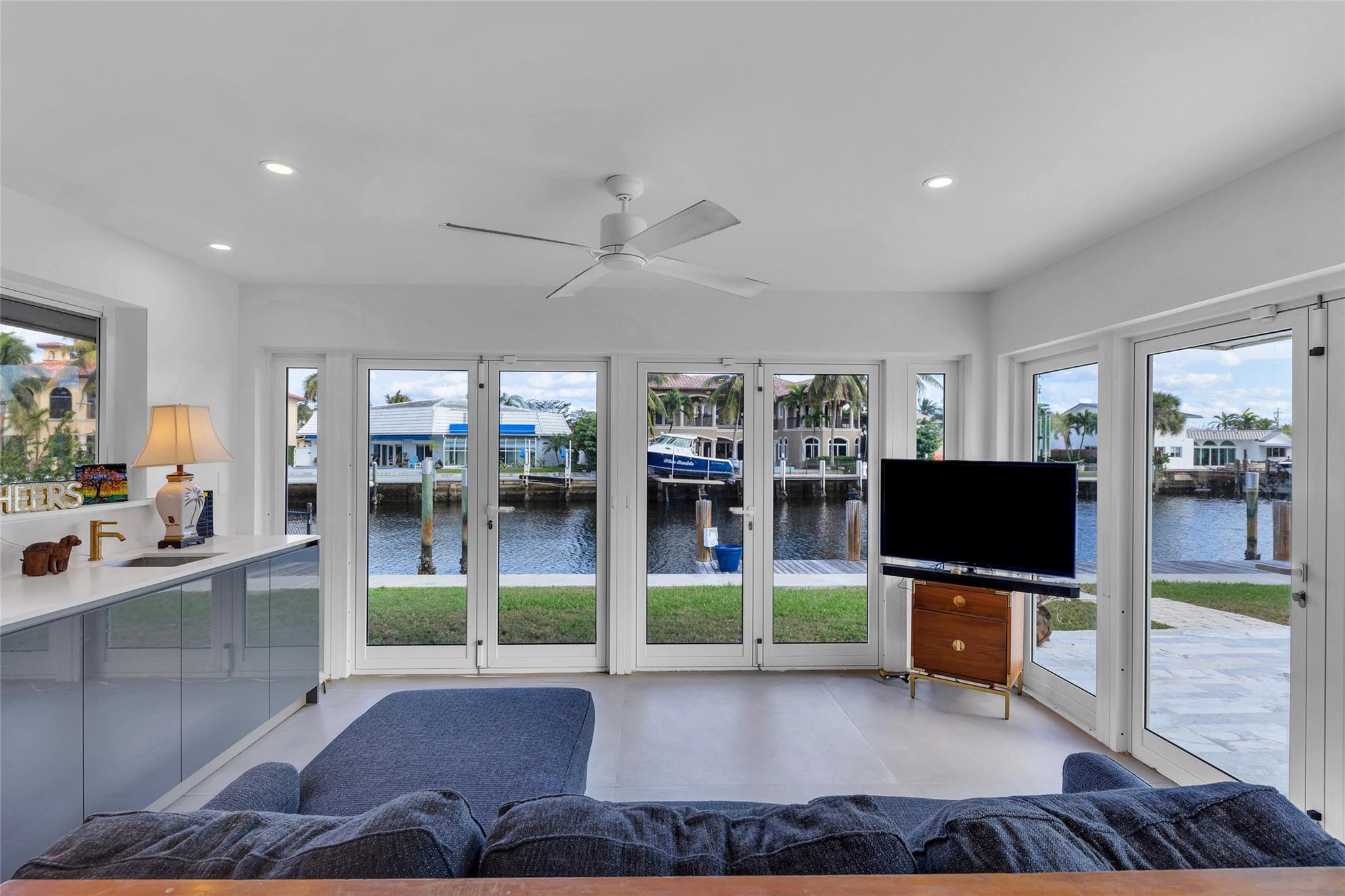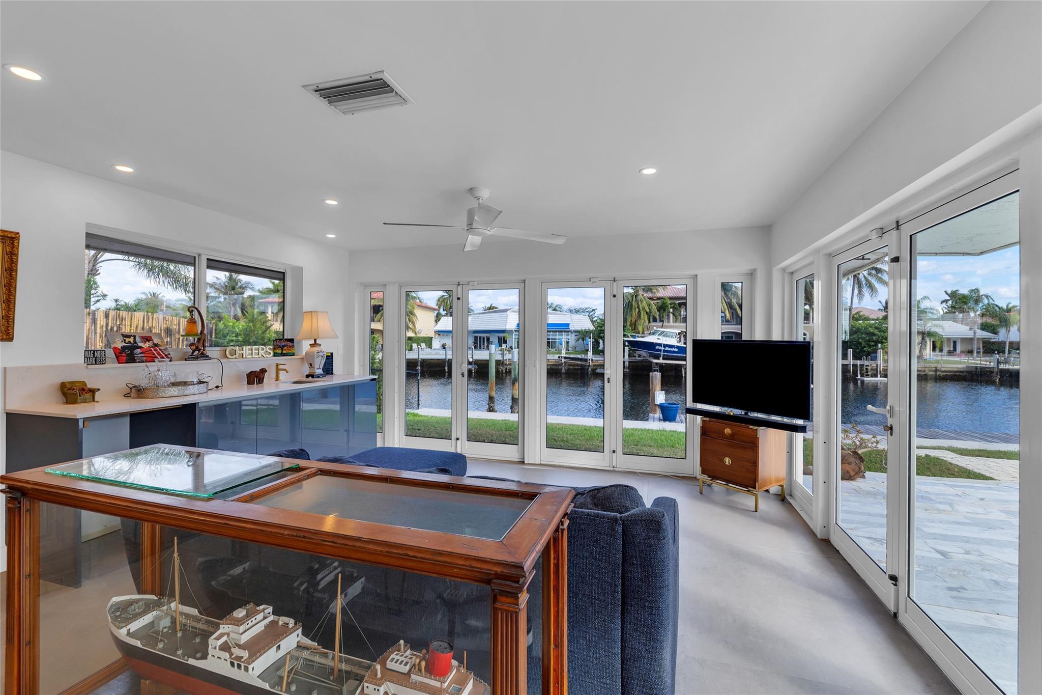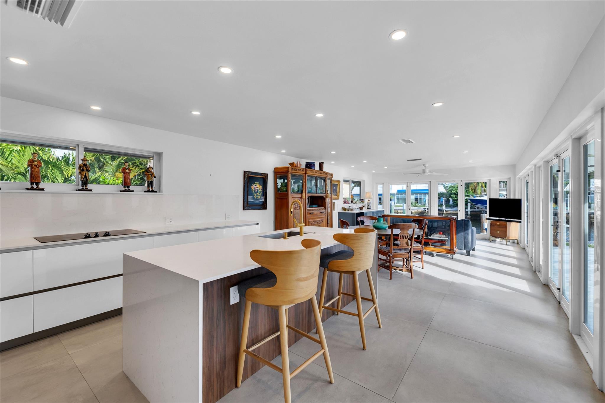 DEEP WATER ACCESS TO THE INTRACOASTAL WITH NO FIXED BRIDGES AND 85' ON THE WATER! Light and bright, with walls and walls of impact glass doors overlooking the pool, the dock and the waterway. Spacious and open, at over 2,400 sf, this elegant home offers three bedrooms and three full baths. New oversized tile flooring throughout, recessed lighting, newly appointed kitchen area with Italkraft cabinets, and water and pool views from virtually every room in the house. Some finishing touches needed to complete. Remarkable opportunity on a very special private canal called Bird's Bay, just around the waterway to the intracoastal! Outstaning wall of glass water views!