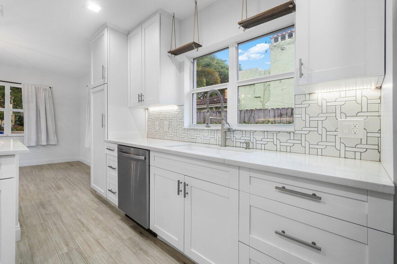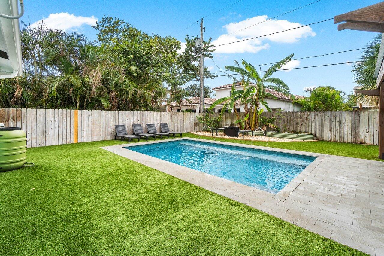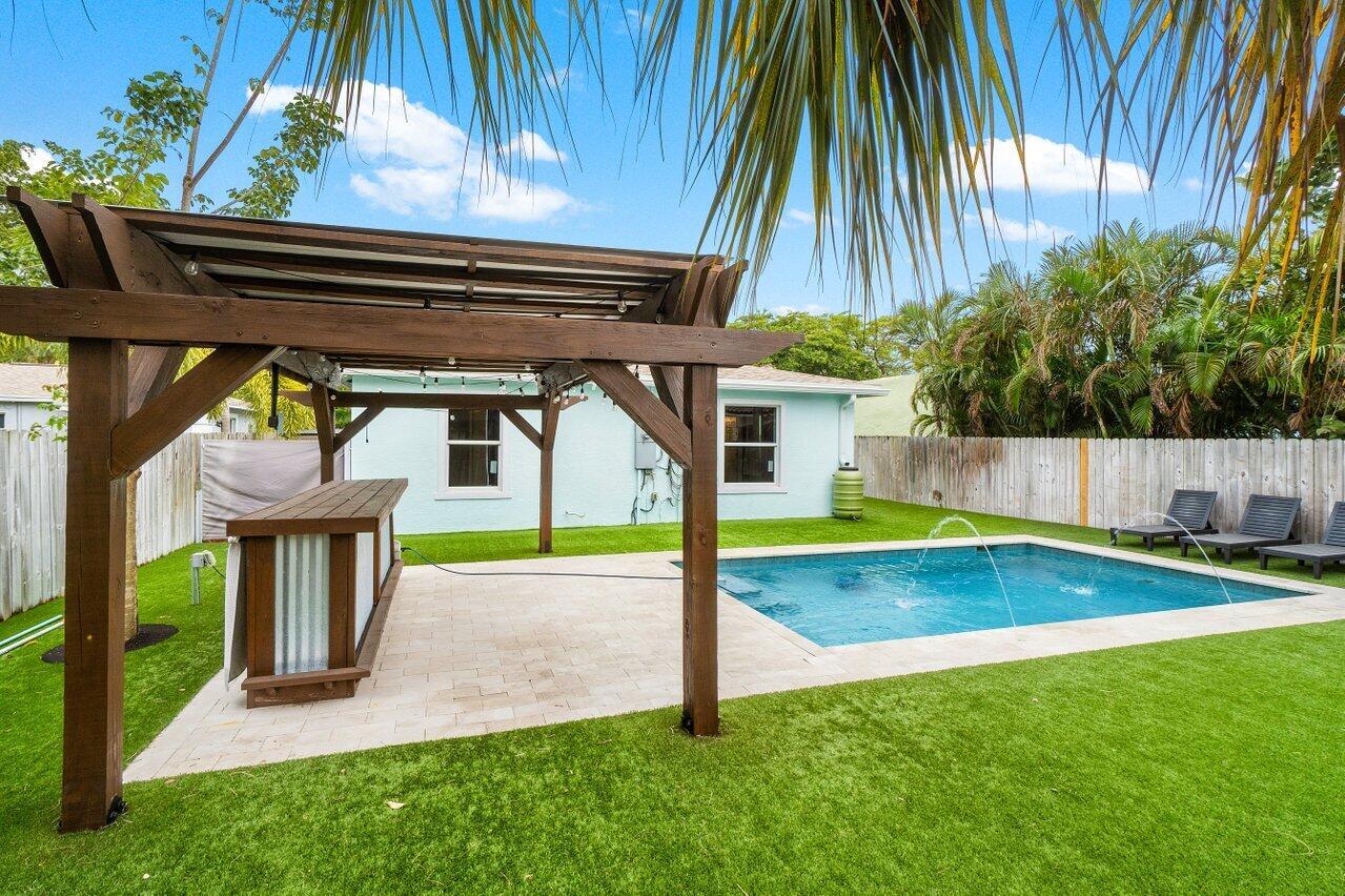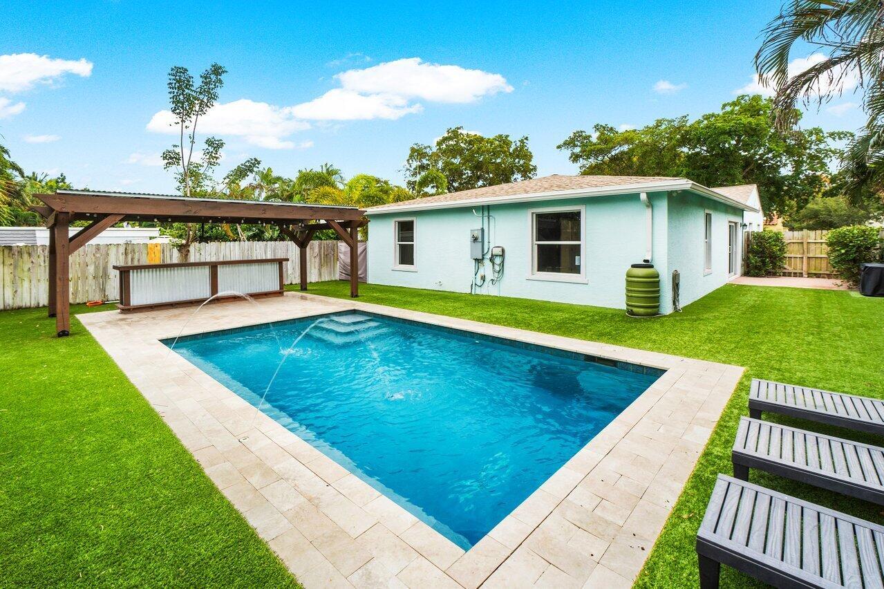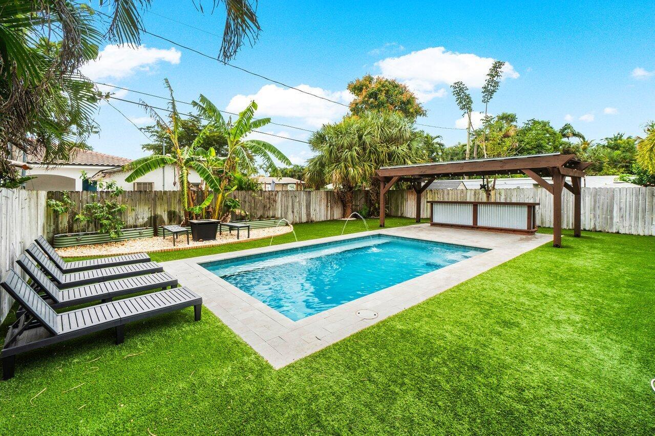 This Pineapple Park home is rare 2020 construction in a historic neighborhood walking distance from Grandview Market, the Kravis Center, Downtown West Palm Beach, and Howard Park. All windows and doors are hurricane impact, counters are white quartz, and floors are ceramic tile. The primary bedroom has built-in California closets. The backyard is fully turfed with a pool, marble deck, pergola, outdoor bar and entertaining area, electric hook ups, gas fire place, and planters. The front yard is xeriscaped with an agave and cactus garden for low outdoor maintenance and water usage. A rainbird irrigation system is in place with capped lines. Eco-friendly features like a rainwater collection system, composting unit, and EV car charger make this a unique modern home in a historic neighborhood.