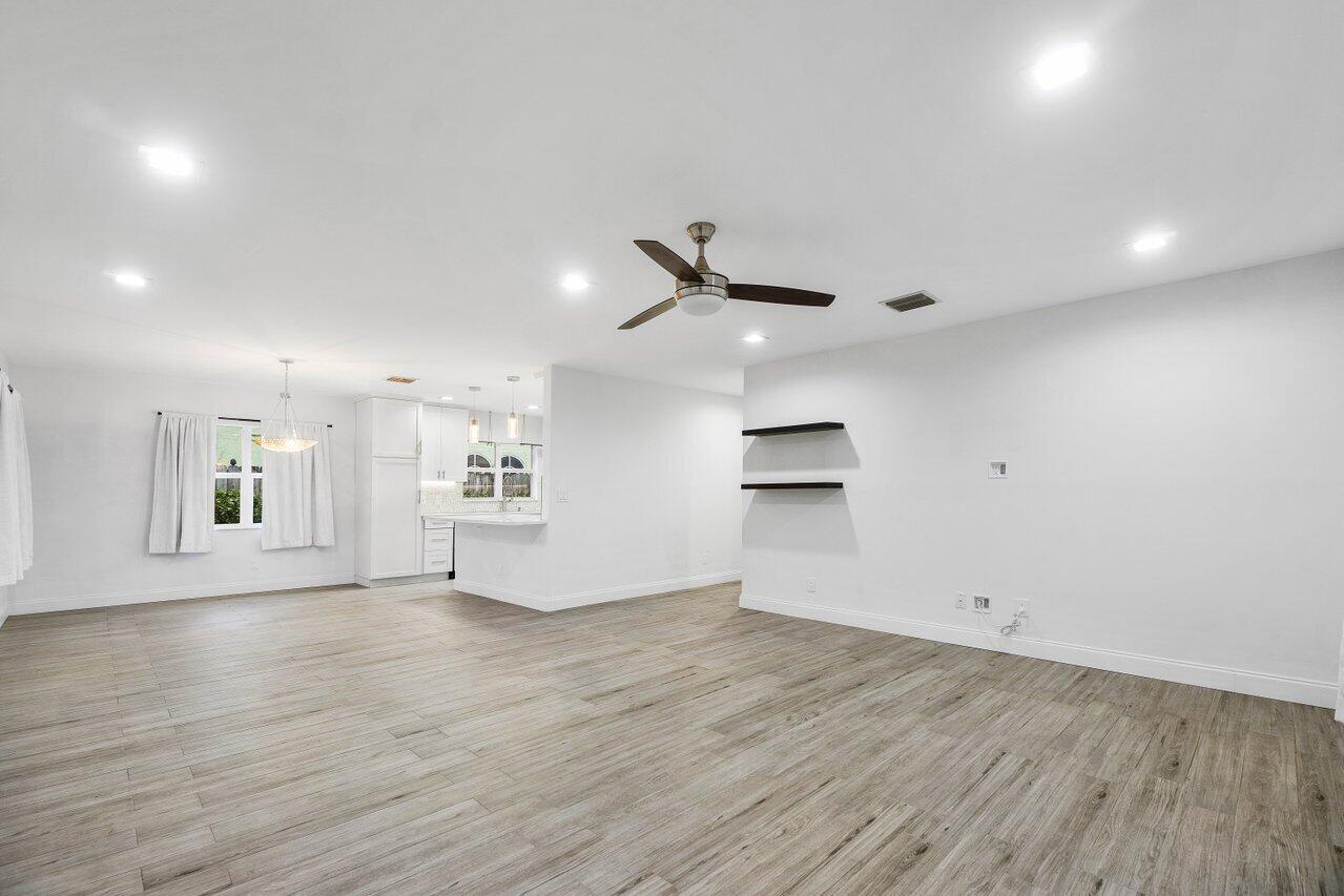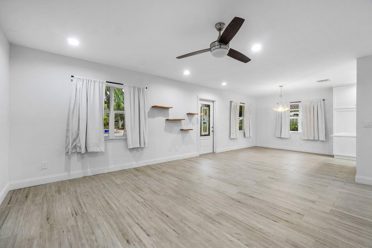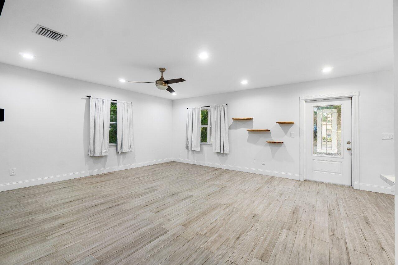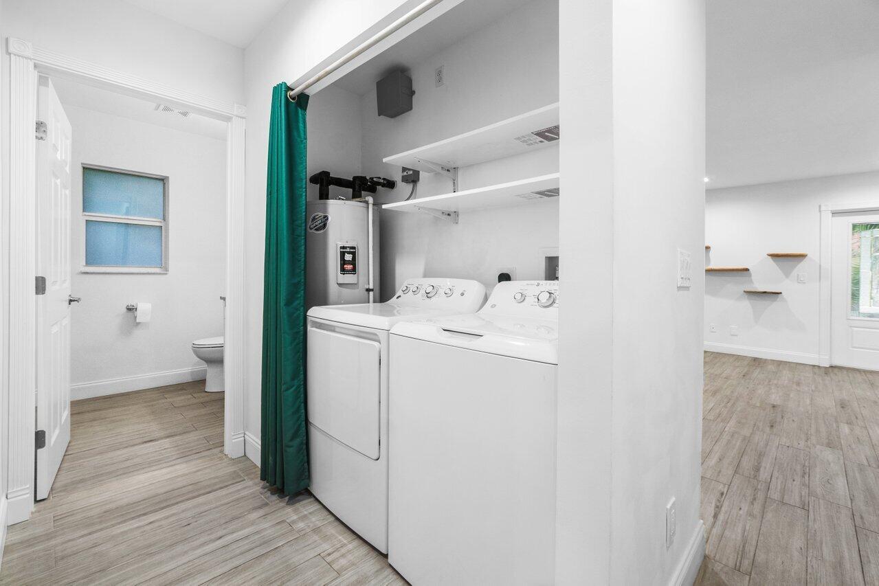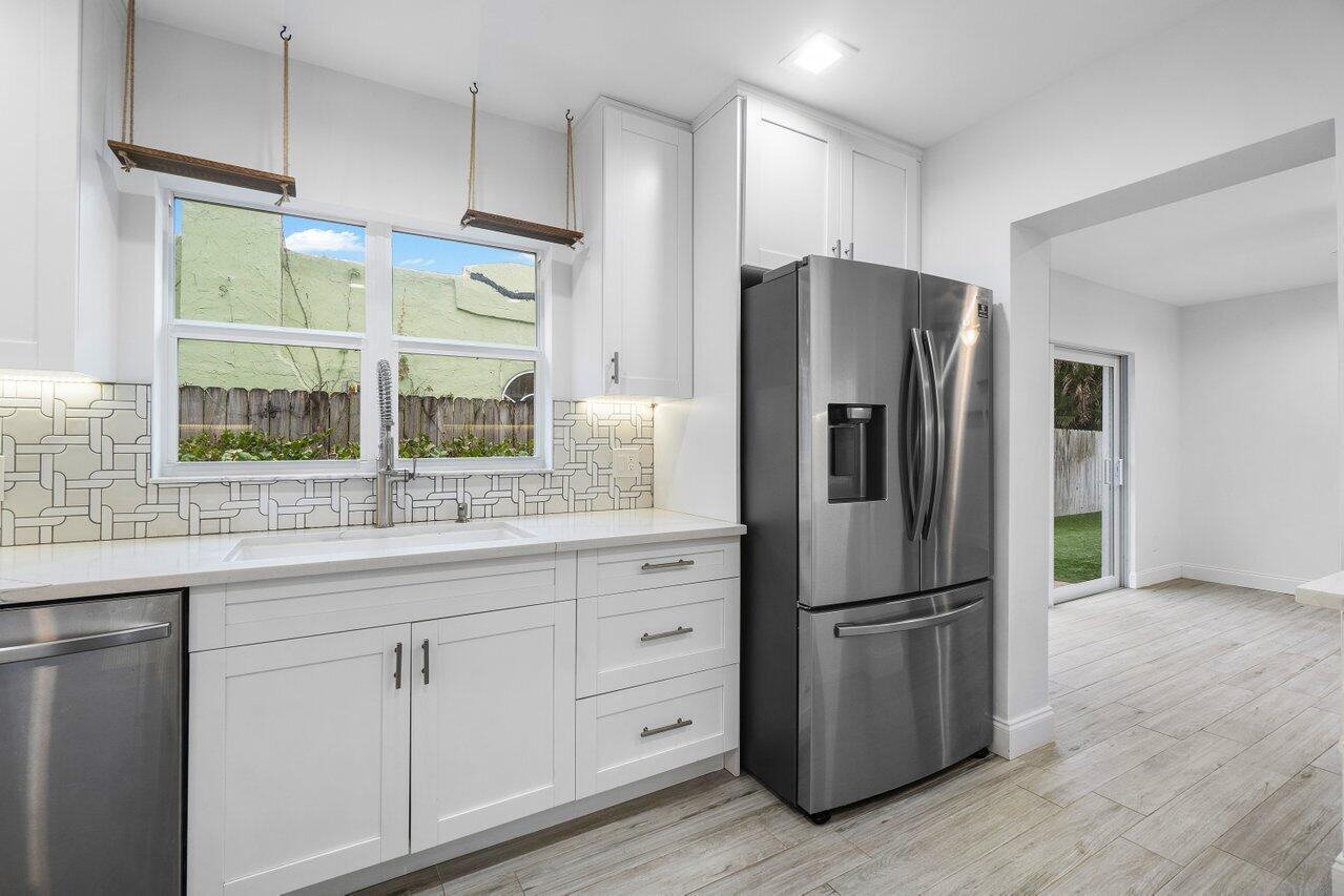 This Pineapple Park home is rare 2020 construction in a historic neighborhood walking distance from Grandview Market, the Kravis Center, Downtown West Palm Beach, and Howard Park. All windows and doors are hurricane impact, counters are white quartz, and floors are ceramic tile. The primary bedroom has built-in California closets. The backyard is fully turfed with a pool, marble deck, pergola, outdoor bar and entertaining area, electric hook ups, gas fire place, and planters. The front yard is xeriscaped with an agave and cactus garden for low outdoor maintenance and water usage. A rainbird irrigation system is in place with capped lines. Eco-friendly features like a rainwater collection system, composting unit, and EV car charger make this a unique modern home in a historic neighborhood.