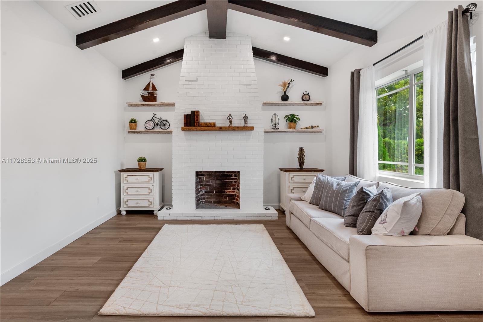 Discover modern elegance in this 3-bedroom, 2.5-bath Miami Shores home. The living room features vaulted ceilings, exposed wooden beams, a white brick fireplace, and abundant natural light. The open-concept kitchen shines with dark cabinetry, a butcher-block countertop, stainless steel appliances, and a custom wine display. Spacious bedrooms include custom closets, and the bathrooms offer stylish finishes and functionality. With a seamless blend of charm and sophistication, this home is perfect for both relaxing and entertaining in a prime location.