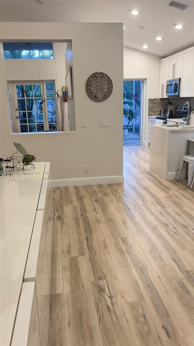 Nestled in the serene Weston, FL, this stunning home blends relaxation and vibrant living It features a renovated kitchen with sleek white cabinetry, quartz countertops, stainless steel appliances, modern light fixtures and vaulted ceilings. The spacious master suite offers abundant natural light, wood-look flooring, and a private ensuite bath. The open living area boasts neutral tones, recessed lighting, and seamless flow for entertaining or relaxing. A screened patio provides a tranquil retreat surrounded by greenery, perfect for year-round enjoyment. With top-rated schools, lush parks, well-maintained green spaces, diverse extracurricular activities and easy access to highways, shopping, beaches and nightlife, this home offers an unmatched lifestyle in a vibrant and welcoming community.