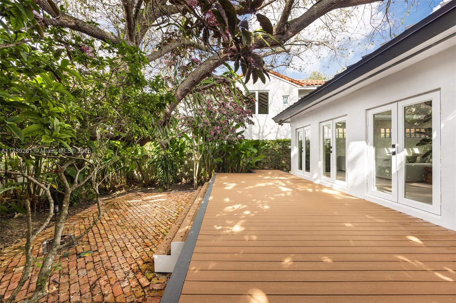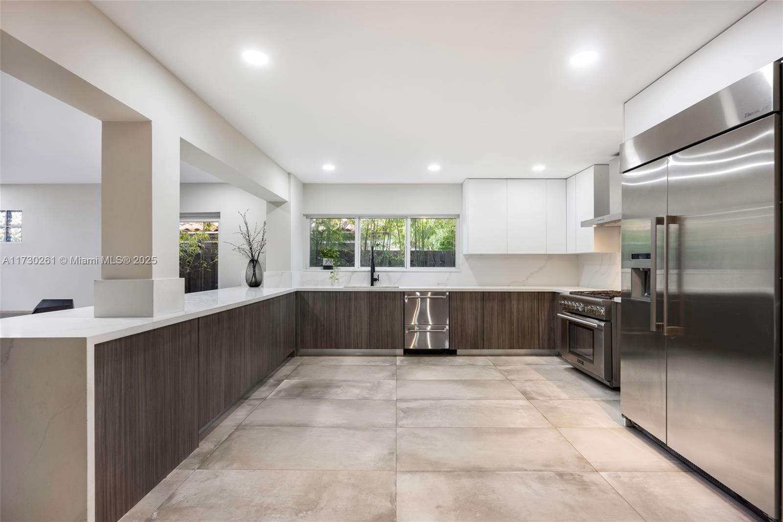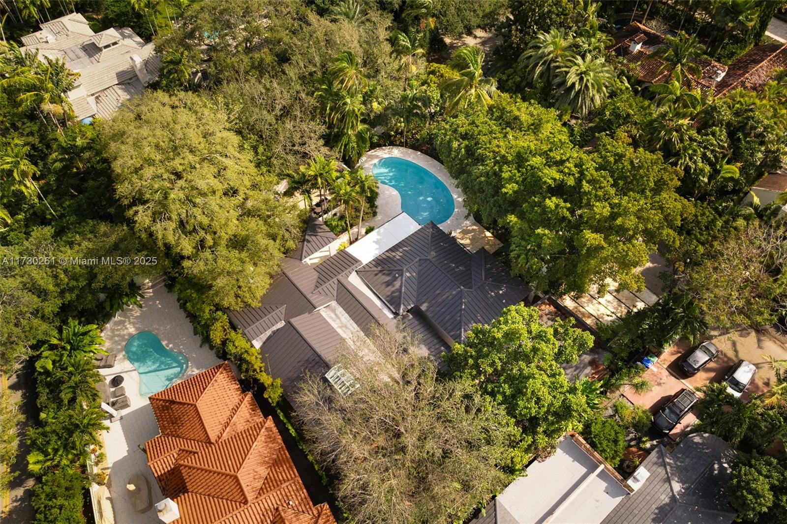 Stunning, modern-style estate in the coveted South Grove neighborhood known as "Utopia". This unique home is surrounded by a majestic tree canopy, lush tropical gardens and is fully walled & gated for the ultimate in privacy. Striking, open-air entryway leads into expansive, light-filled living spaces w/ coral rock fireplace, porcelain tile flooring & vaulted, wood-beamed ceilings. Sleek, European-style kitchen and spa-like bathrooms feature high-end fixtures & finishes. French doors in the large family room open to captivating outdoor spaces w/a covered terrace & wood deck overlooking the tranquil pool. High sea-level elevation (not a flood zone). Whole-house generator. Walk or bike to top tier schools, bayfront parks & marinas and to the Grove village’s galleries, boutiques & cafes.