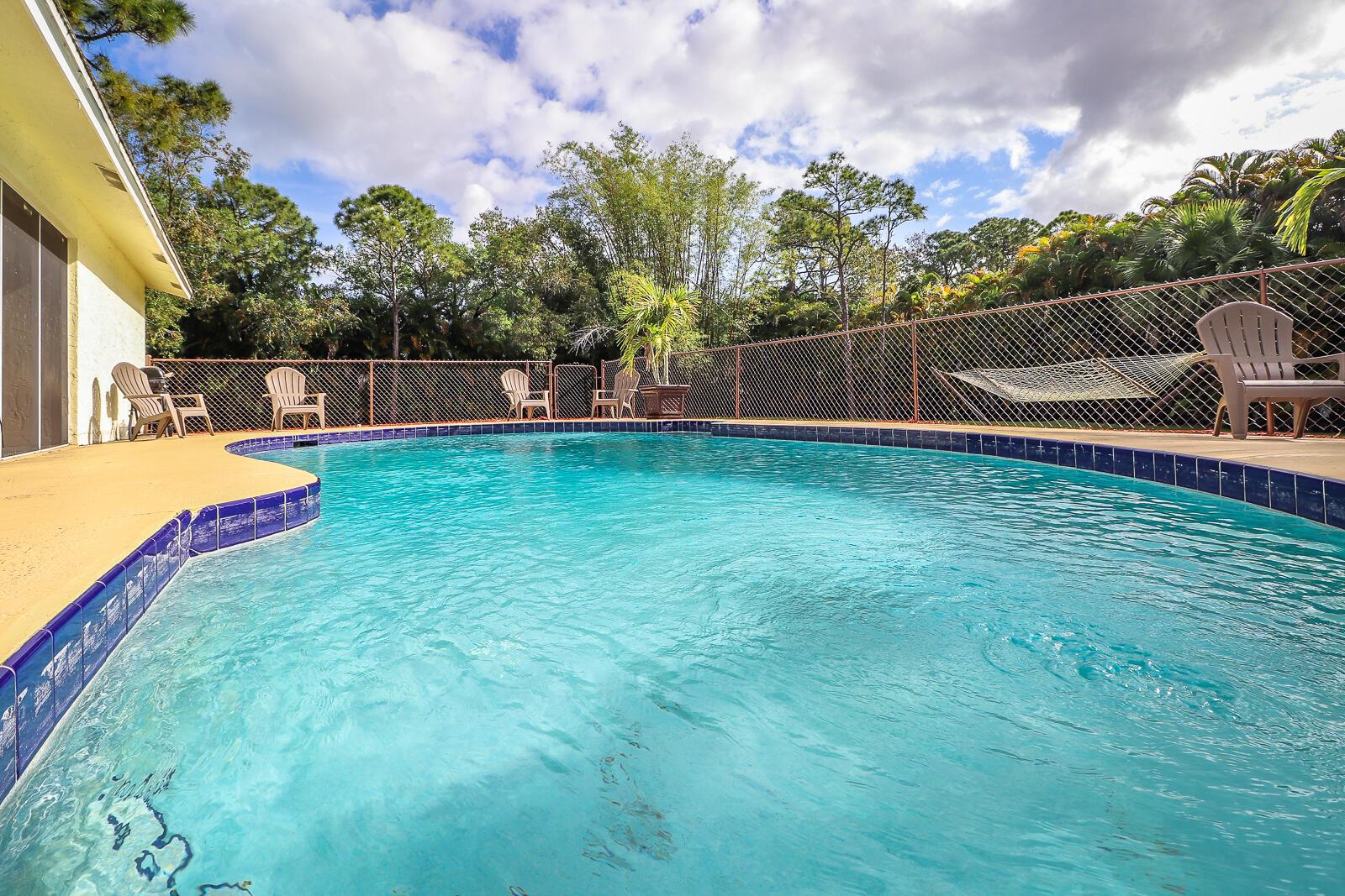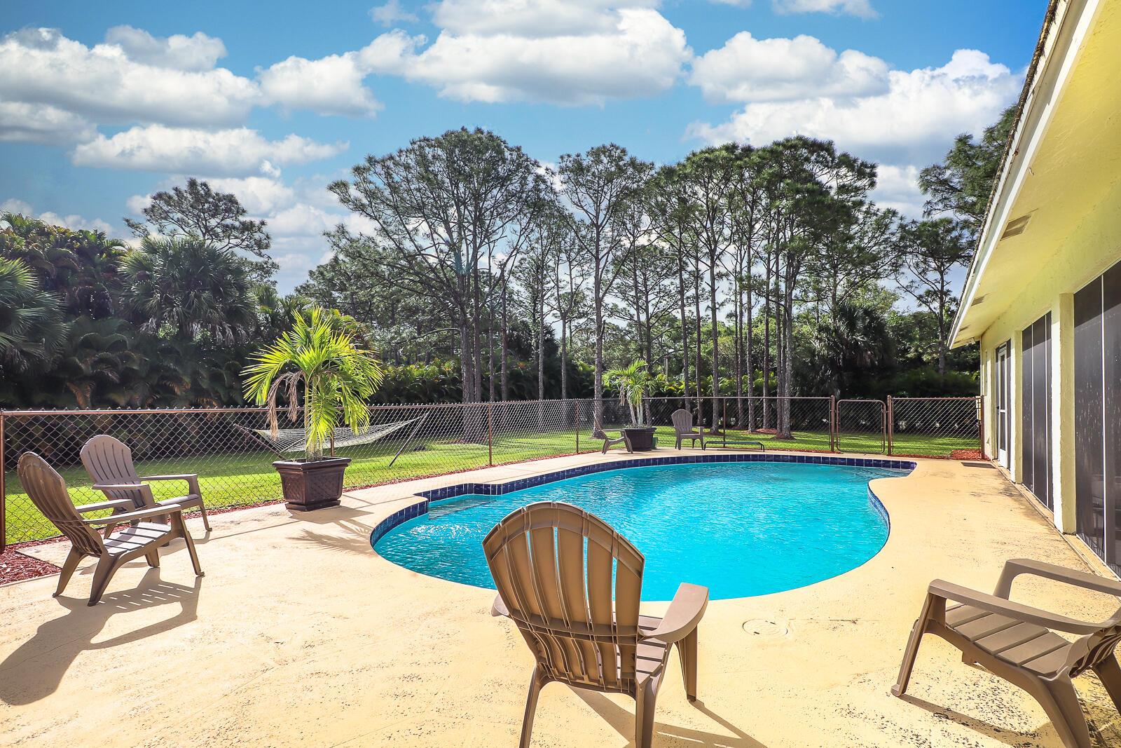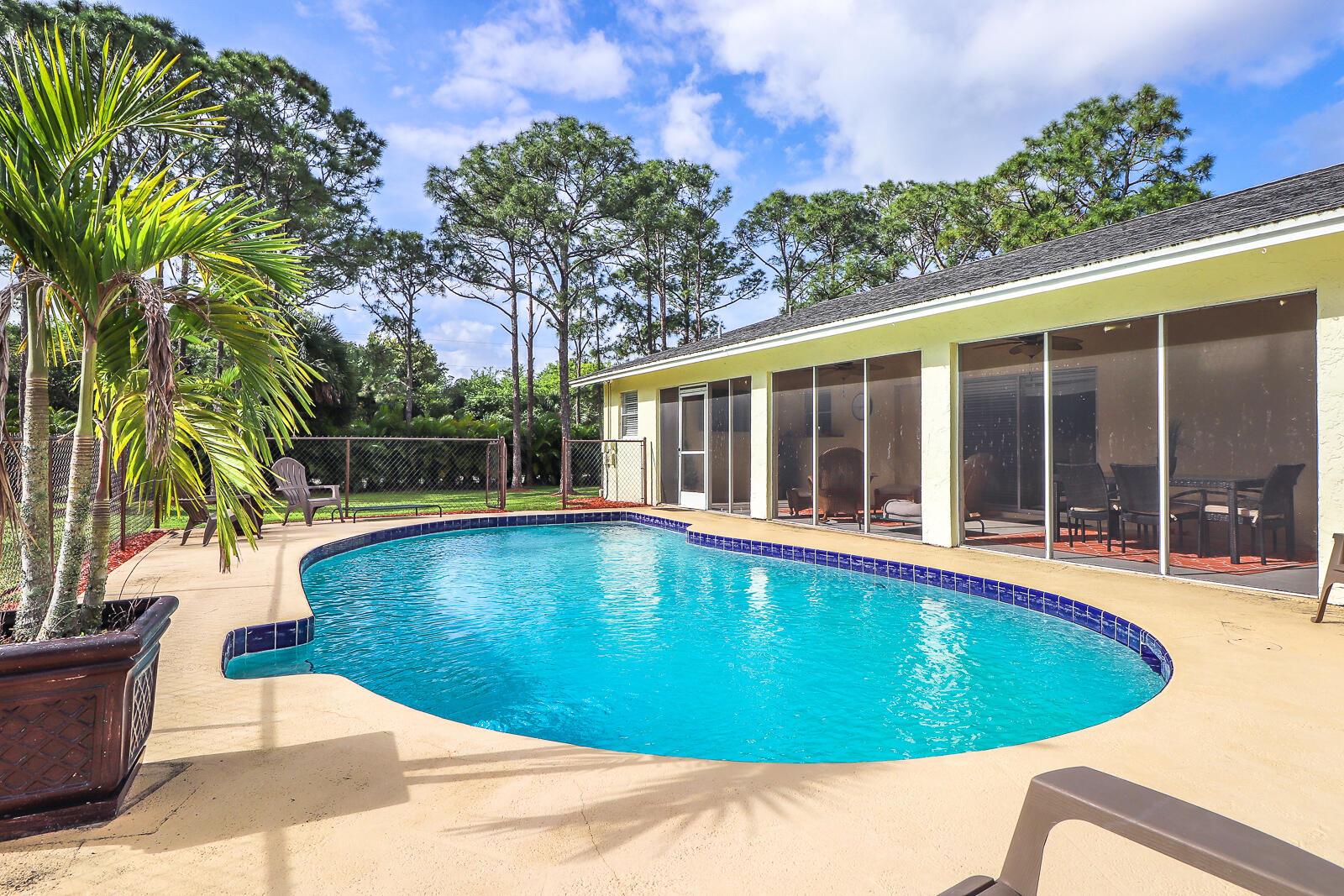 Immaculate CBS 3 bedroom/2 bath/2-car garage home in PB Country Estates. Beautiful pool. Nicely-landscaped 1.16-acre corner lot. Updated throughout - including newly-remodeled master bathroom and cabana bath. Open kitchen features stainless steel appliances, French-door refrigerator, dual-over range, granite countertops, and center island. The screened porch overlooks the beautiful fenced pool area and spacious backyard. Newer A/C. Smart toilets in the bathrooms. This home is hooked-up to city water and located on the corner of a paved road (150th) close to the front section of the subdivision for easy access to area amenities including Alton Town Center, Abacoa, and area beaches. If the lot was vacant the price would be $725,000. ONLY CBS POOL HOME UNDER $1 million on pavement
