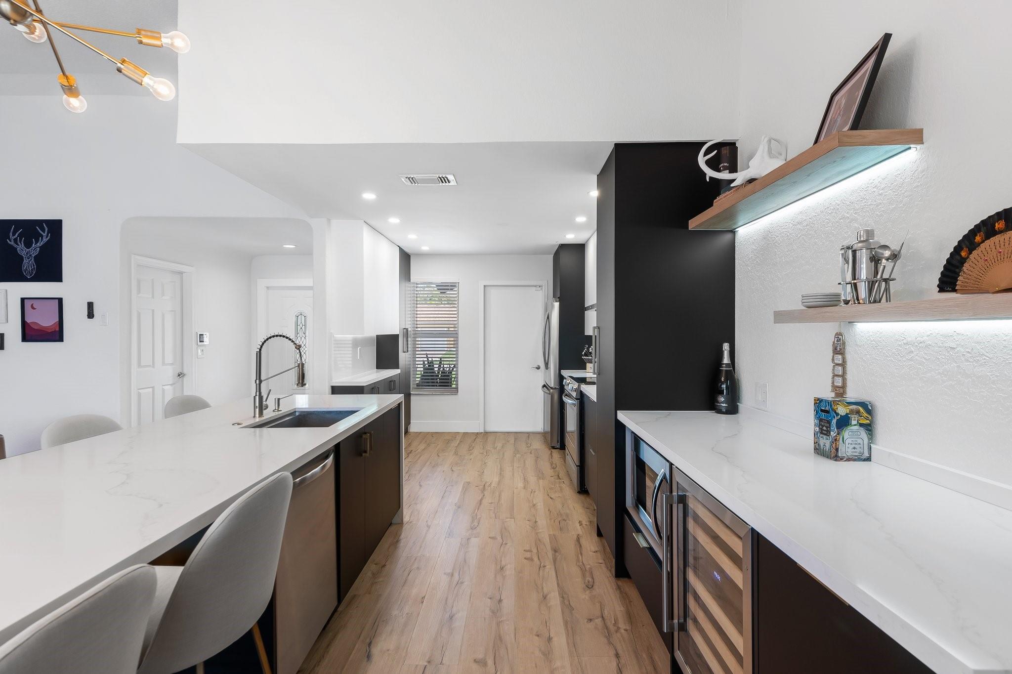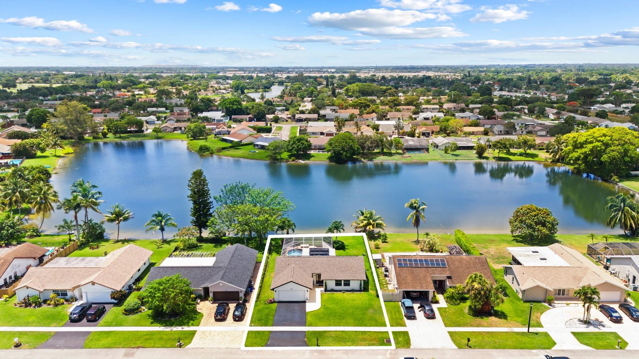 Welcome to your dream pool home! This beautifully updated 4 bedroom/2 bath single-family residence offers breathtaking lakefront views & the ultimate in modern living. Every inch of this home has been meticulously renovated, blending style, comfort, & luxury. Features/Finishes: Gourmet chef's kitchen w/ custom cabinetry, expansive island, quartz counters, stainless appliances; wood look waterproof vinyl plank flooring throughout, split bedroom floorplan, primary suite with dual sink vanity, walk in closet; screened freeform pool, 2022 Roof, 2022 Water Heater, 2015 AC, Solar Panel lease to transfer to buyer. Nestled in the sought-after community of Southwind Lakes, close to shopping, dining, major highways, golf & parks. 4th bedroom currently utilized as an office & does not have closet.