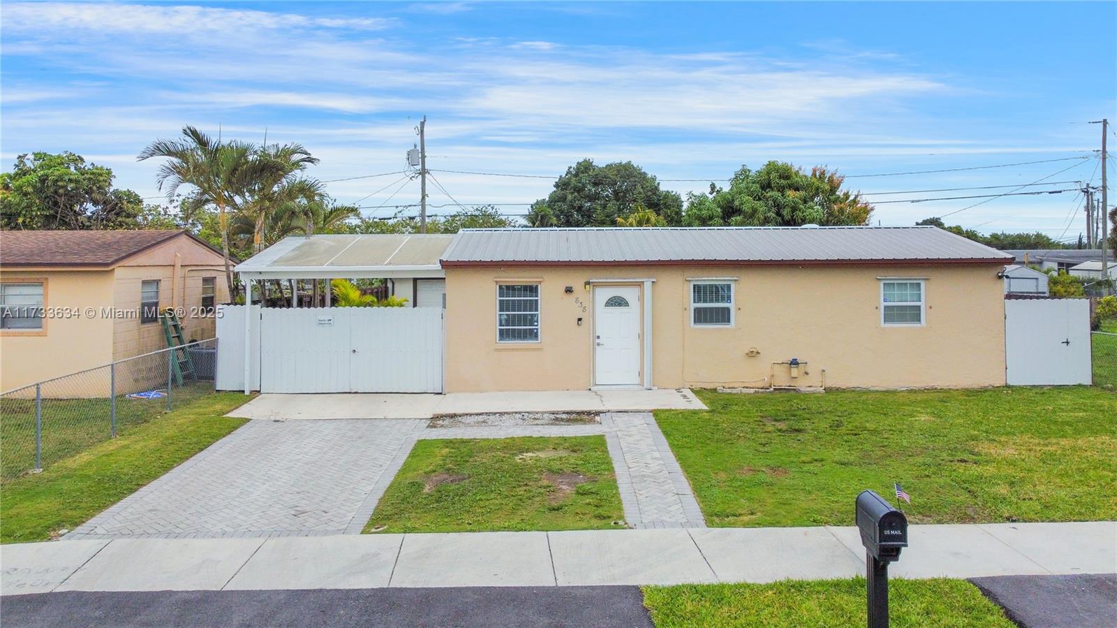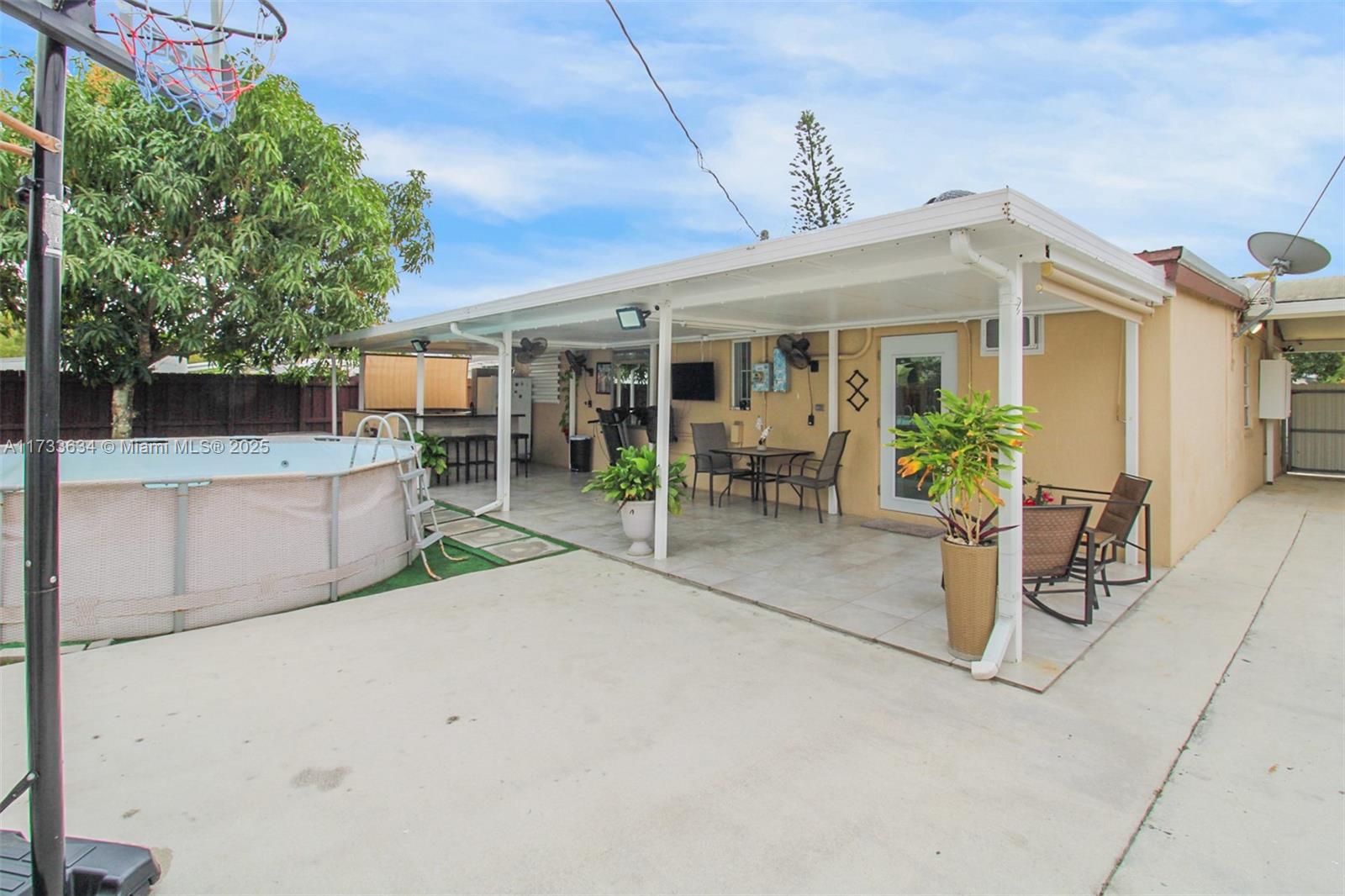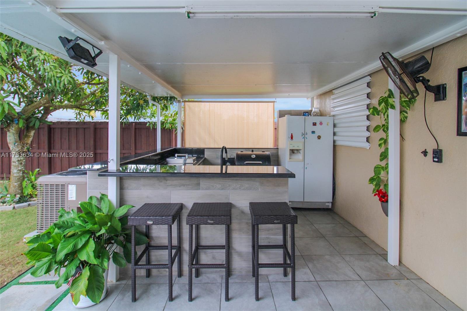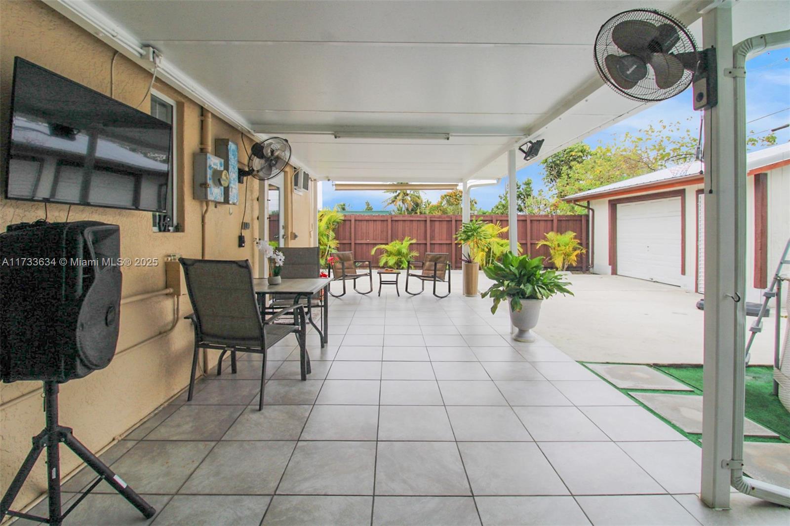 This charming property offers a unique blend of living and income potential. Total of 3 bed. 2.5 Bath. The split plans is designed with 2 bedrooms and 1 bathroom towards front of home & the 3rd room has outmost privacy to be used as studio apartment with its own private entrance, complete with private bathroom and walk in shower. Ideal space for guests or extended family. generating rental income. Relax and entertain under the covered patio featuring a built-in summer kitchen, ideal for outdoor gatherings. There's convenient side entry covered parking for your RV or boat . The property also includes a detached garage with half bathroom and laundry room.