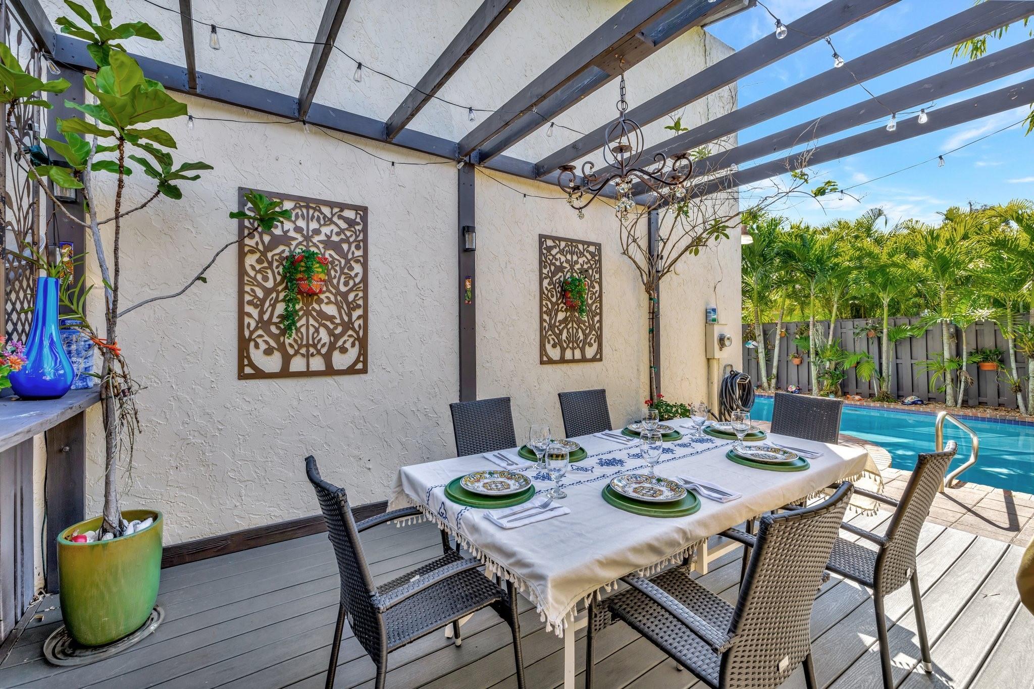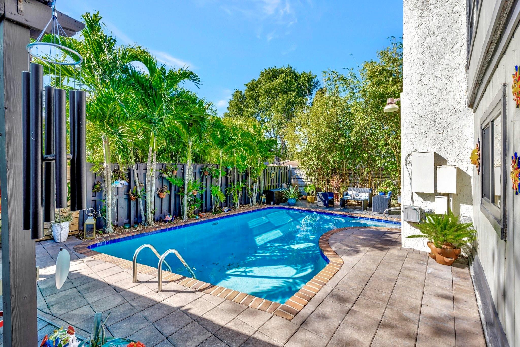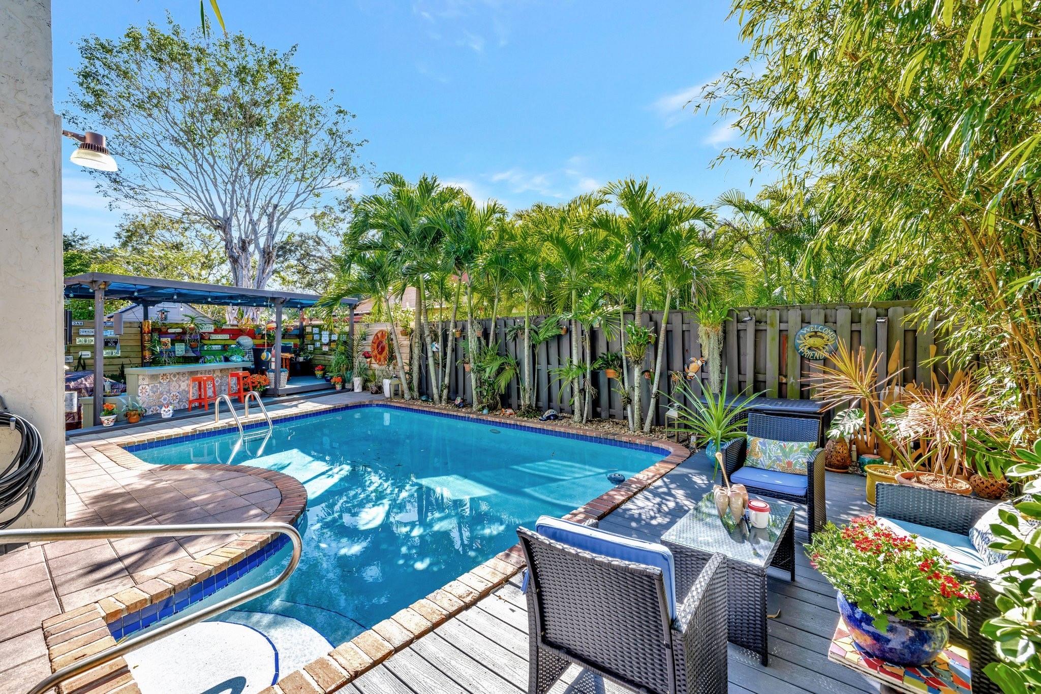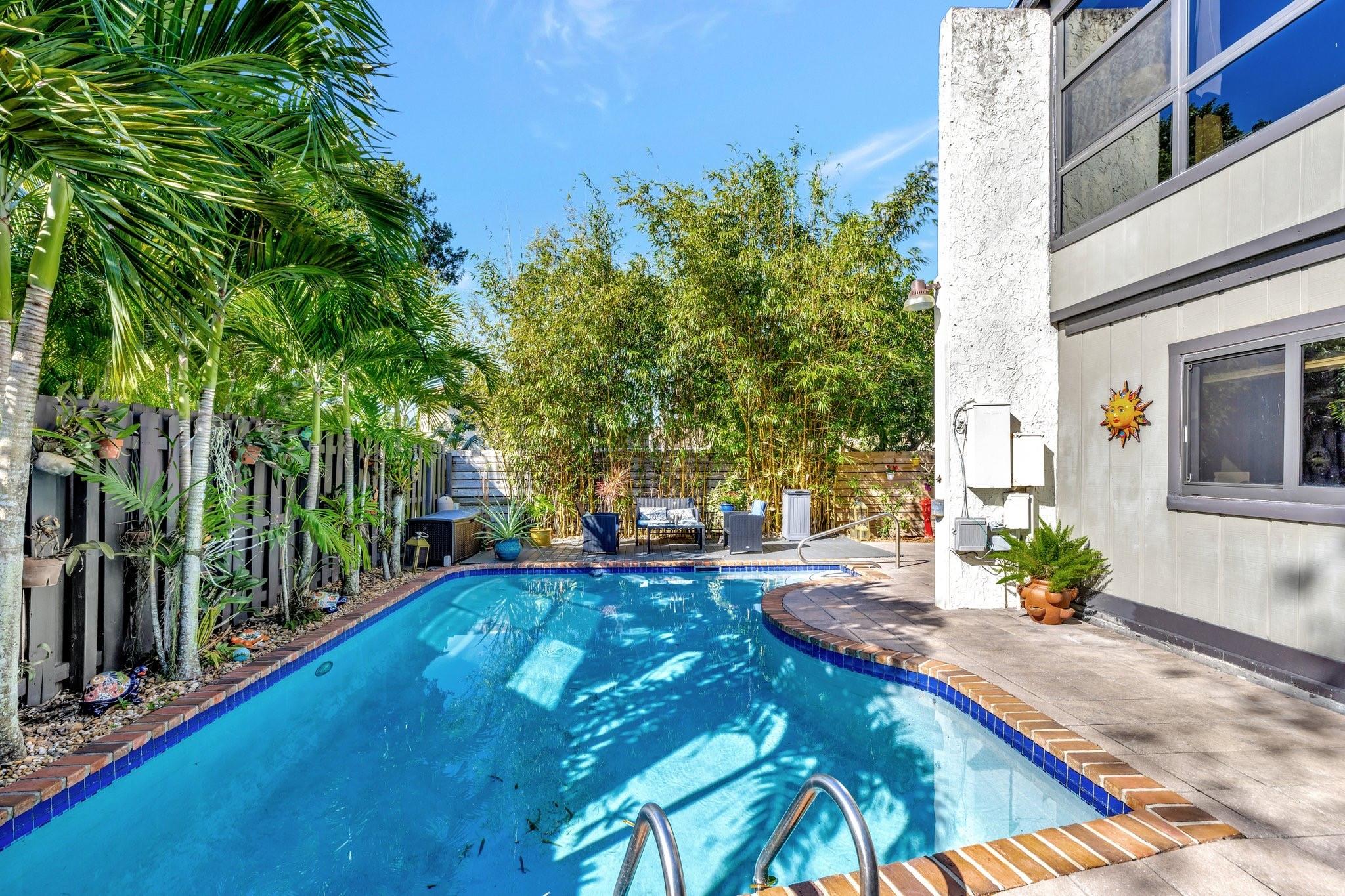 Welcome to Your Private Paradise Resort! This corner townhome is an entertainer’s dream! Move-in ready with modern updates, fresh paint, and stylish finishes, this home offers effortless comfort from day 1. The contemporary kitchen features beautiful quartz countertops, impressive custom cabinets, and stainless appliances. Soaring cedar ceilings invite relaxation in the living area overlooking the pool. The primary suite upstairs offers privacy. 2 bdrms downstairs for family or guests. Secured with impact windows & doors. Florida room is 3rd bedroom/office, plus loft for 4th room or study. Relax in your private pool, enjoy outdoor dining, and entertain at the summer kitchen/bar, all surrounded by a lush garden with a shed for extra storage. Very low HOA —schedule your tour today!
