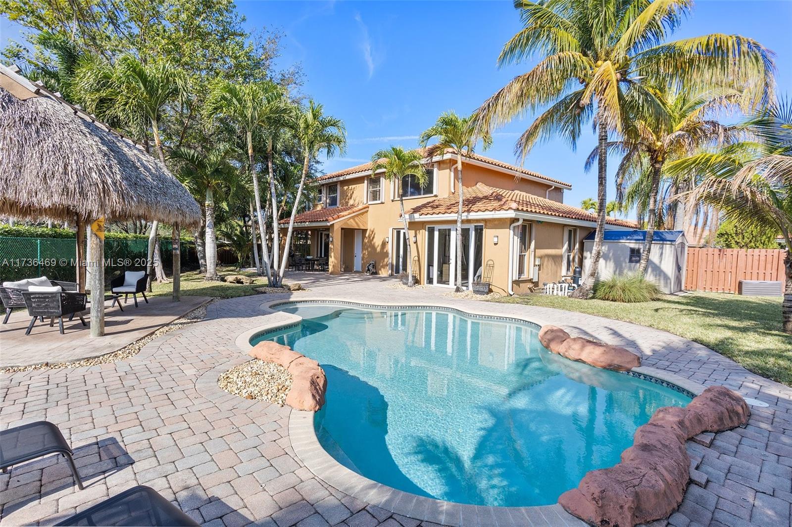 Welcome to your dream home in the sought-after Encantada gated community. One of the largest lots in the neighborhood. Owner has invested in substantial upgrades into making this home a modern oasis with luxury features . The kitchen is a chef’s delight w/ top-of-the-line appliances, amazing pantry w/ custom shelving and separate laundry room. The primary bedroom suite is conveniently located on the ground floor, complete w/ 2 large closets and a luxurious bathroom. Upstairs offers 4 beds and 2 full baths and a loft area. Outside, your private resort-style backyard awaits. Featuring a tiki hut w/ a new roof, an inground saltwater pool, and an oversized patio, fire pit and a BBQ area, brand-new roof, gutters, exterior paint, and landscaping updated in 2021. Own a piece of paradise!!