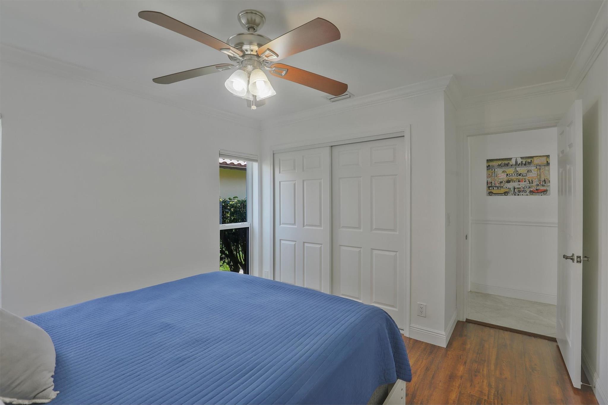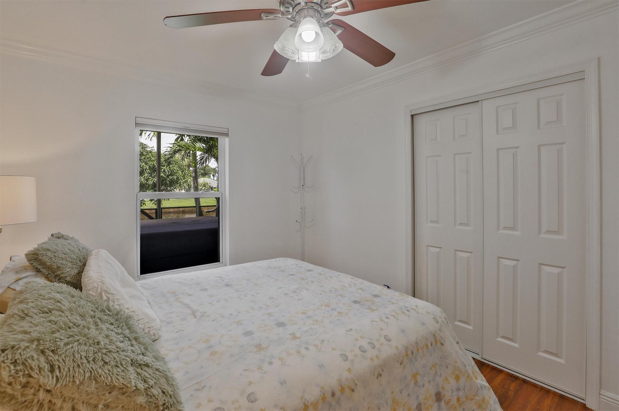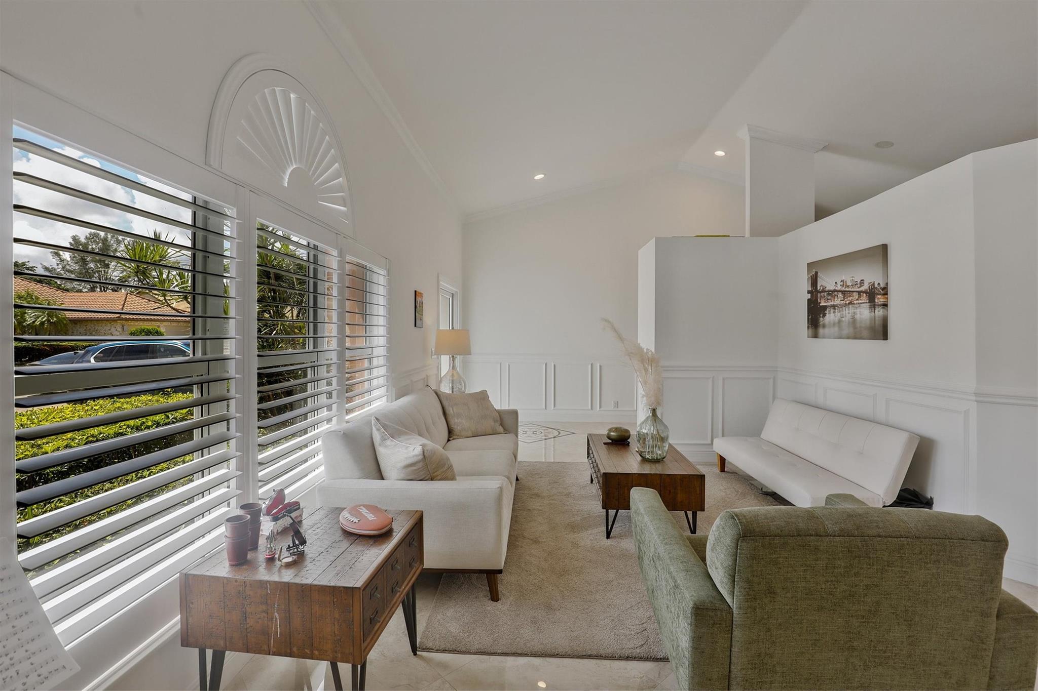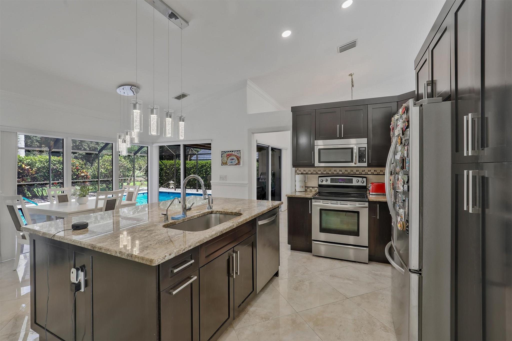 Beautifully updated home in a desirable Golf course community with No mandatory membership. Renovated kitchen includes an island which maximize the home's cooking space, granite countertops, and stainless steel appliances. Split bedroom floor plan with 4 bedrooms & 2 bathrooms. An extra family room next to the kitchen. Dining room plus an eat-in kitchen area. A separate laundry room with tub. Impacted windows & doors. Impacted Garage Door. Screened patio with travertine pool deck and golf course & canal water view. Heated pool with salt system. Solar panels. Pavers driveway. Mango tree. Low HOA fees cover guarded gate, internet, & cable. A-rated schools. Convenience location.