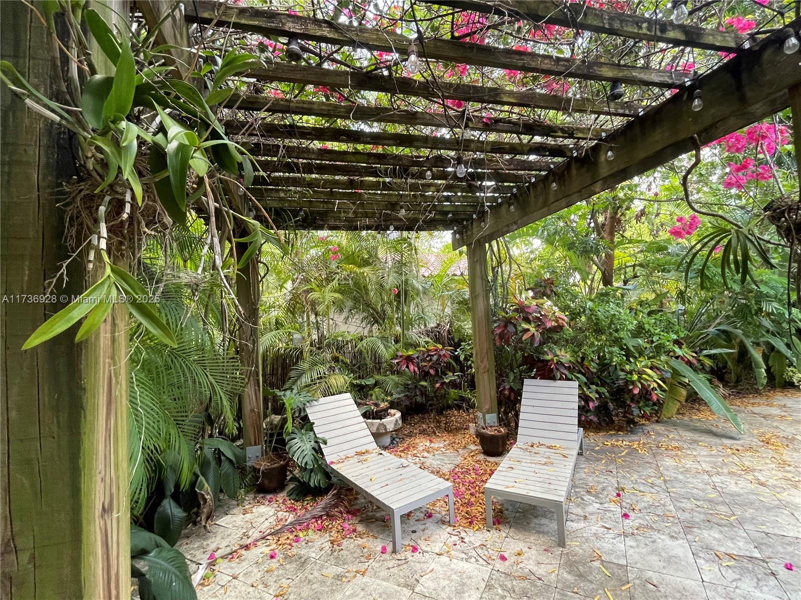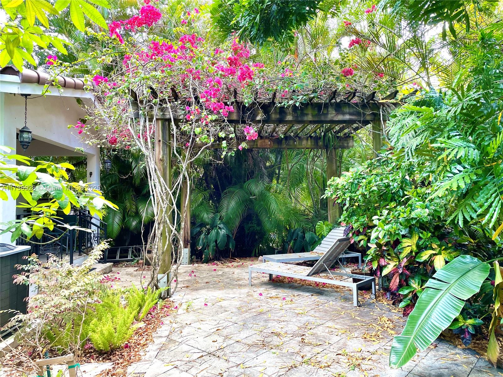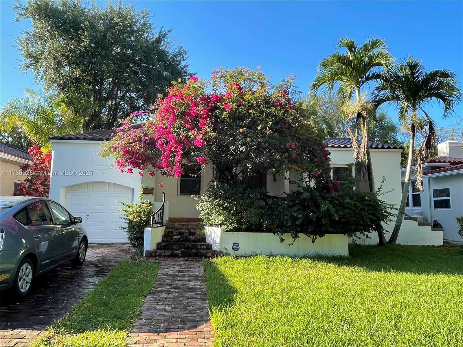 Step through this charming bougainvillea-draped entry and instantly feel transported to a lush retreat. This classic Mediterranean-inspired home boasts timeless curb appeal with its white stucco exterior and barrel-tile roof. While inside you’ll discover a bright, open-concept living space perfect for entertaining. The updated kitchen features granite counter tops, warm wood cabinetry, and a convenient pass-through to the dining area—ideal for hosting lively gatherings. Large windows flood the interior with natural light and offer tranquil views of the lush foliage outside. Outside, where a pergola-shaded patio invites you to dine alfresco surrounded by tropical greenery. Whether you’re lounging in the garden or with friends and family, this home delivers the ultimate Florida lifestyle.